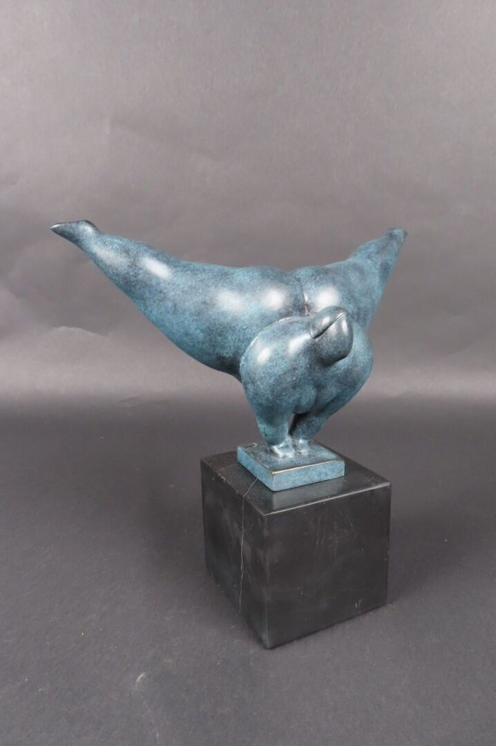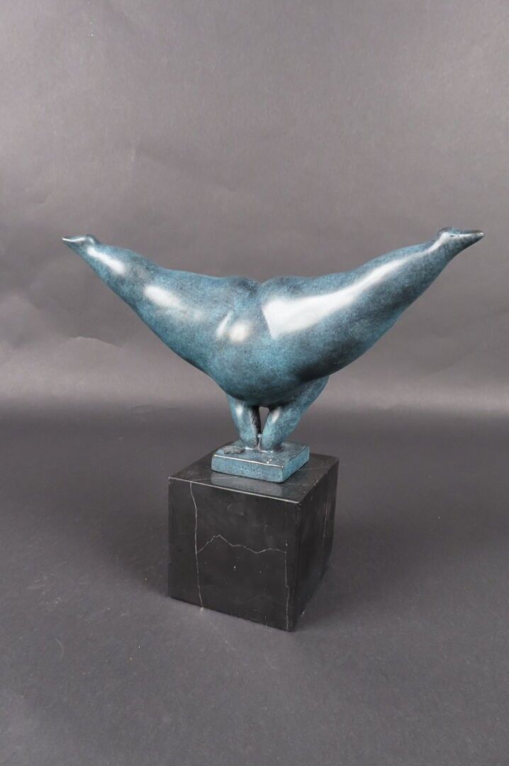 MILO (XXe). "Danseuse faisant l'équilibre", sujet en bronze à patine bleue nuancée, socle carré en marbre noir, signé, cachet de fondeur (H : 22 cm)