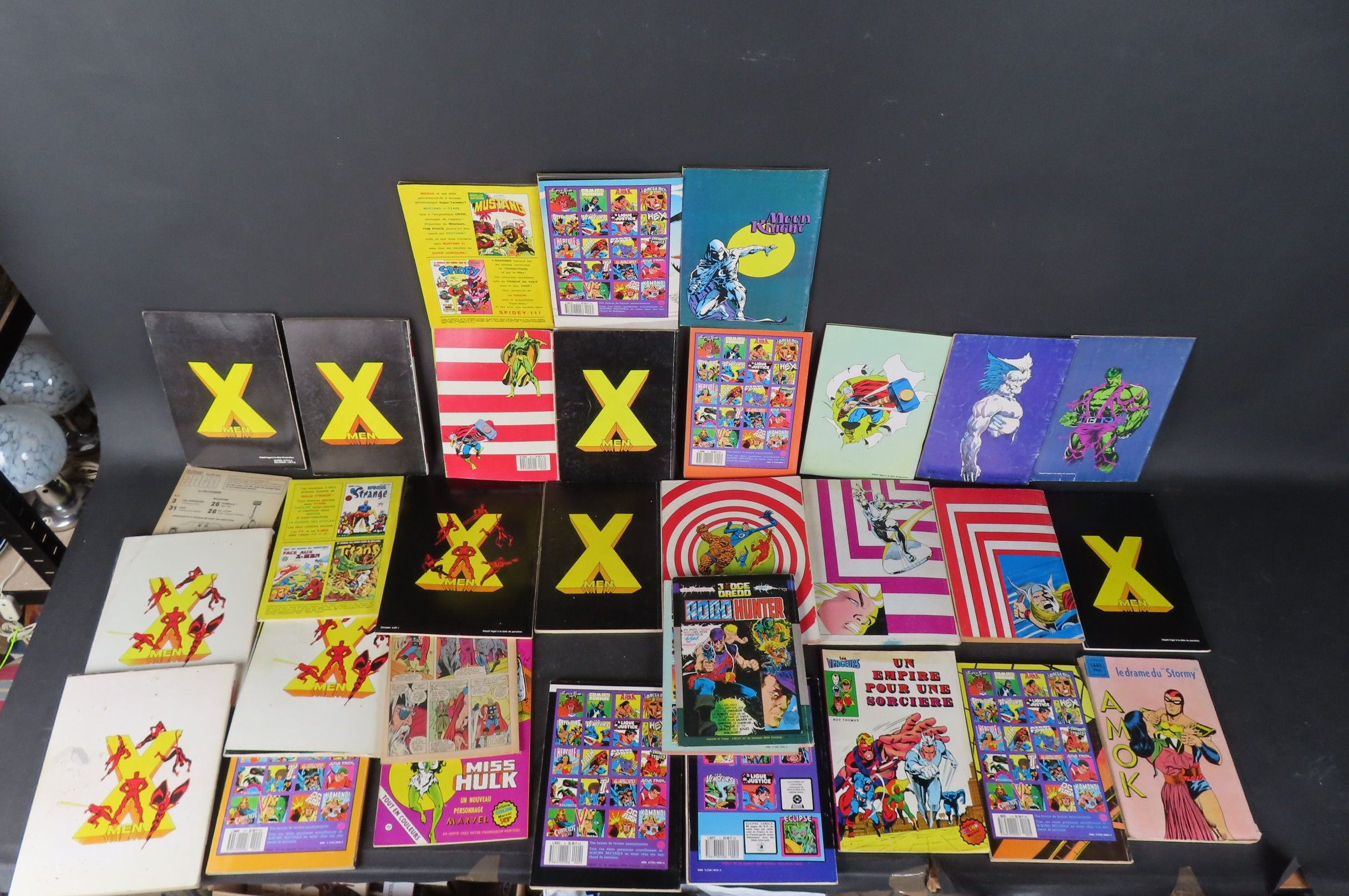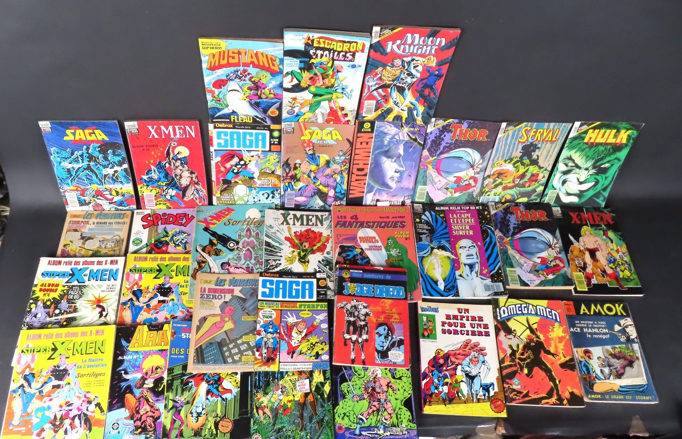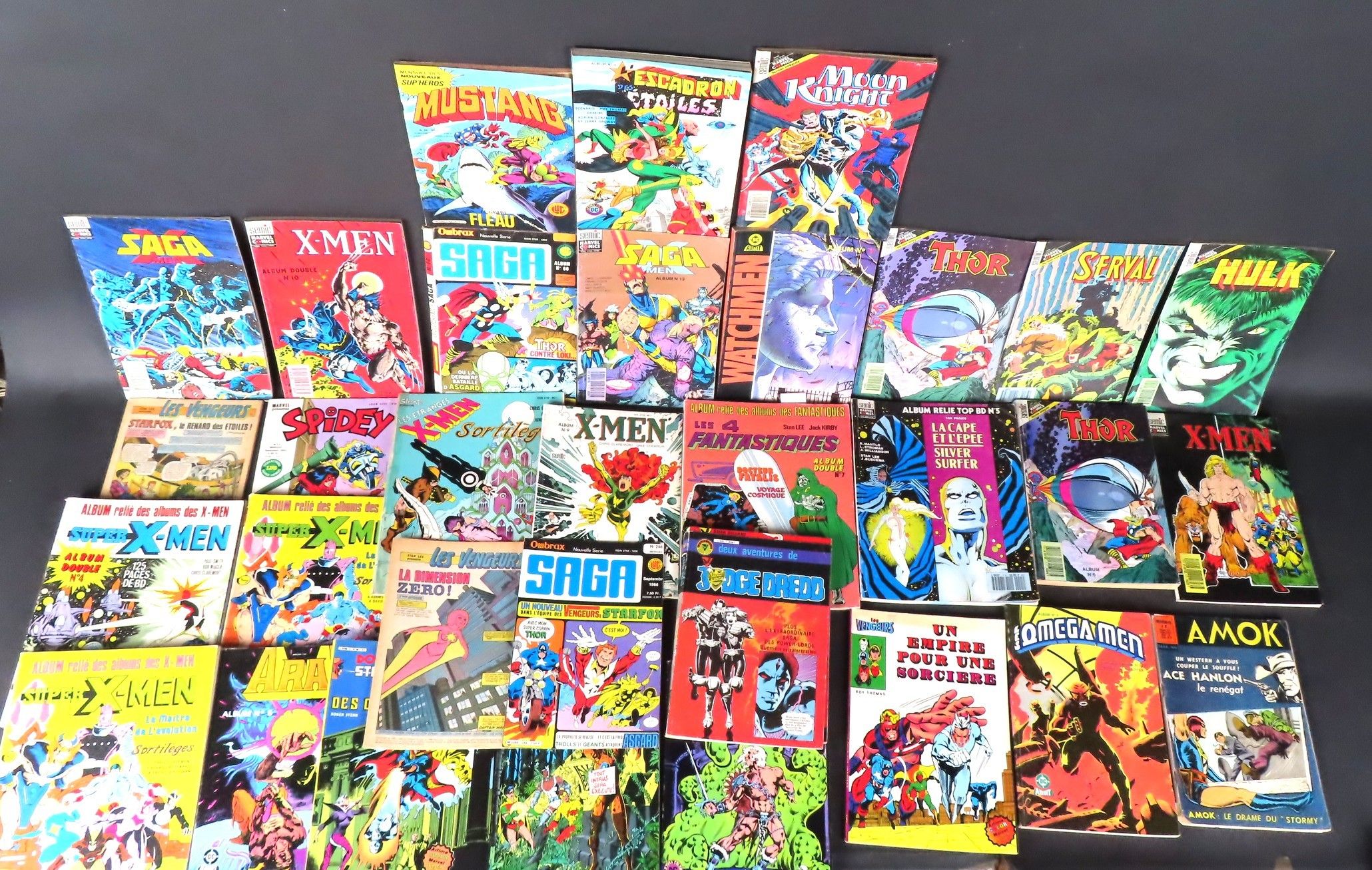 COMICS. Lot d'environ 27 albums comics dont MARVEL ; X MEN ; LES QUATRE FANTASTIQUES ; DOCTOR STRANGE et divers, principalement des années 1980 (usures et manques)