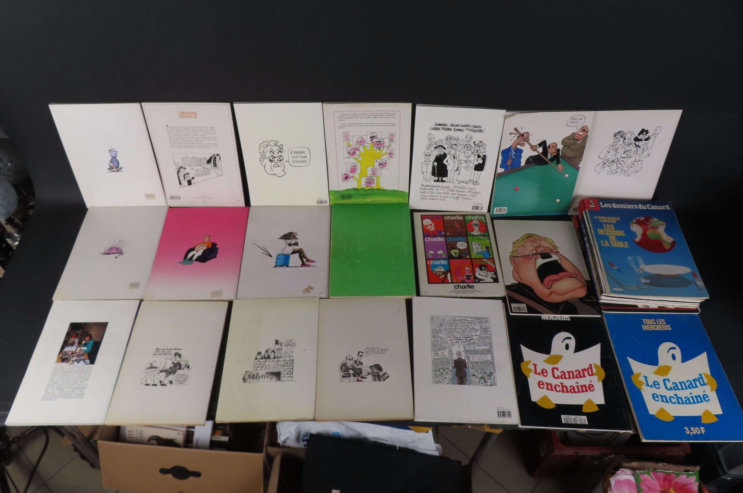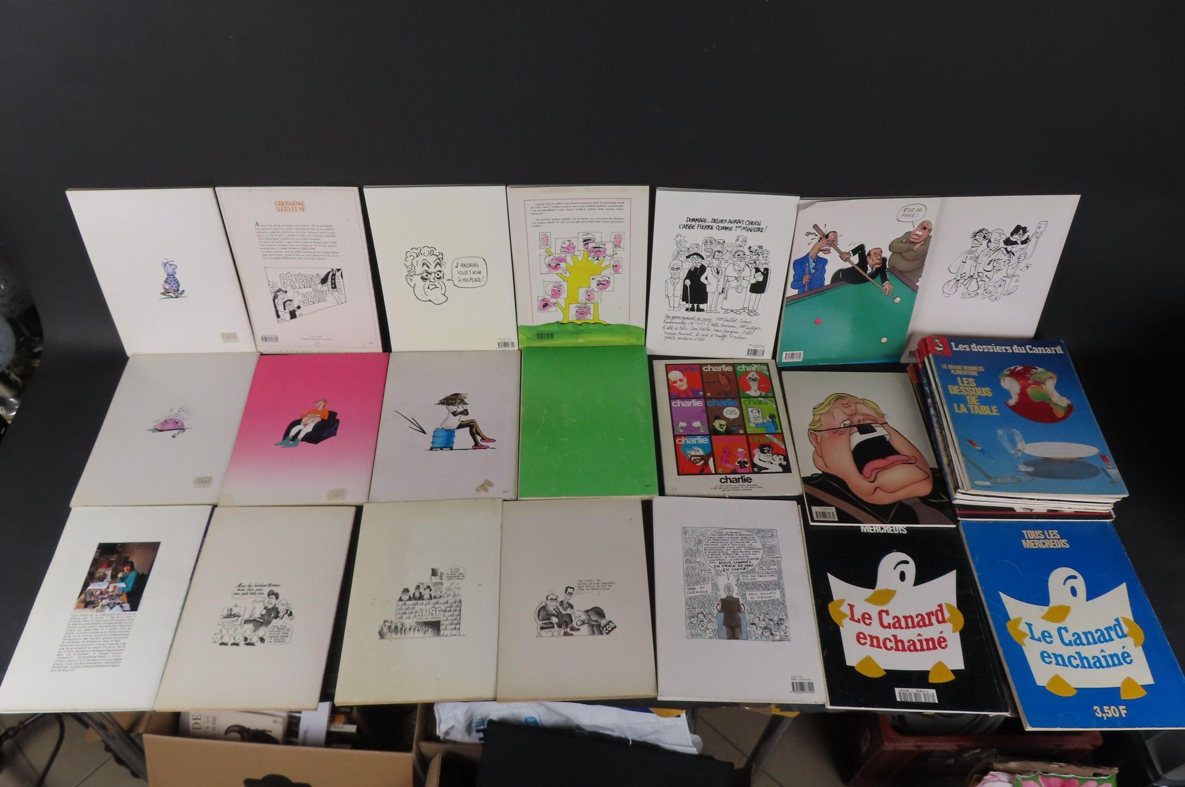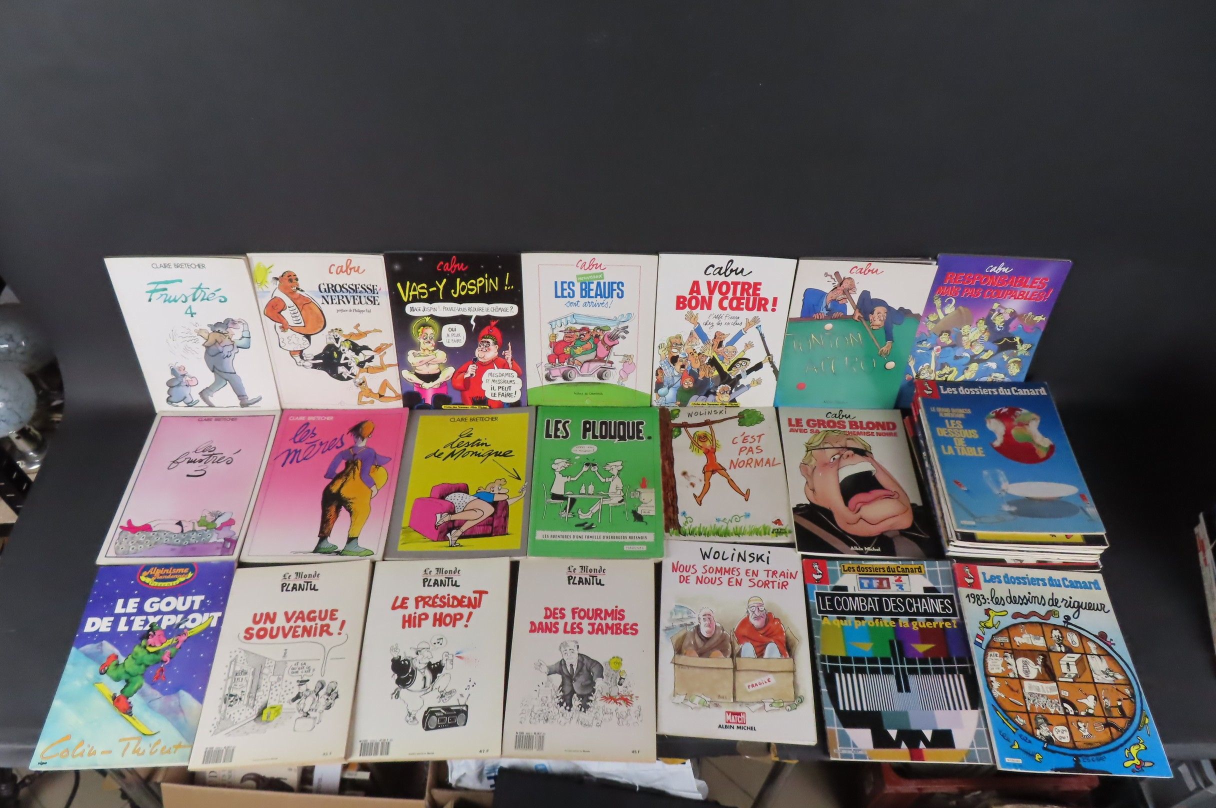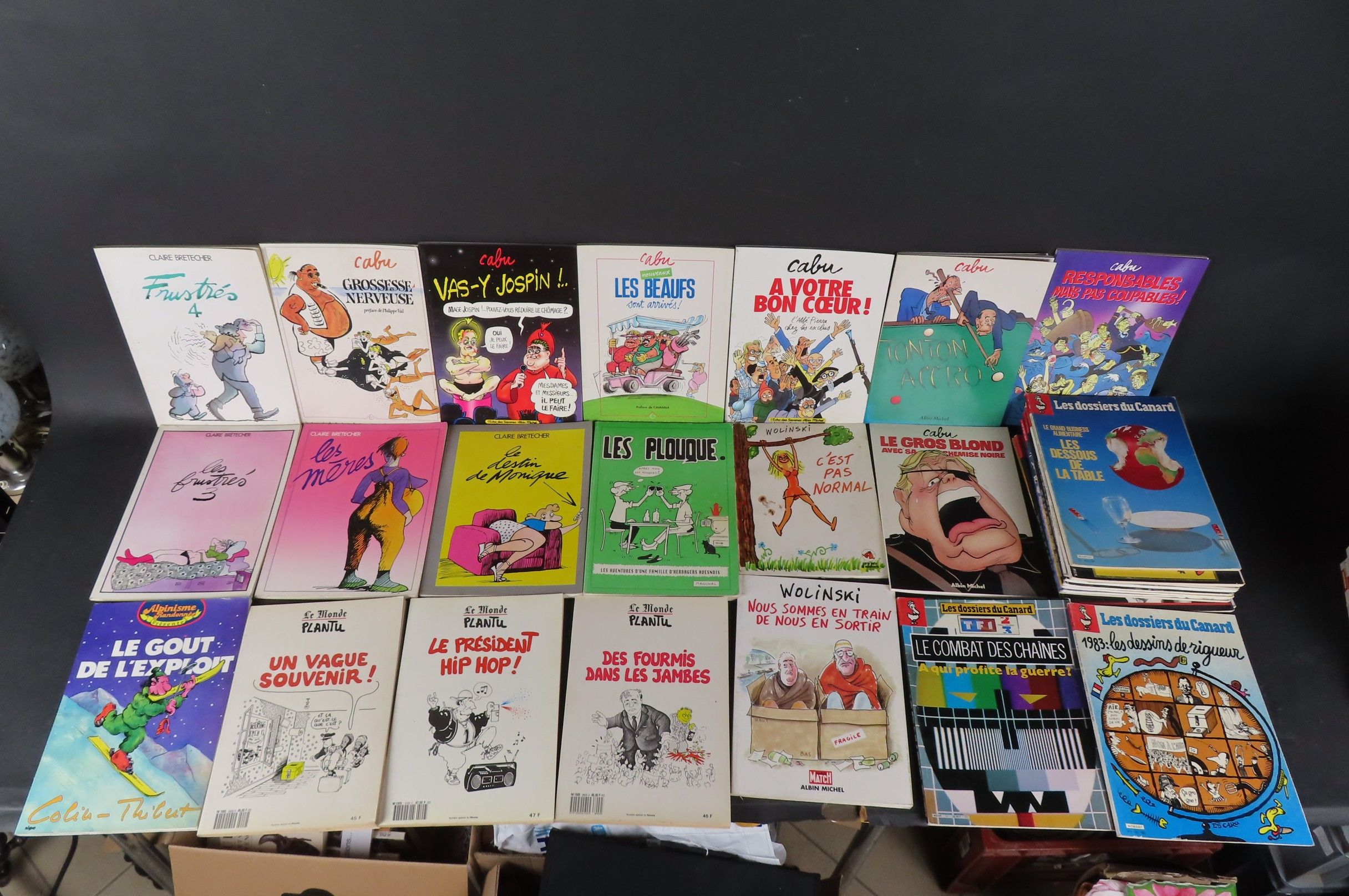 [BANDE-DESSINEES] Lot comprenant 7 albums CABU ; 4 albums PLANTU ; 4 albums CLAIRE RETECHER ; 1 album WOLINSKI. On y joint 12 dossiers du Canard Enchainé