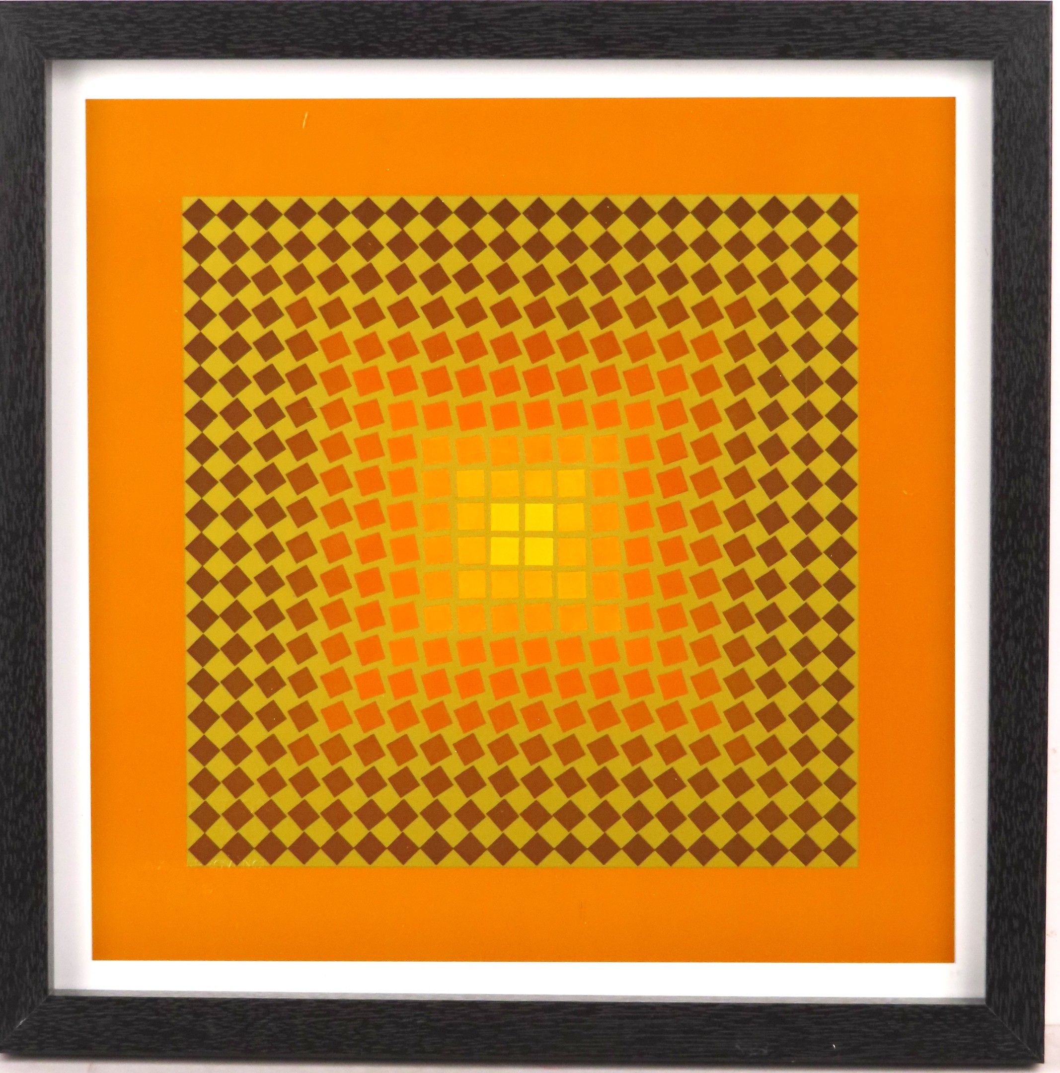 D'après Victor VASARELI (1906 - 1977)"Composition cinétique", sérigraphie en couleur sur papier, non signée, titrée au dos, éd du Griffon à Neuchâtel, cadre en bois noirci (30 x 30 cm)