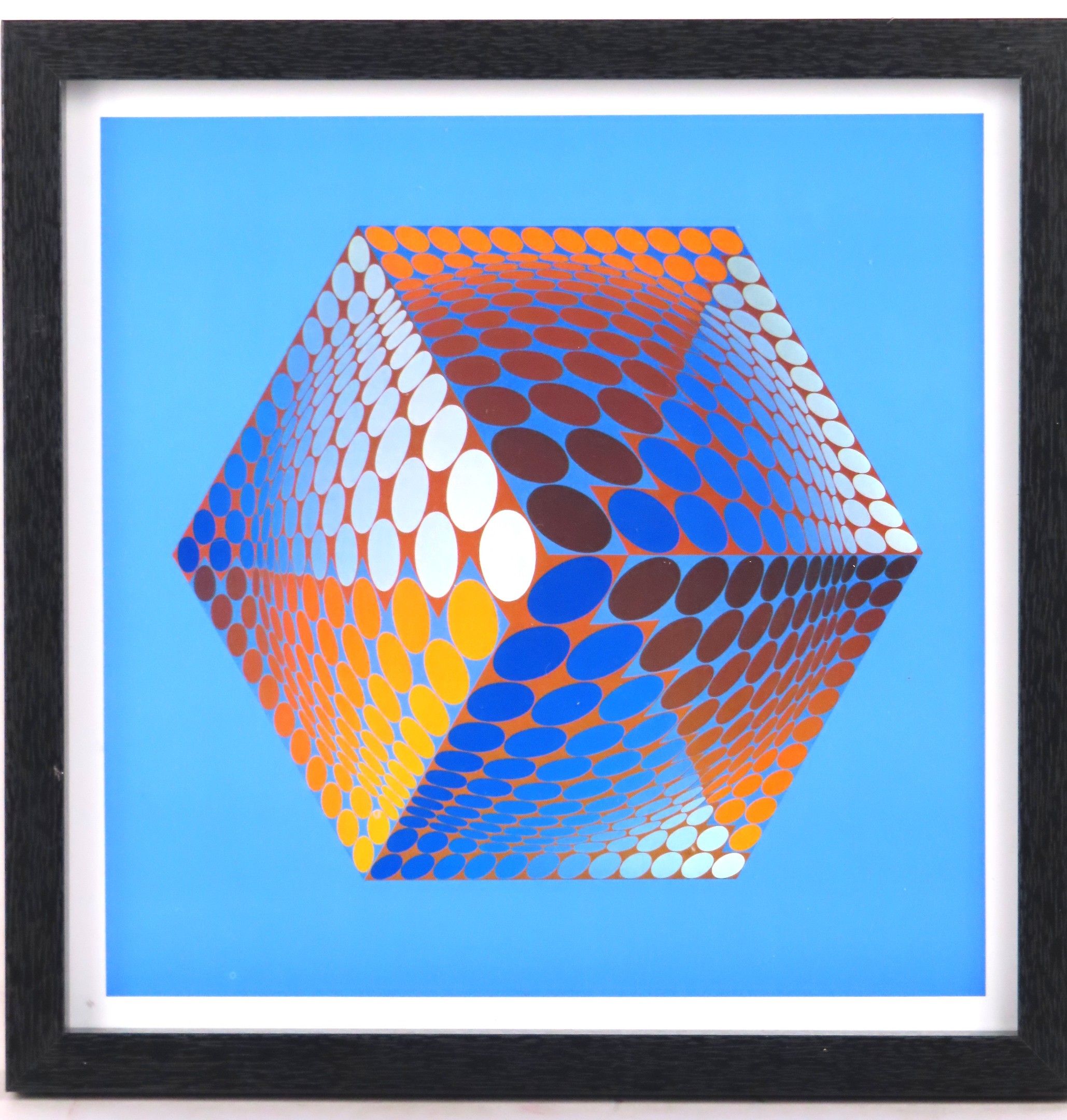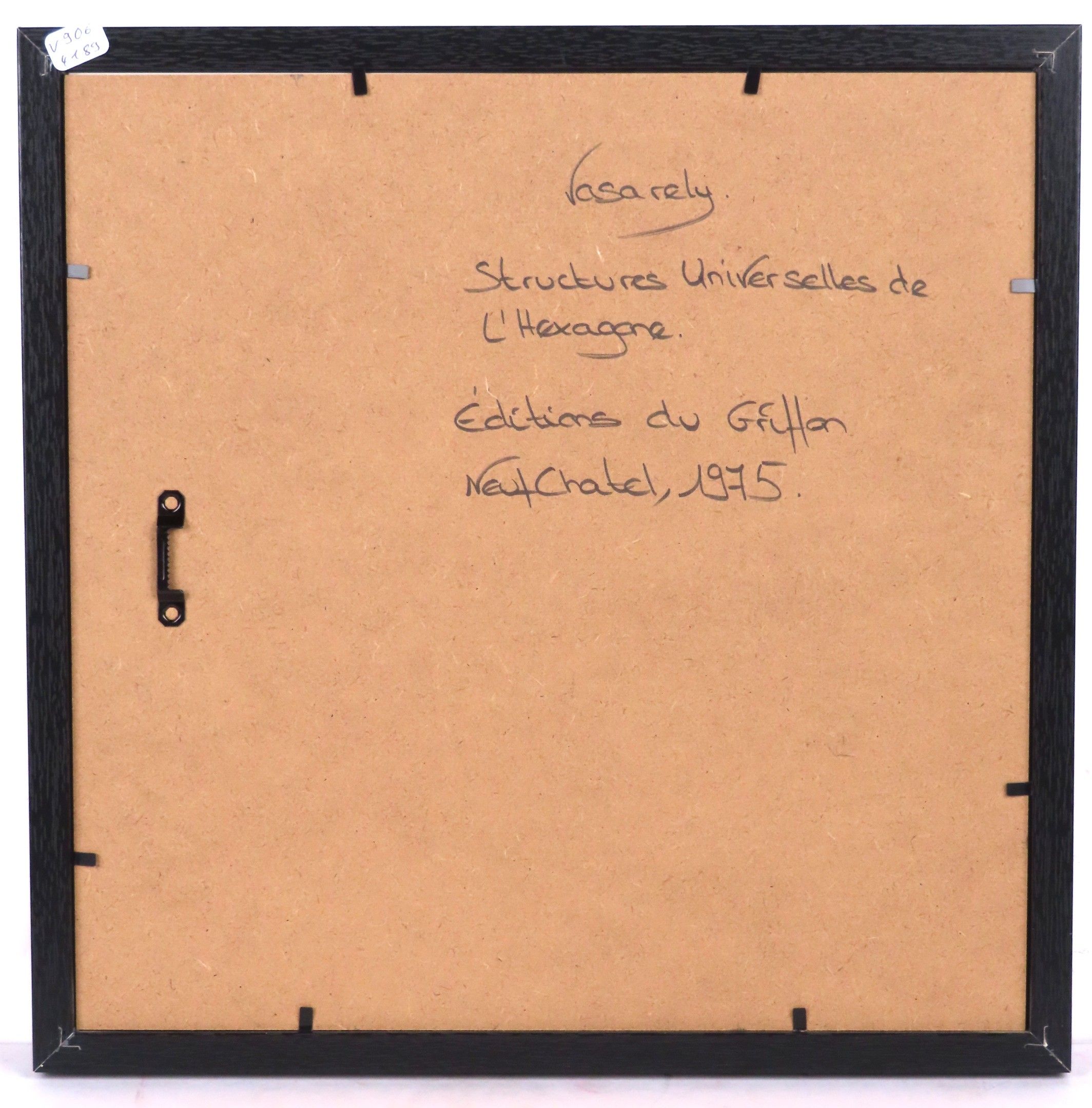 D'après Victor VASARELI (1906 - 1977)"Composition cinétique", sérigraphie en couleur sur papier, non signée, titrée au dos, éd du Griffon à Neuchâtel, cadre en bois noirci (30 x 30 cm)