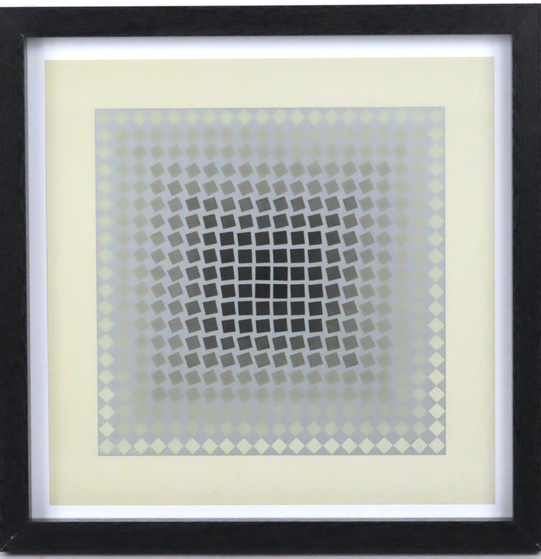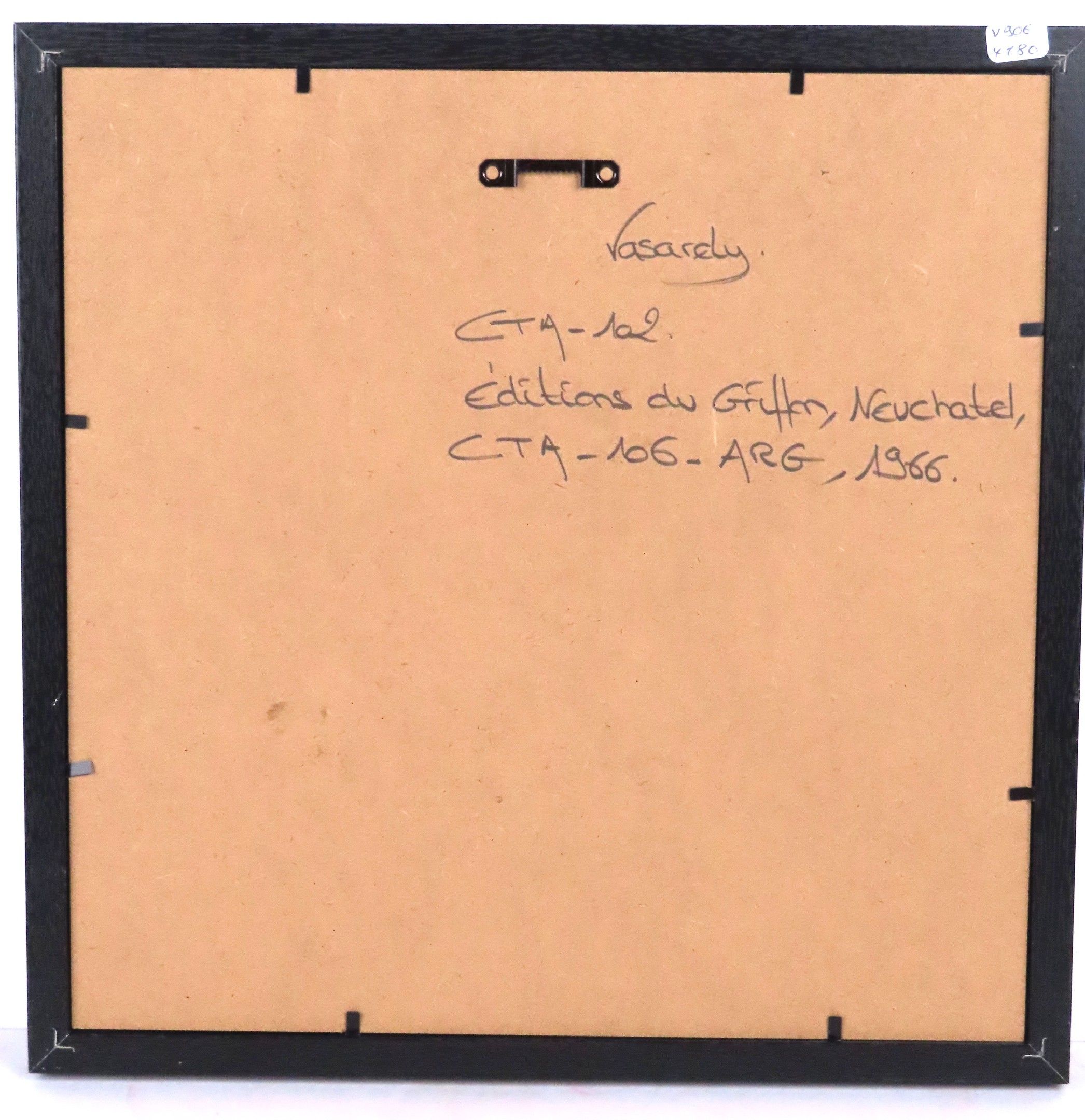 D'après Victor VASARELI (1906 - 1977)"Composition cinétique", sérigraphie en couleur sur papier, non signée, titrée au dos, éd du Griffon à Neuchâtel, cadre en bois noirci (30 x 30 cm)