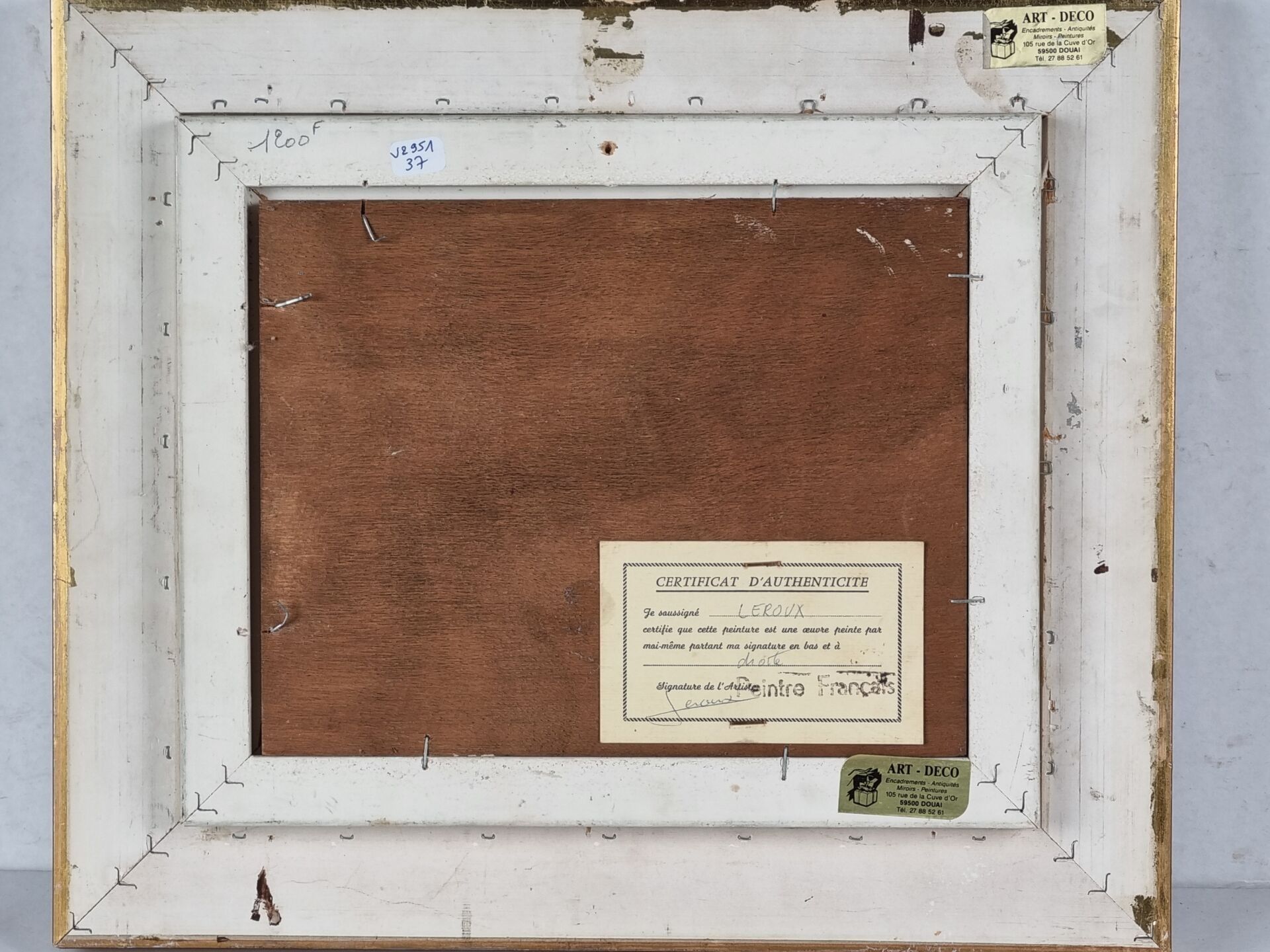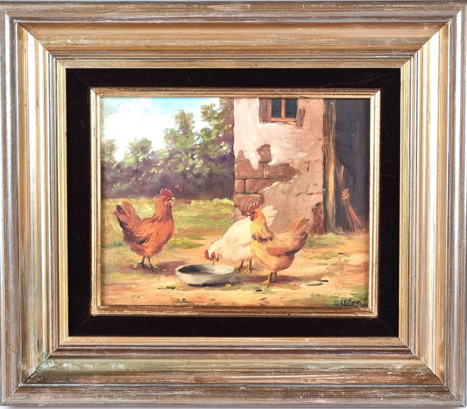 LEROUX (XXe). "La basse-cour", huile sur toile, signée en bas à droite (19 x 24 cm)