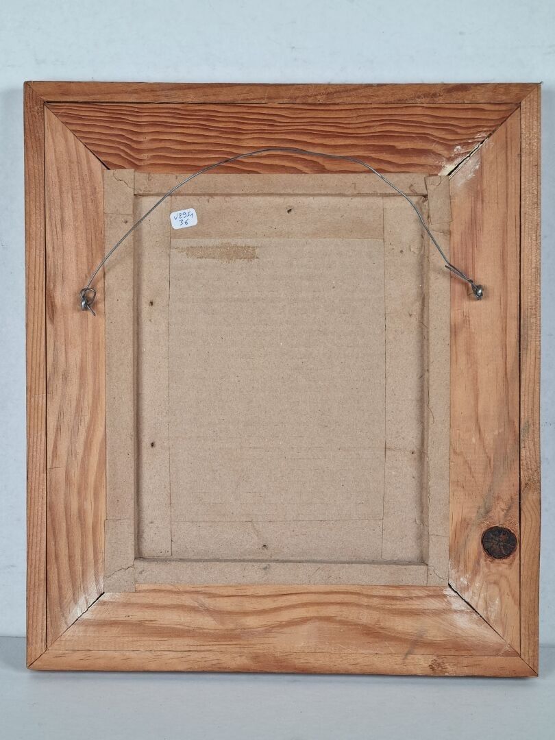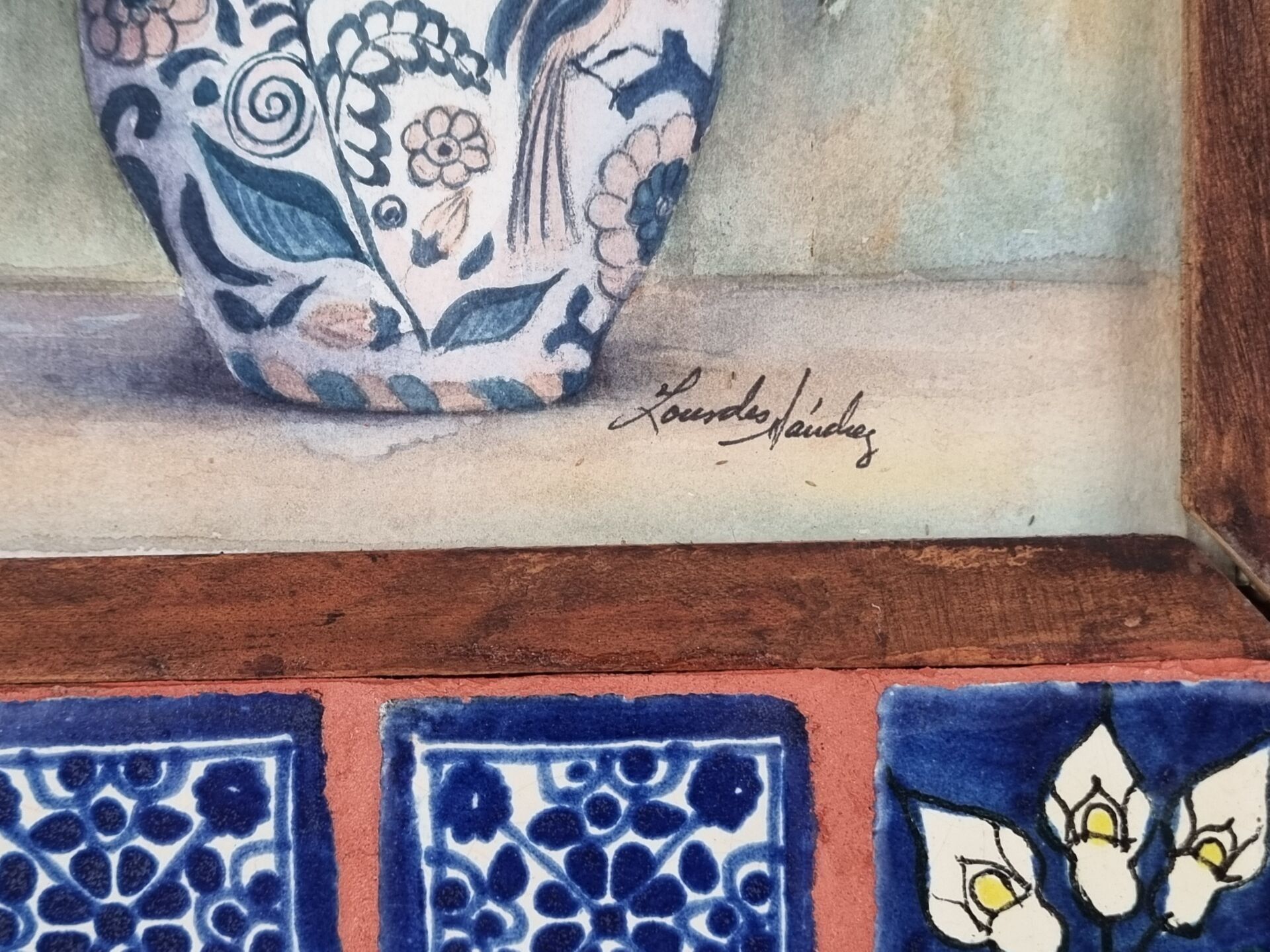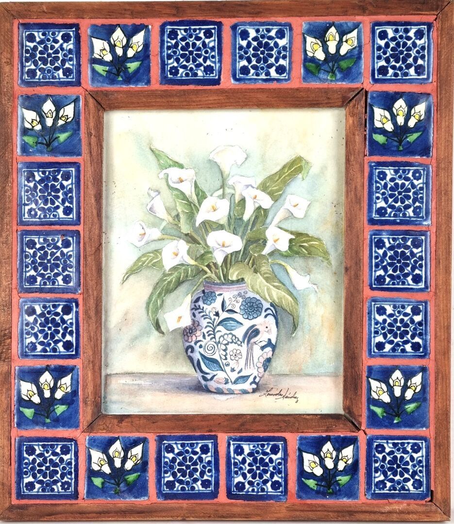 Lourdes SANCHEZ (XXe). "Vase aux arums", aquarelle, signée en bas à droite (à vue : 24 x 19,5 cm). Cadre en bois et carreaux de faïence
