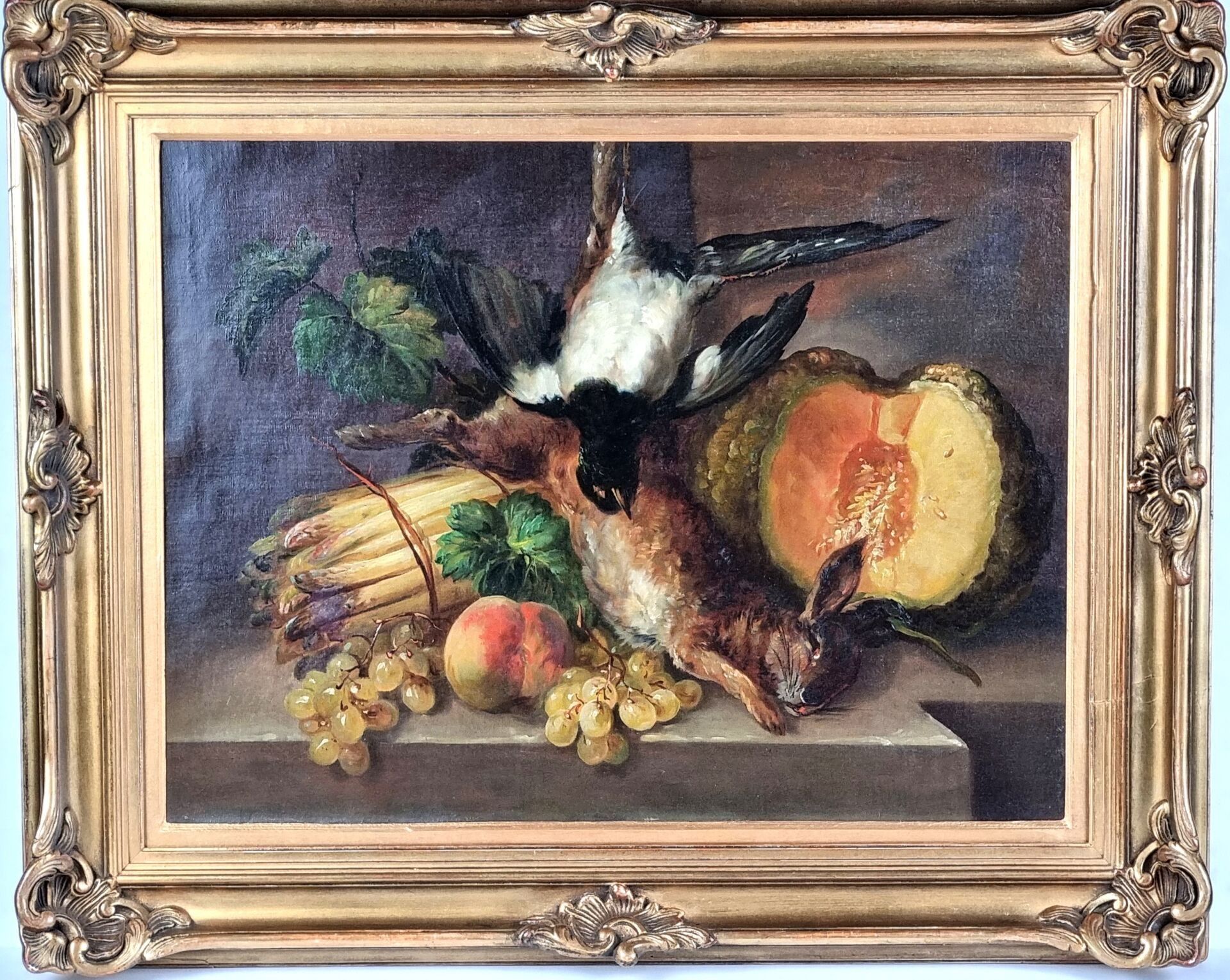 École vers 1900. "Nature morte à la pie, lièvre et melon", huile sur toile (49 x 64 cm) (restauration)