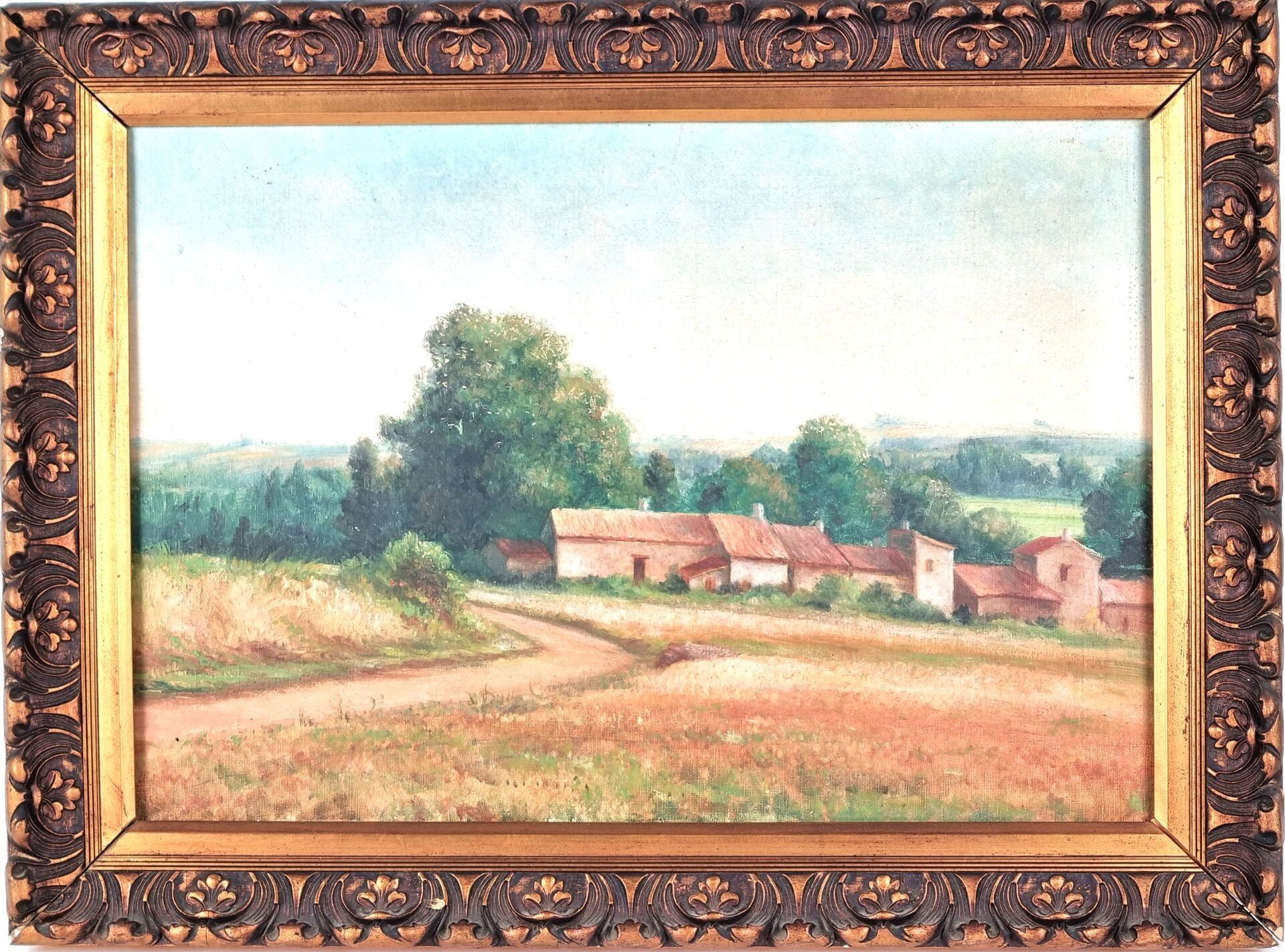 École début XXe. "Paysage avec ferme", huile sur toile (38 x 55 cm)