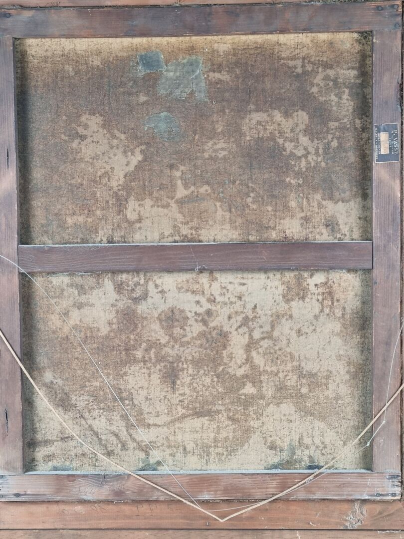 École XXe. "Vase de fleurs", huile sur toile (65 x 54 cm) (restaurations, manque en partie basse)