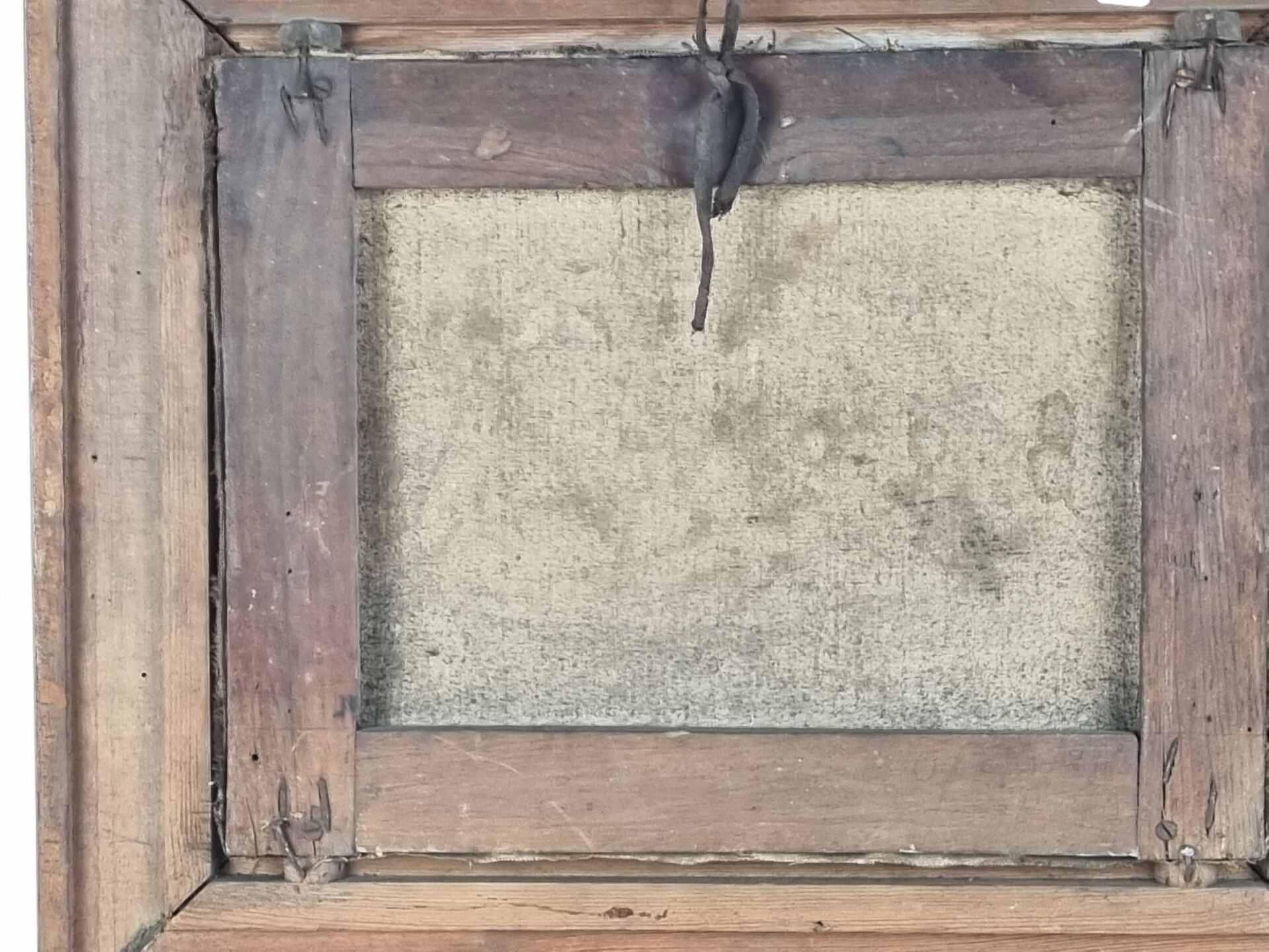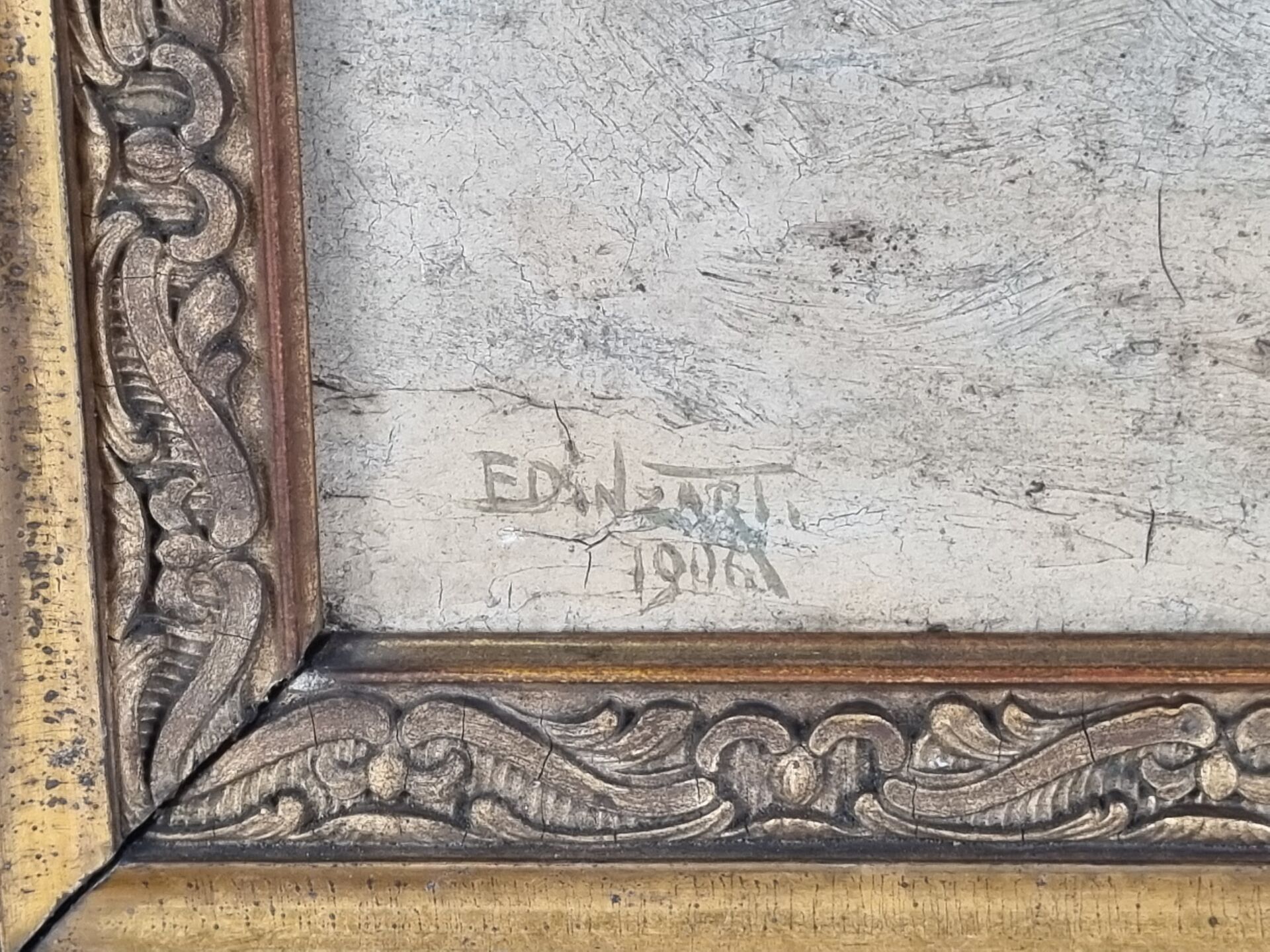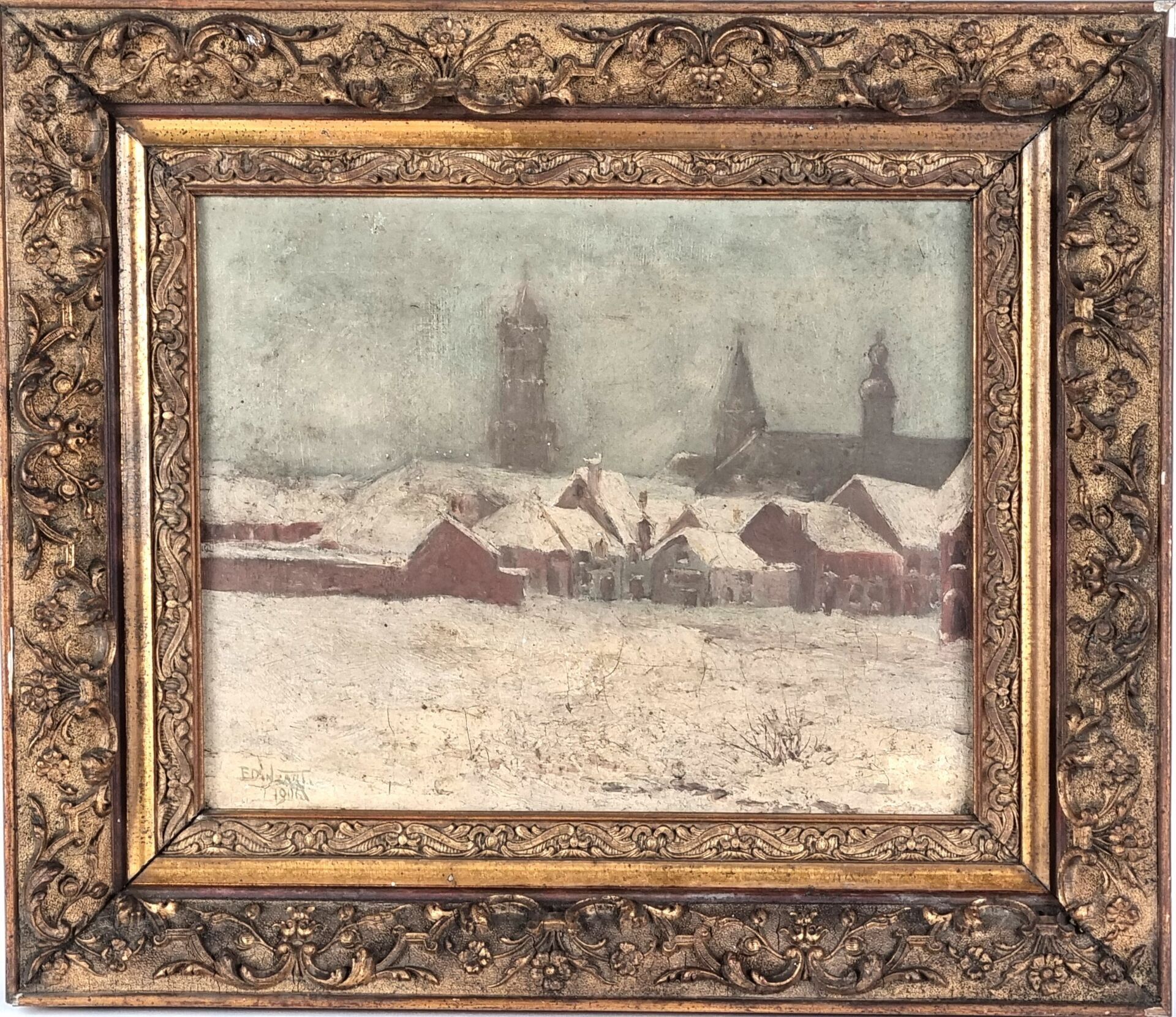Edgar DINZART (XIX-XXe). "Paysage enneigé", huile sur toile, signée en bas à gauche et datée 1906 (27 x 35 cm) (sale, petit manque). Cadre en bois et stuc doré