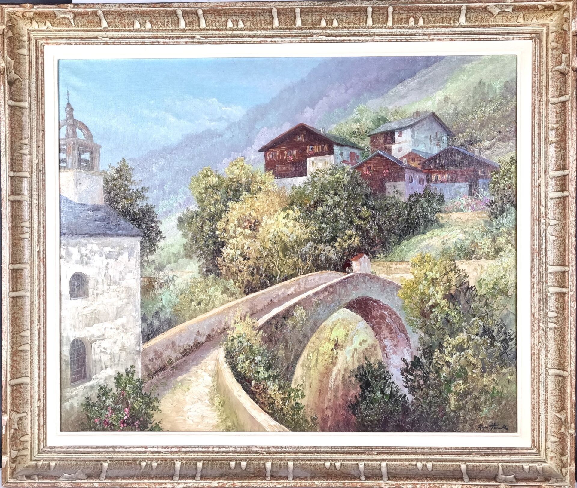 Ecole XXe "Paysage de Stalden en Tessin, Suisse", huile sur toile signée en bas à droite, titrée au revers (60 x 73 cm)