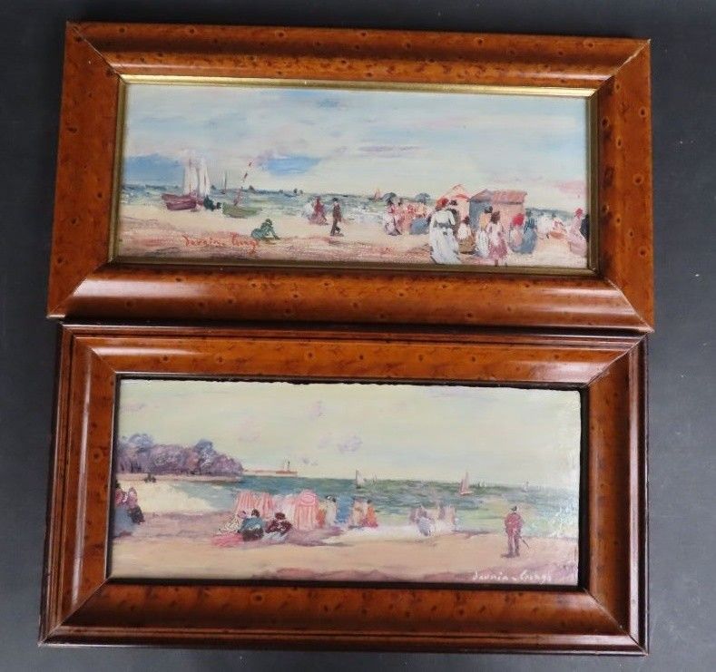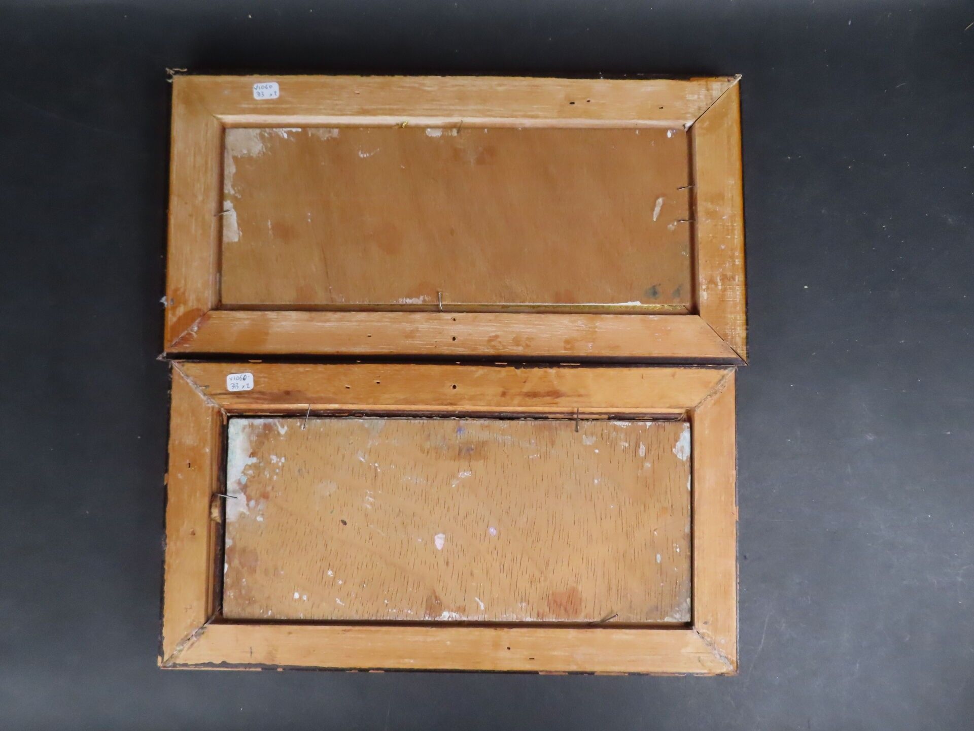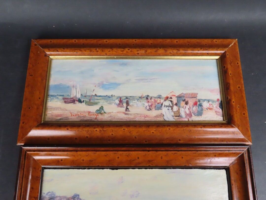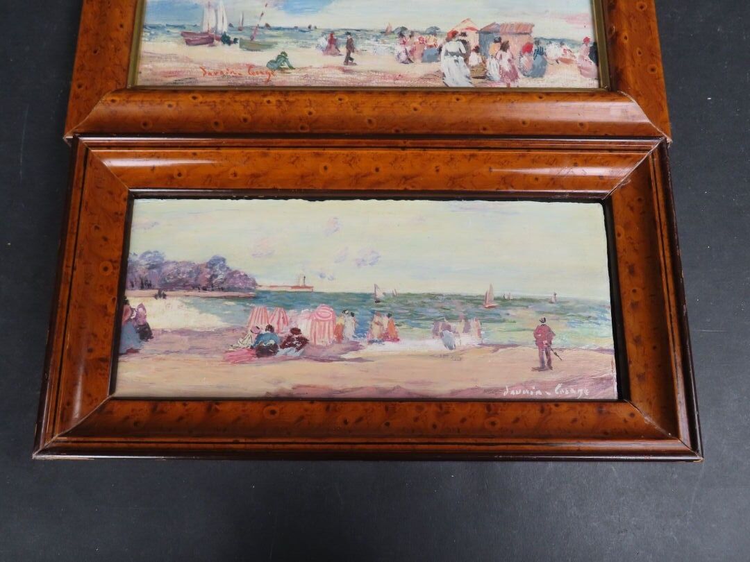 École XXe. "Scènes de plage", paire d'huiles sur panneau, signées (14 x 33 cm). Cadres en bois peint à l'imitation de la loupe