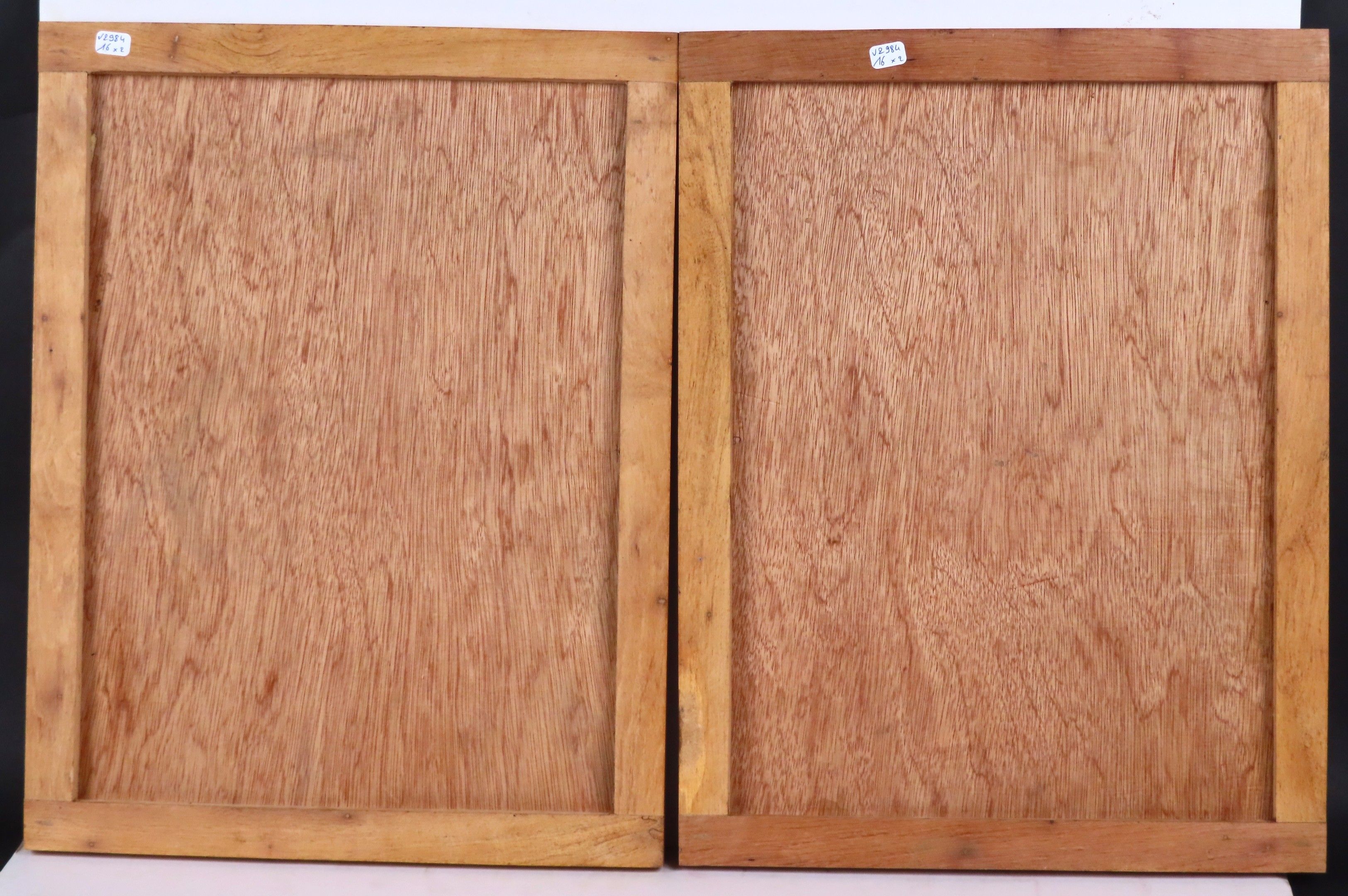 "Coke en stock" et "Tintin au pays de l'Or Noir", paire de panneaux en marqueterie de bois exotique, d'après les Aventures de Tintin (44 x 34 cm)