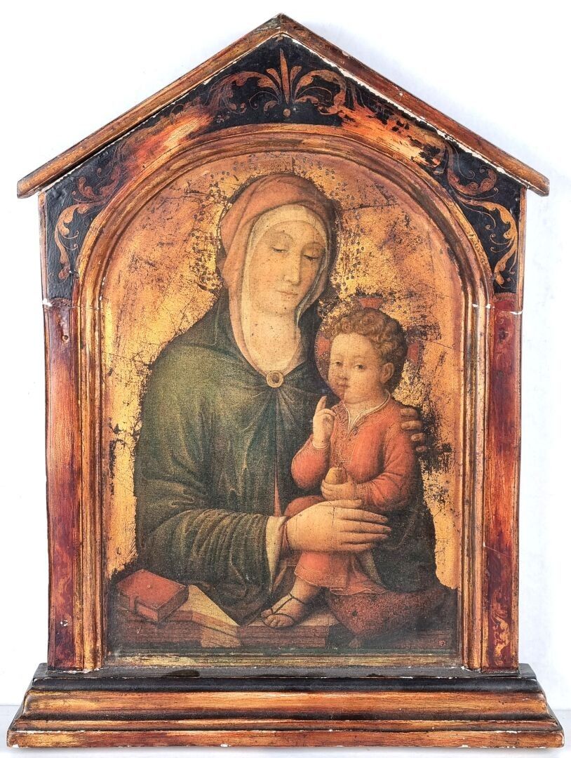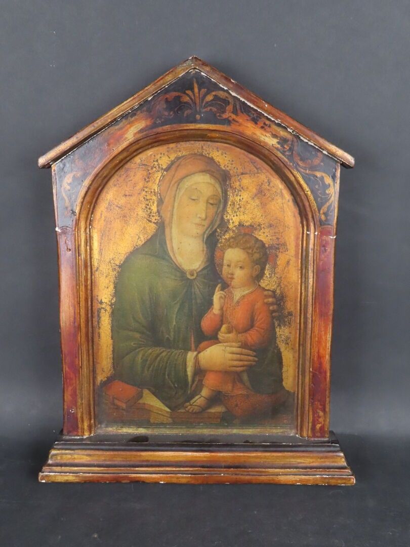 D'après Jacopo BELLINI. "Vierge à l'Enfant", procédé de reproduction, cadre formant retable (50 x 39 cm)