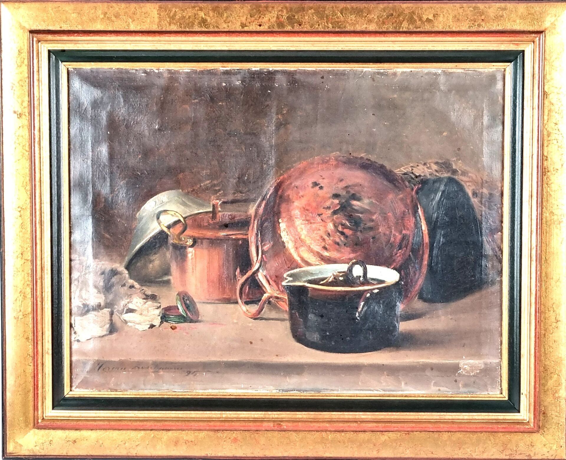 MOREAU (XIXe). "Nature-morte aux cuivres", huile sur toile, …