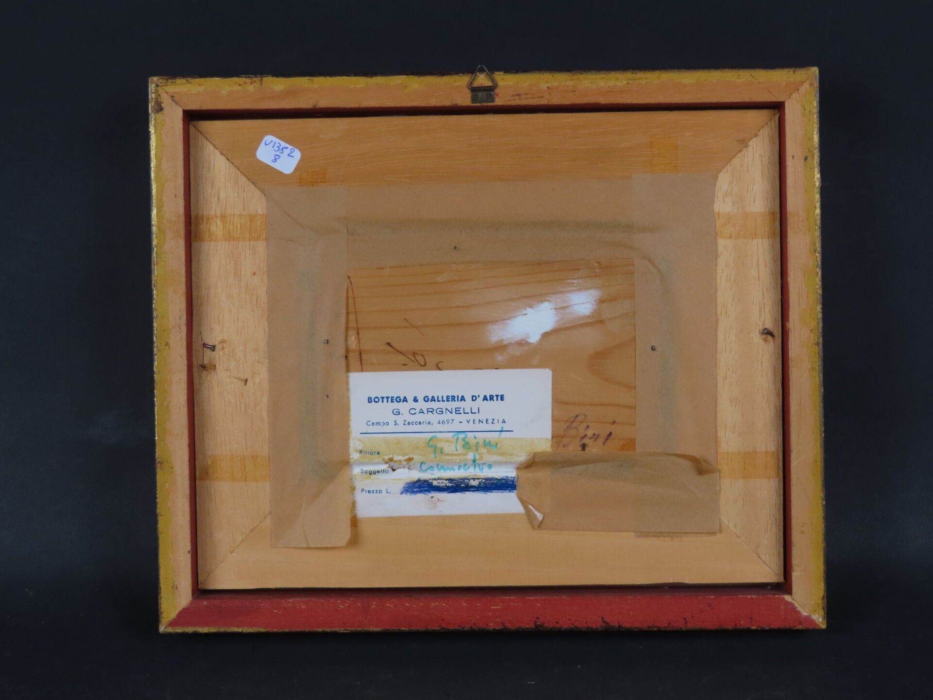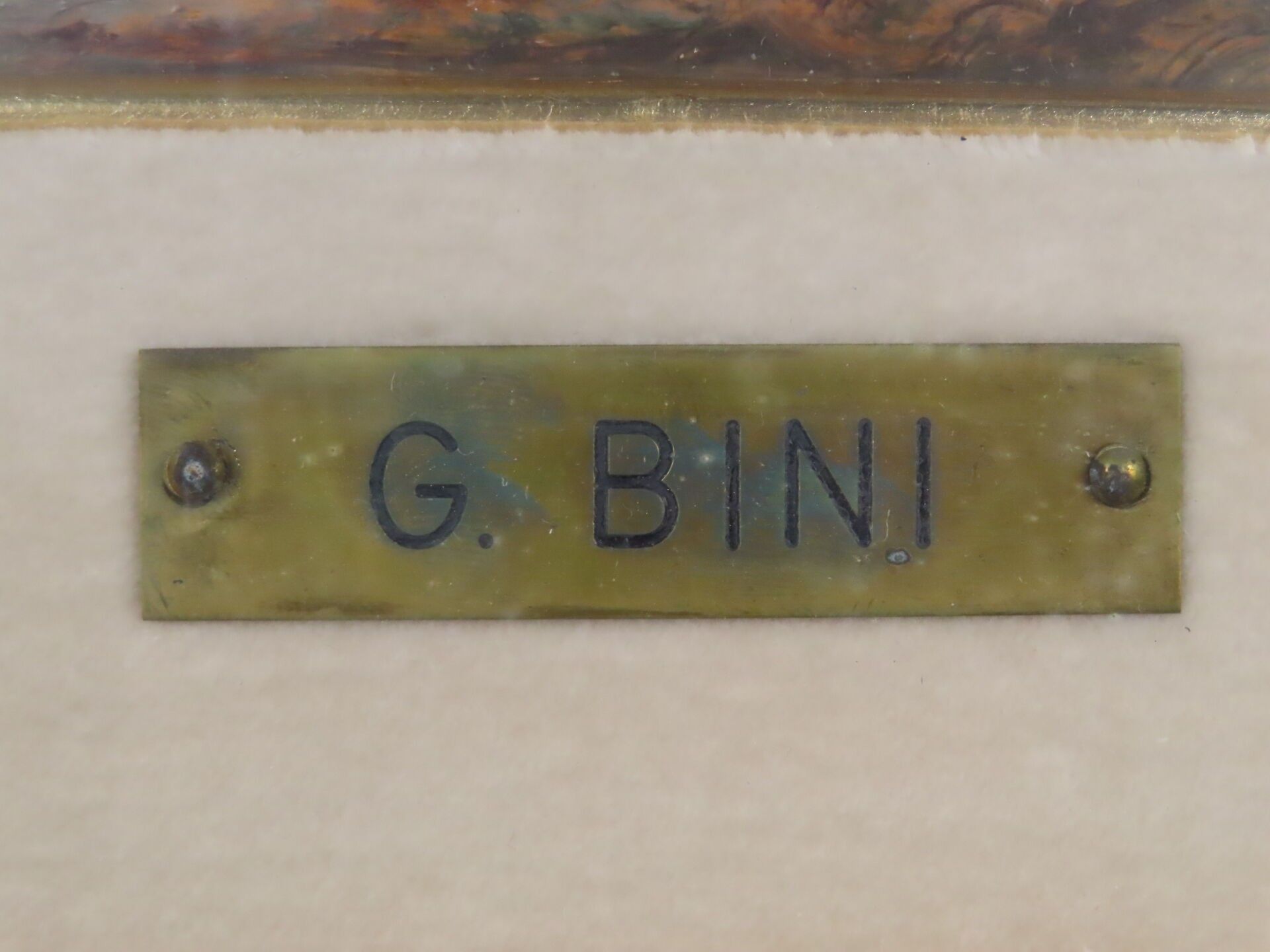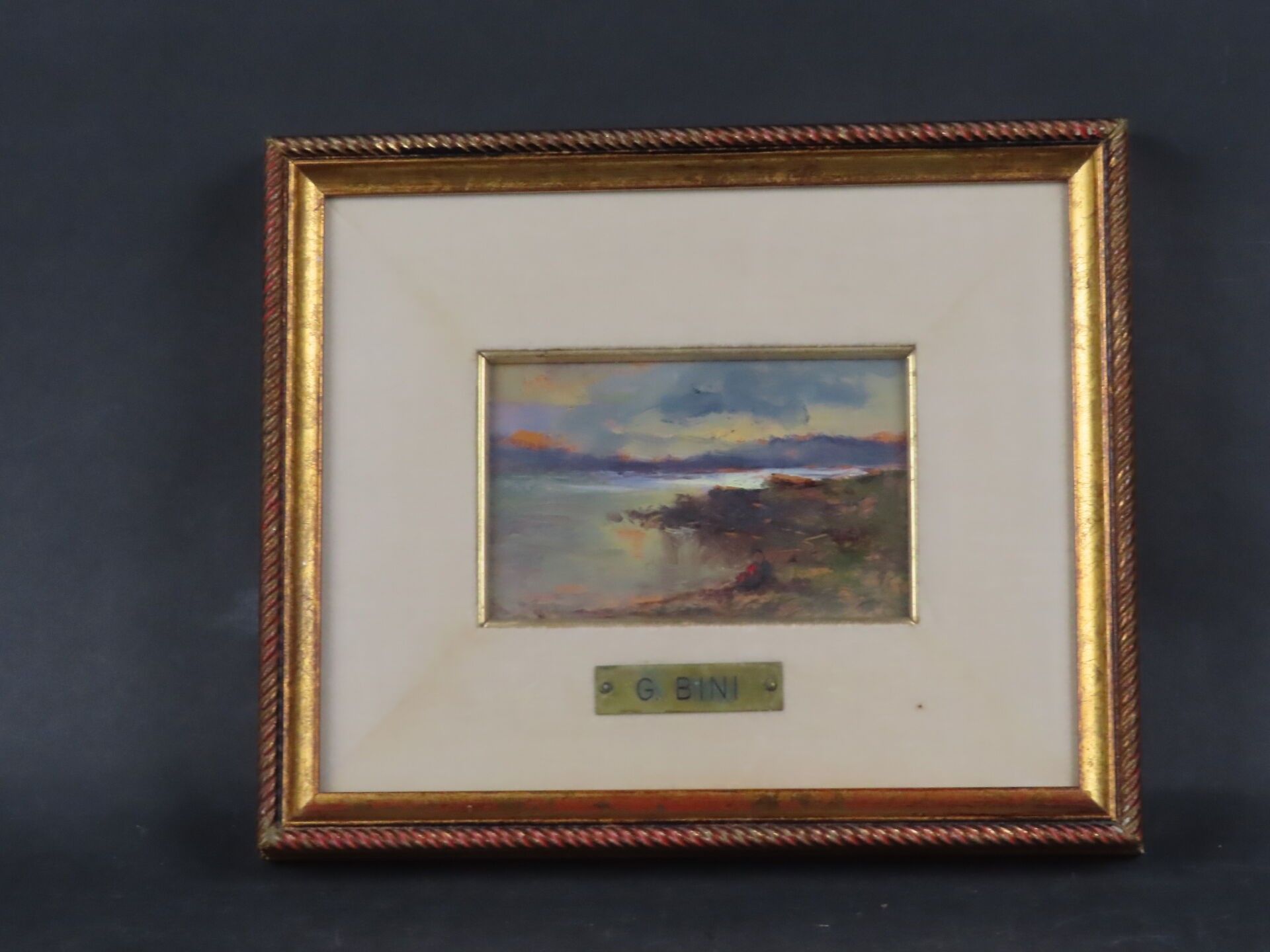 G. BINI (XXe). "Bord de mer", huile sur panneau (avec cadre : 24 x 29 cm) Cadre doré, encadrement sous verre avec cartel en laiton