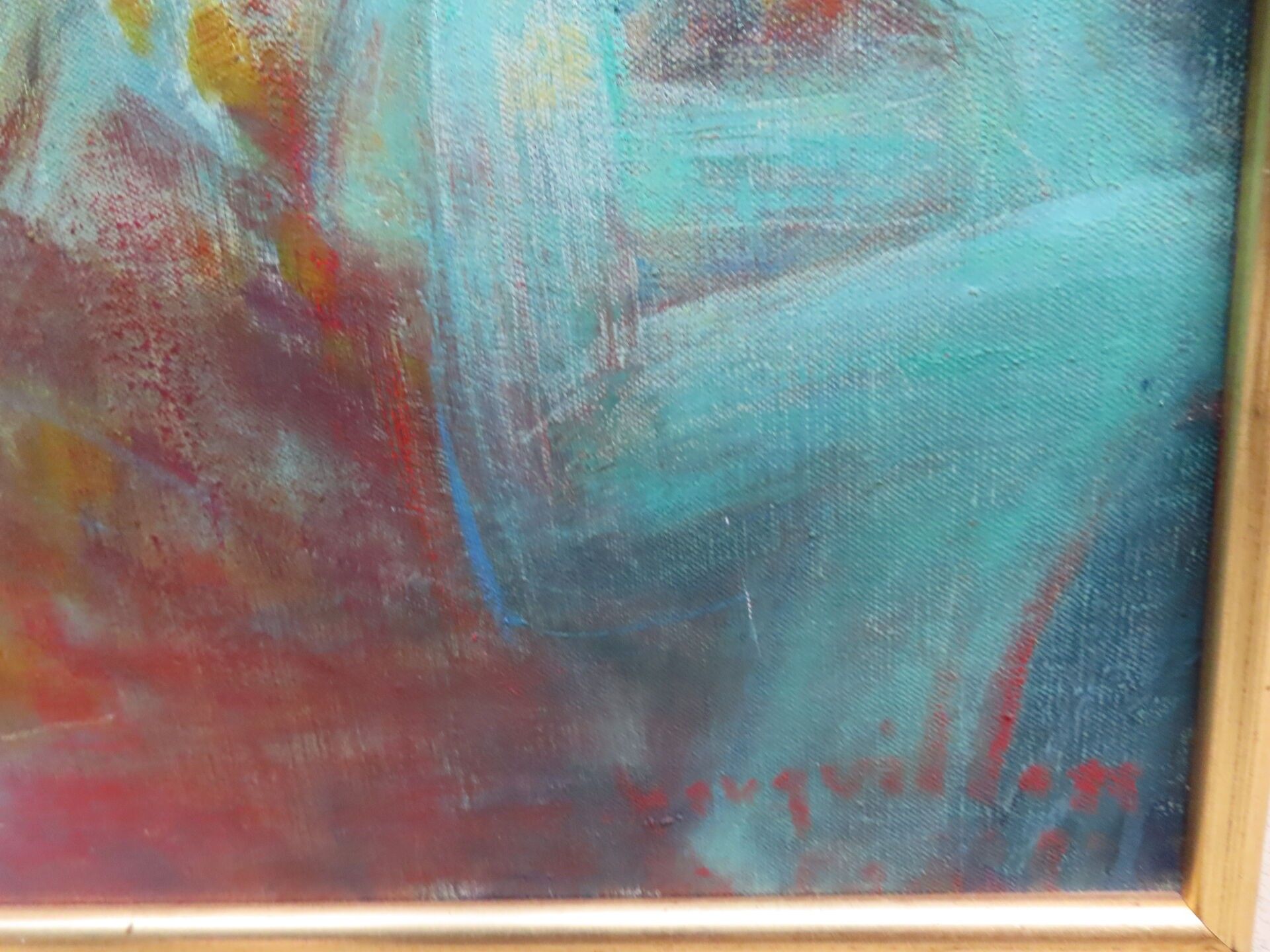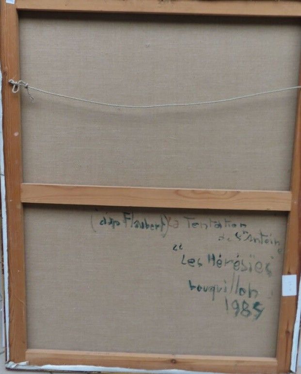 Robert BOUQUILLON (1923-2013). "La tentation de St Antoine. Les hérésies", huile sur toile, signée en bas à droite, titrée, contresignée et datée 1985 au dos (92 x 73 cm)