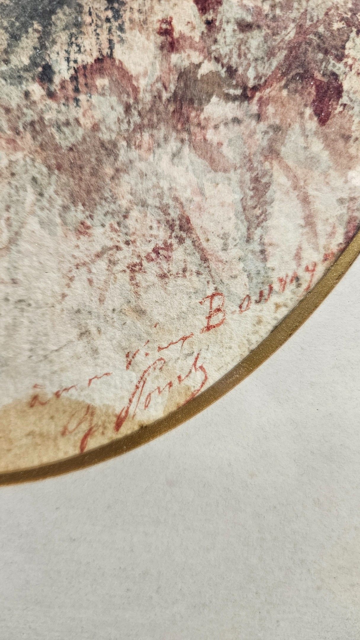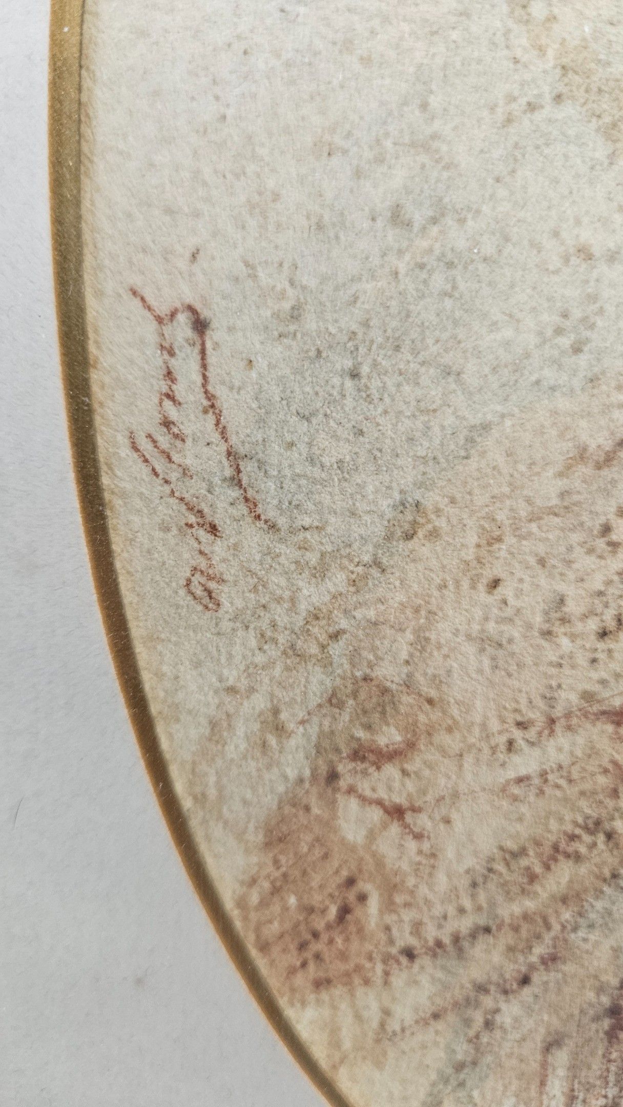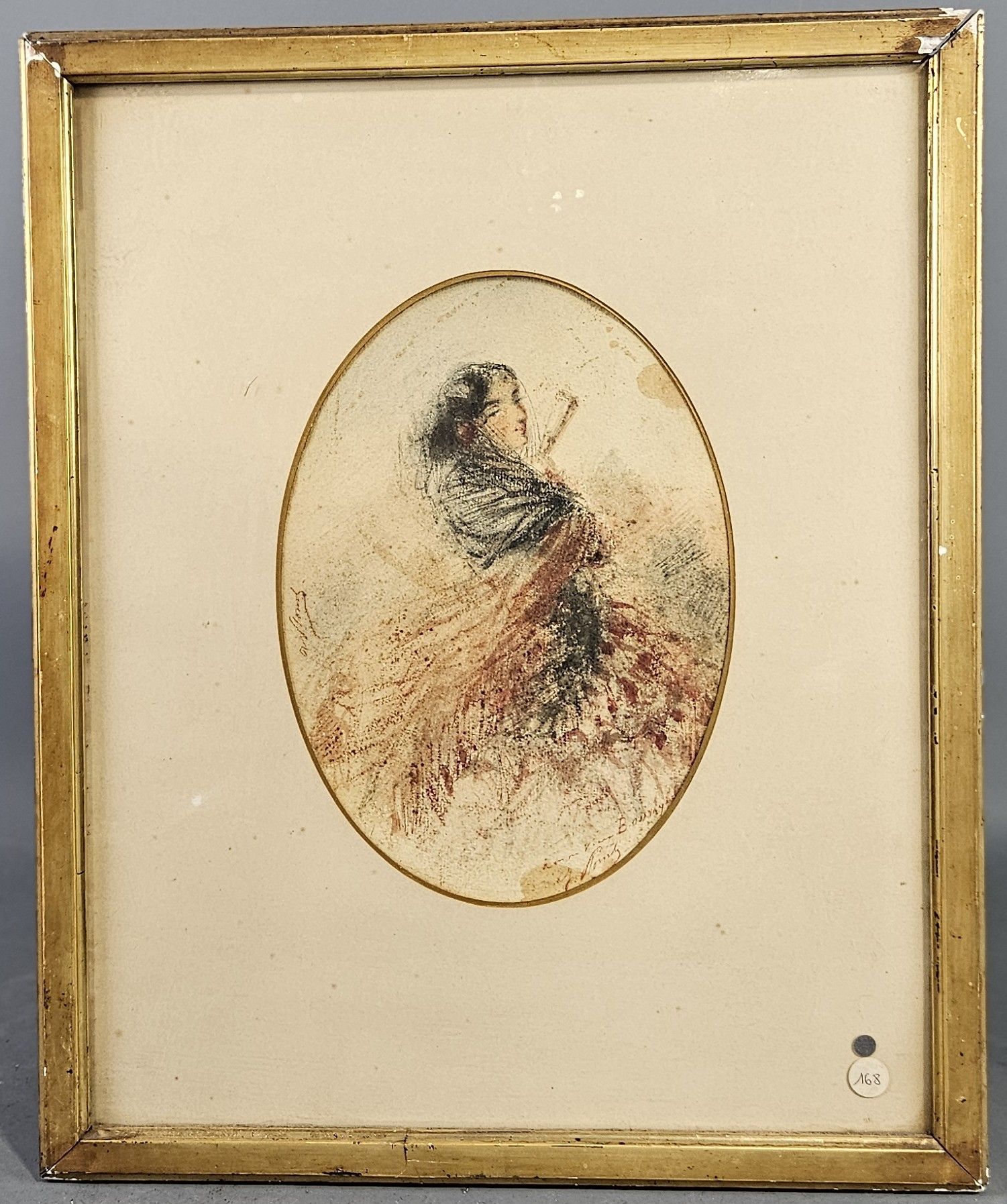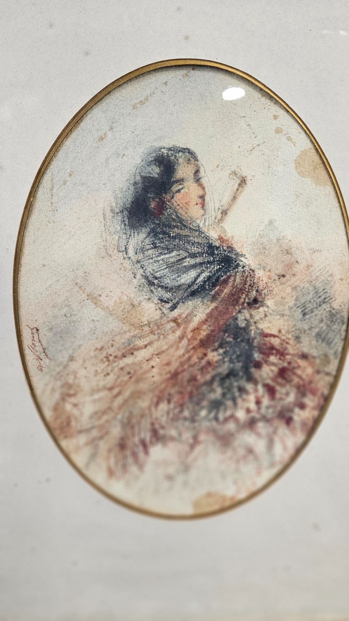 Ecole de la seconde moitié du XIXème : "Jeune élégante vêtue à l’espagnole". Fine aquarelle à vue ovale, signée, avec en envoi, 24 x 17 cm à vue. Taches