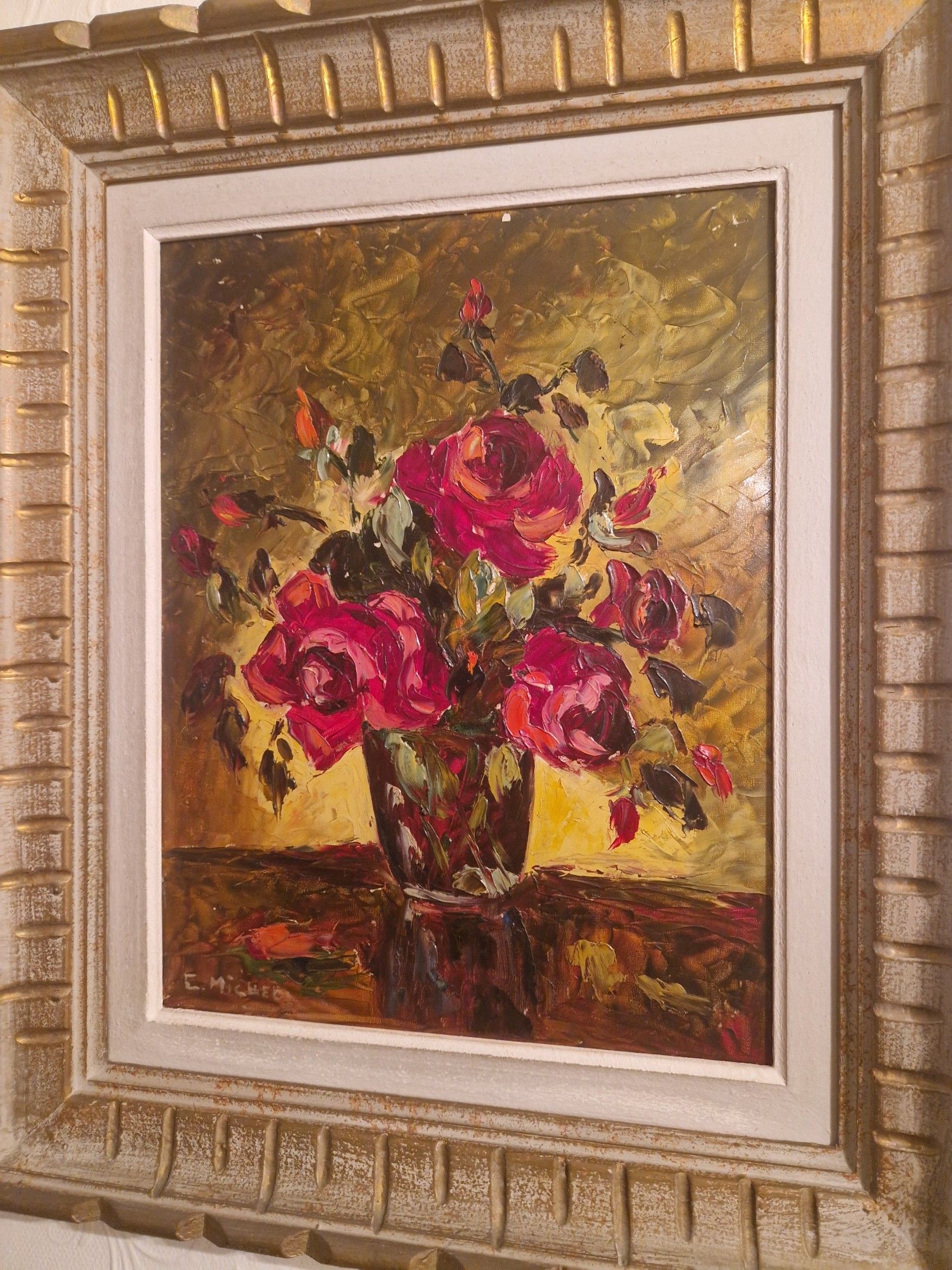 MICHEL : "Bouquet de roses". Huile sur panneau, SBG, 35 x 27 cm