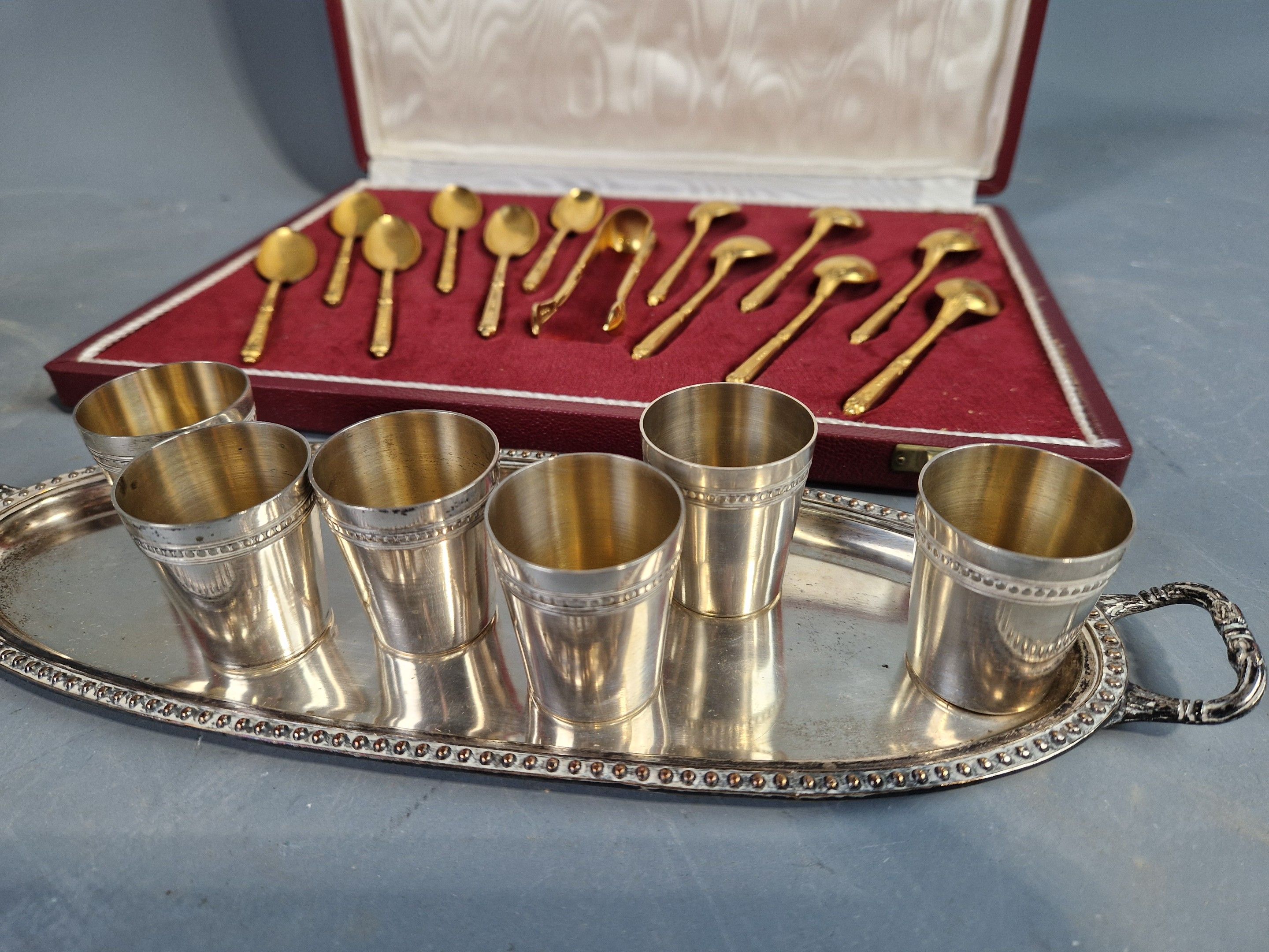 Petit lot d'art de la table : Plateau ovale ansé modèle filet de perles avec six verres à liqueur assortis en métal argenté et coffret de douze cuillères à café et une pince à sucre en métal doré