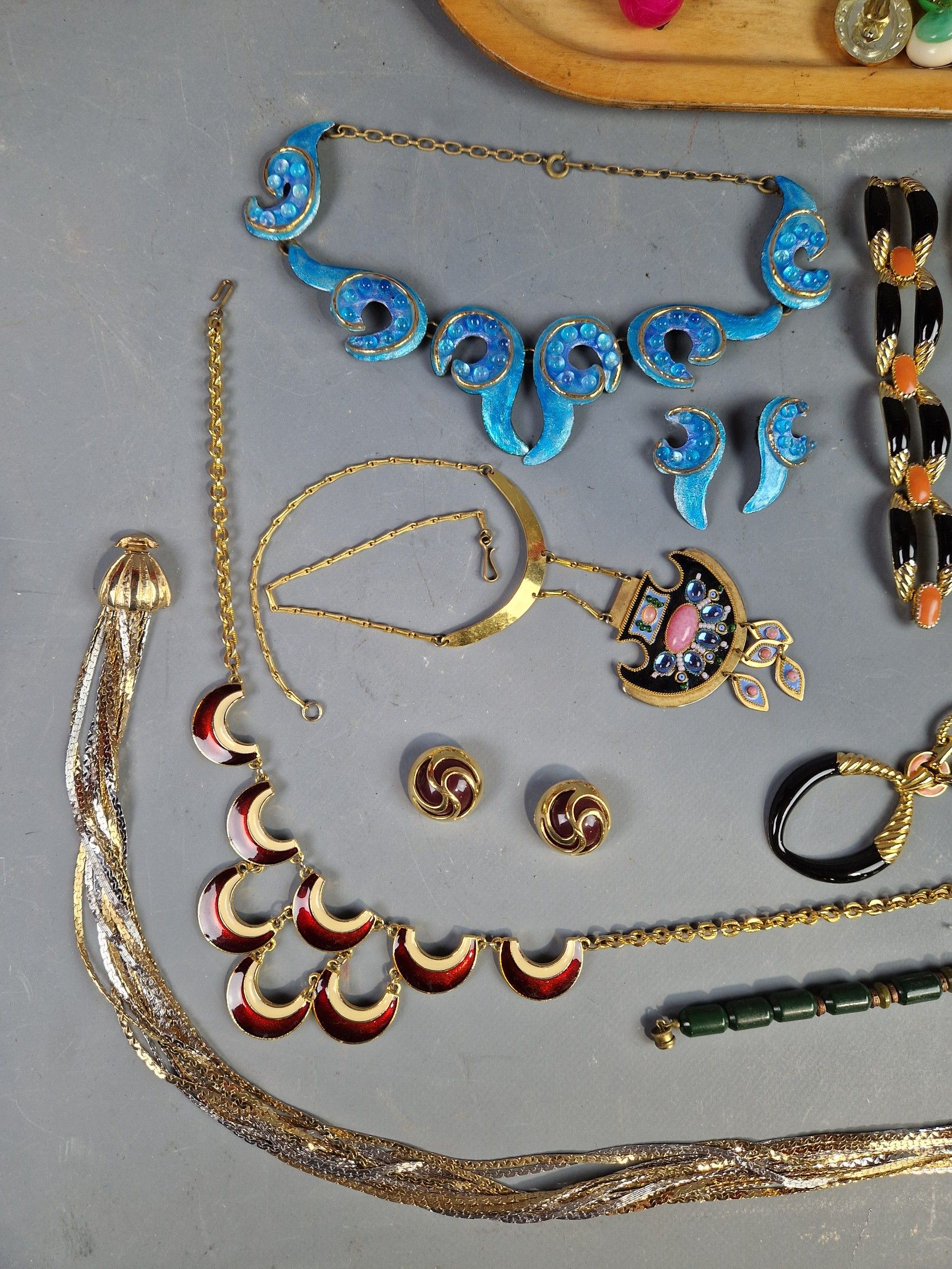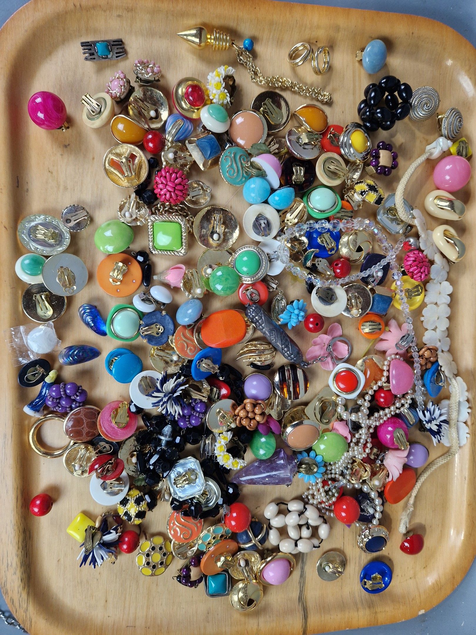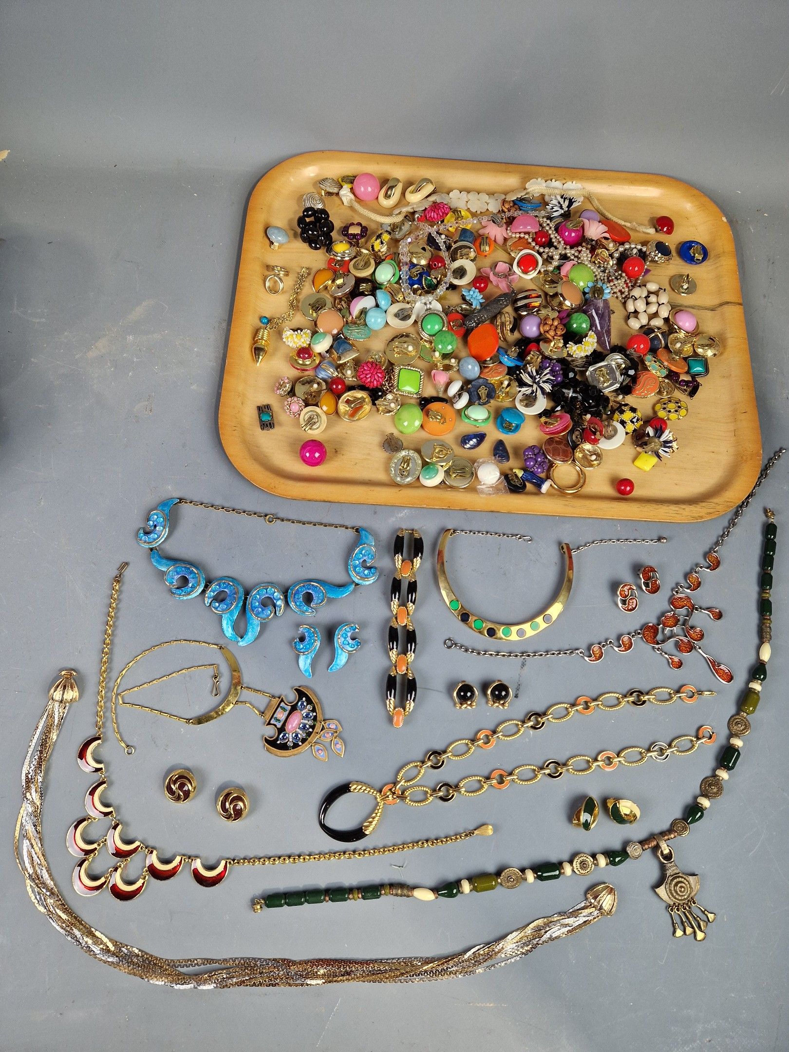 Beau lot de bijoux fantaisie des années 1970/1980 comprenant des colliers draperie dont un en émail turquoise signé Geneviève France et nombreux clips d'oreilles polychromes