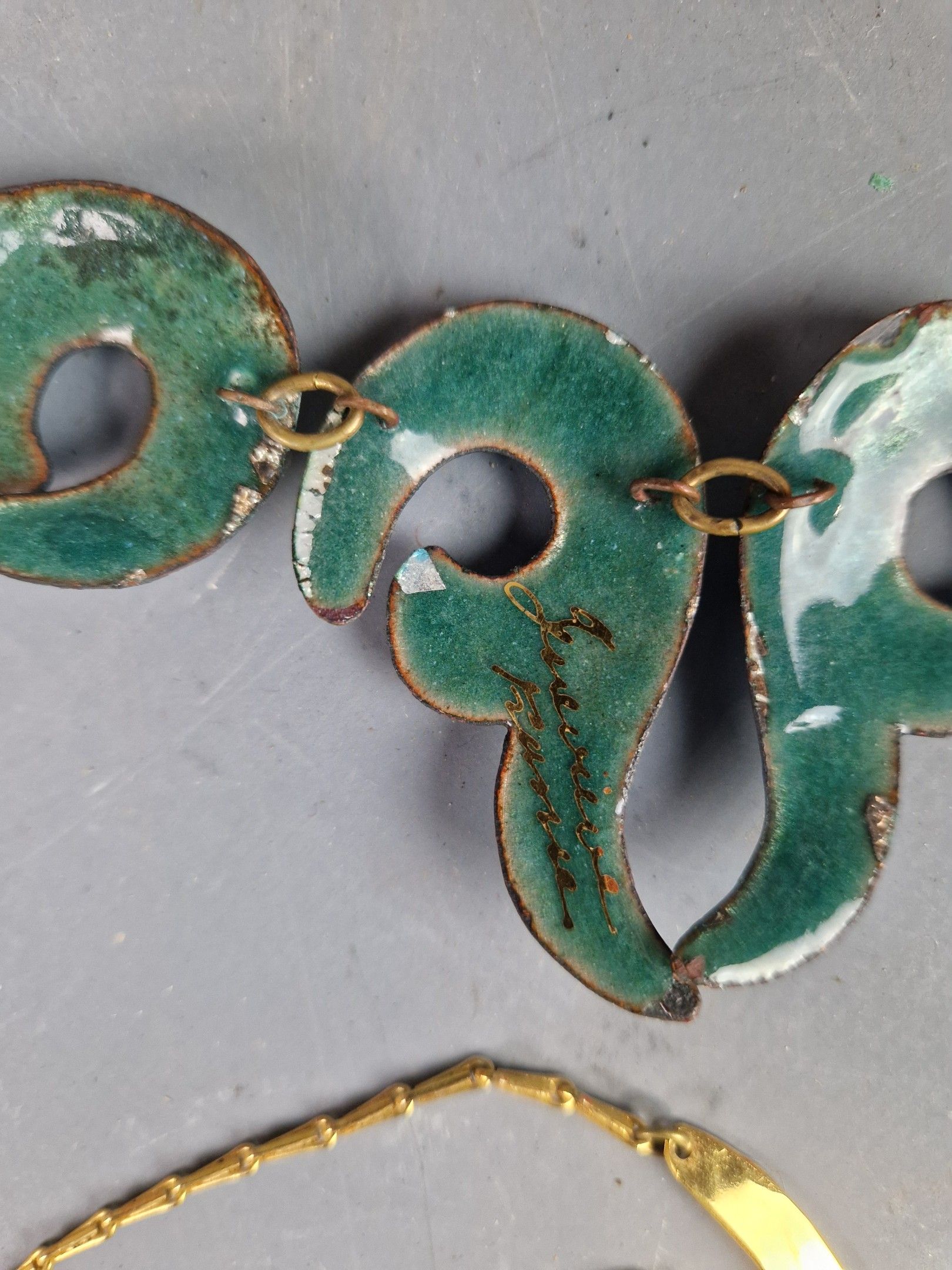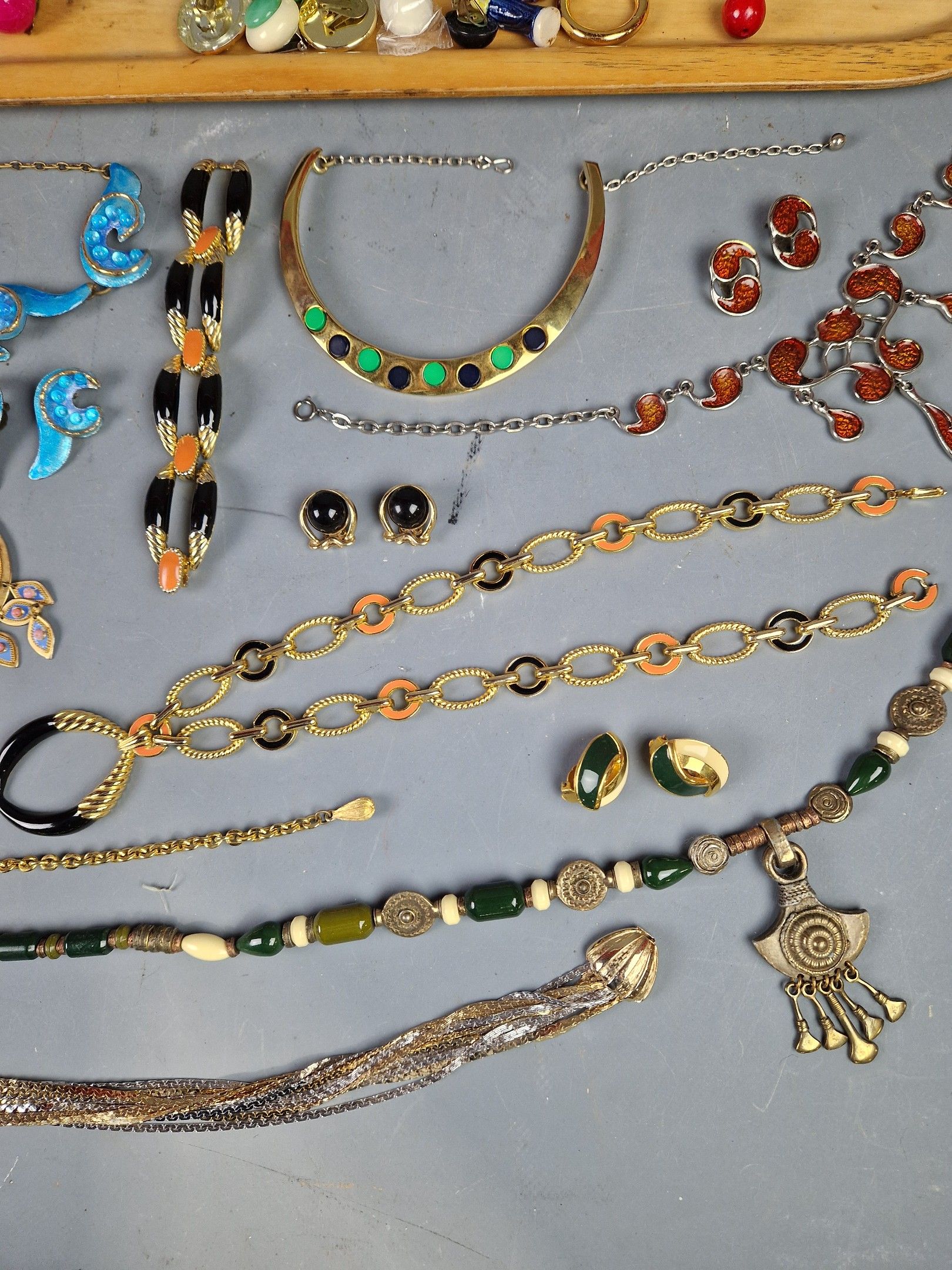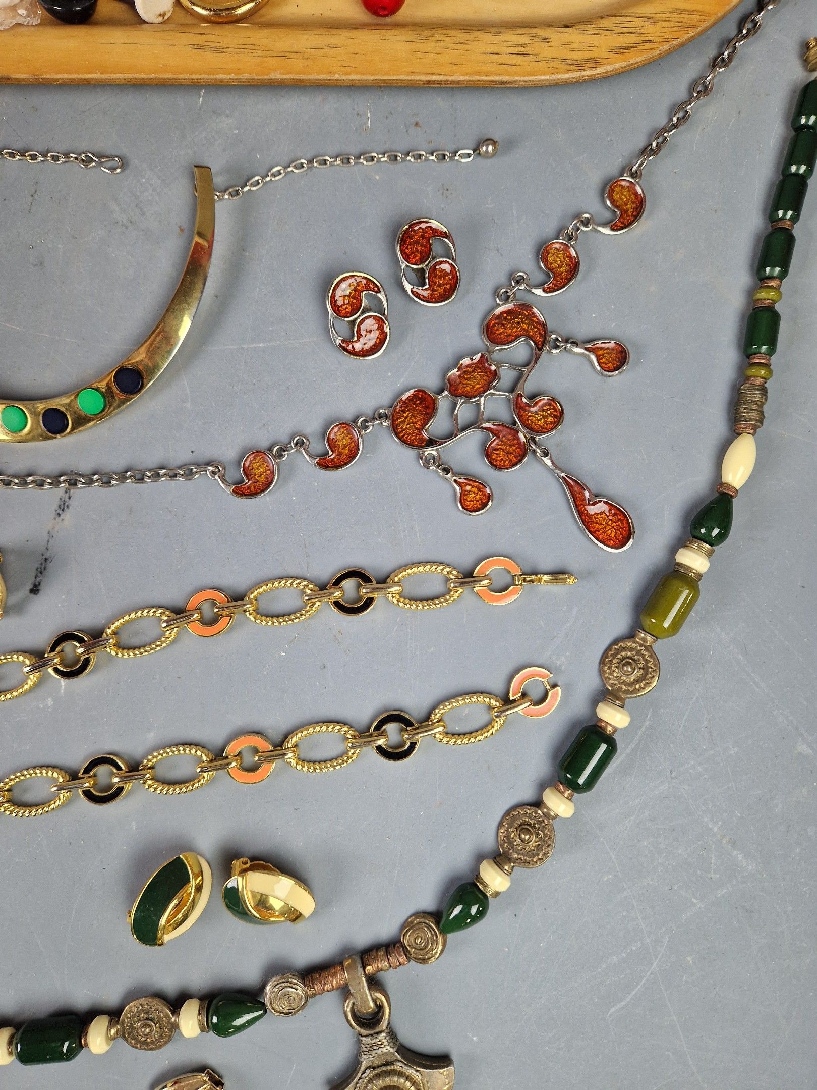 Beau lot de bijoux fantaisie des années 1970/1980 comprenant des colliers draperie dont un en émail turquoise signé Geneviève France et nombreux clips d'oreilles polychromes