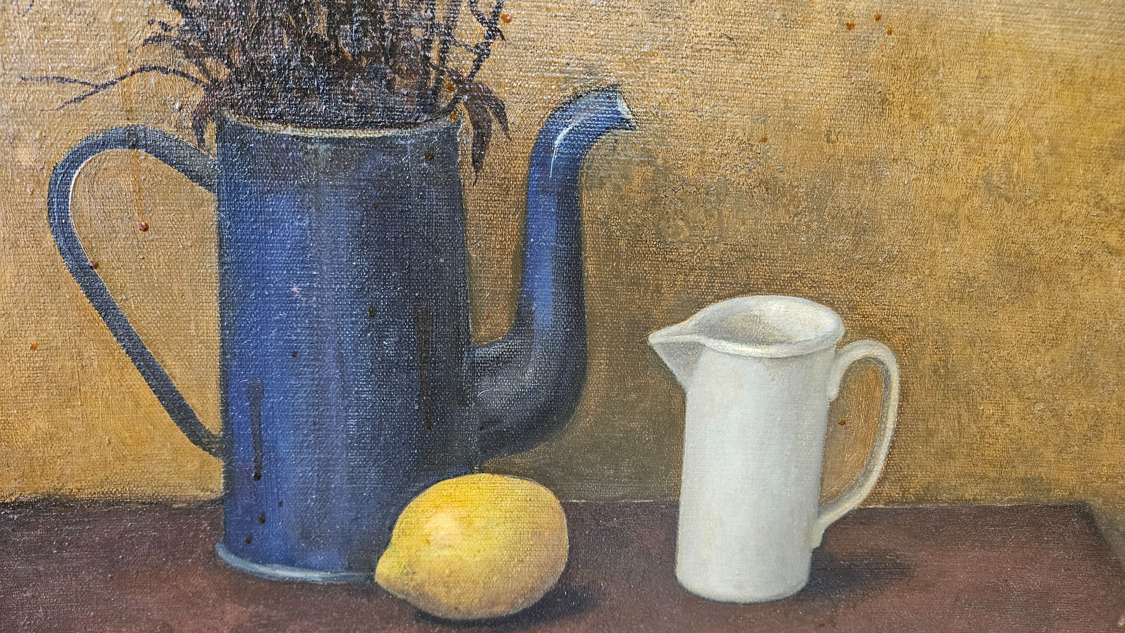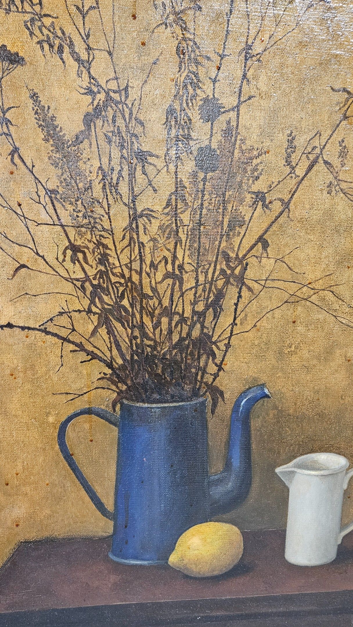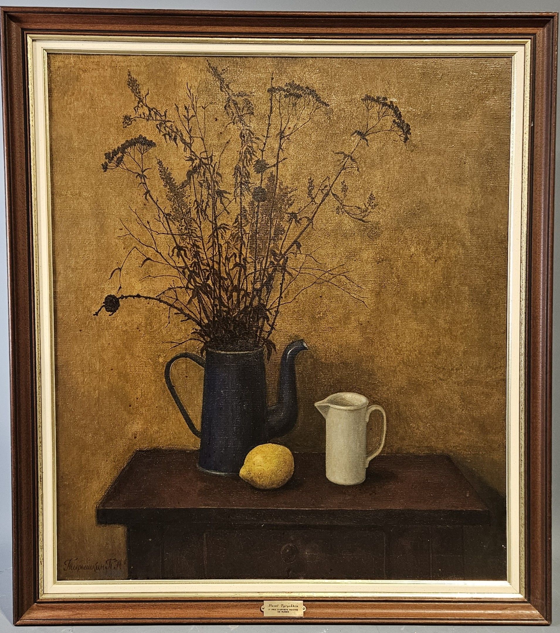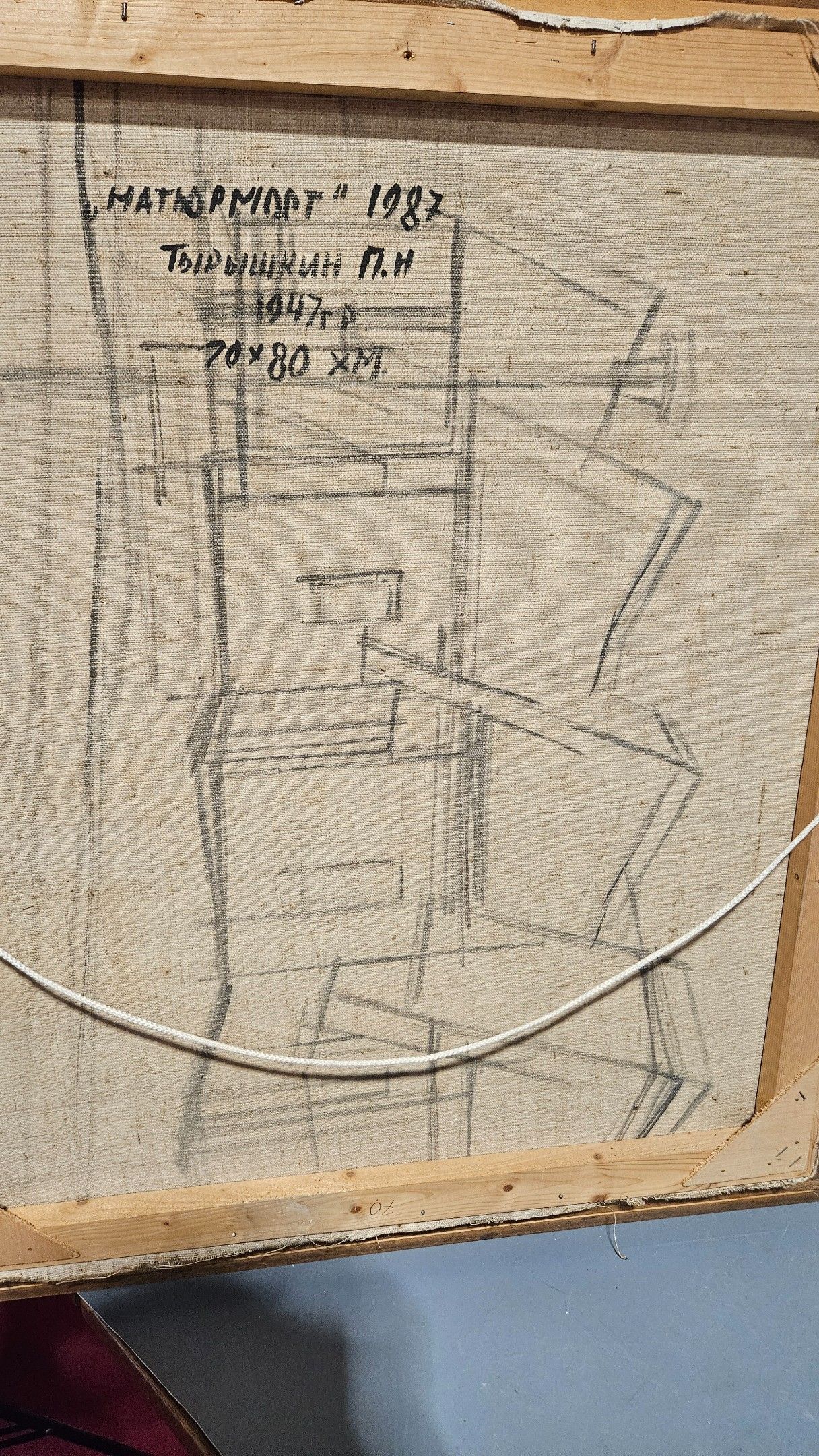 Pavel TYRYSHKIN, Ecole russe contemporaine : "Composition aux verseuses, fleurs fanées et citron sur un buffet". Huile sur toile, SBG, annotée en cyrillique au dos et datée 1987, 80 x 70 cm
