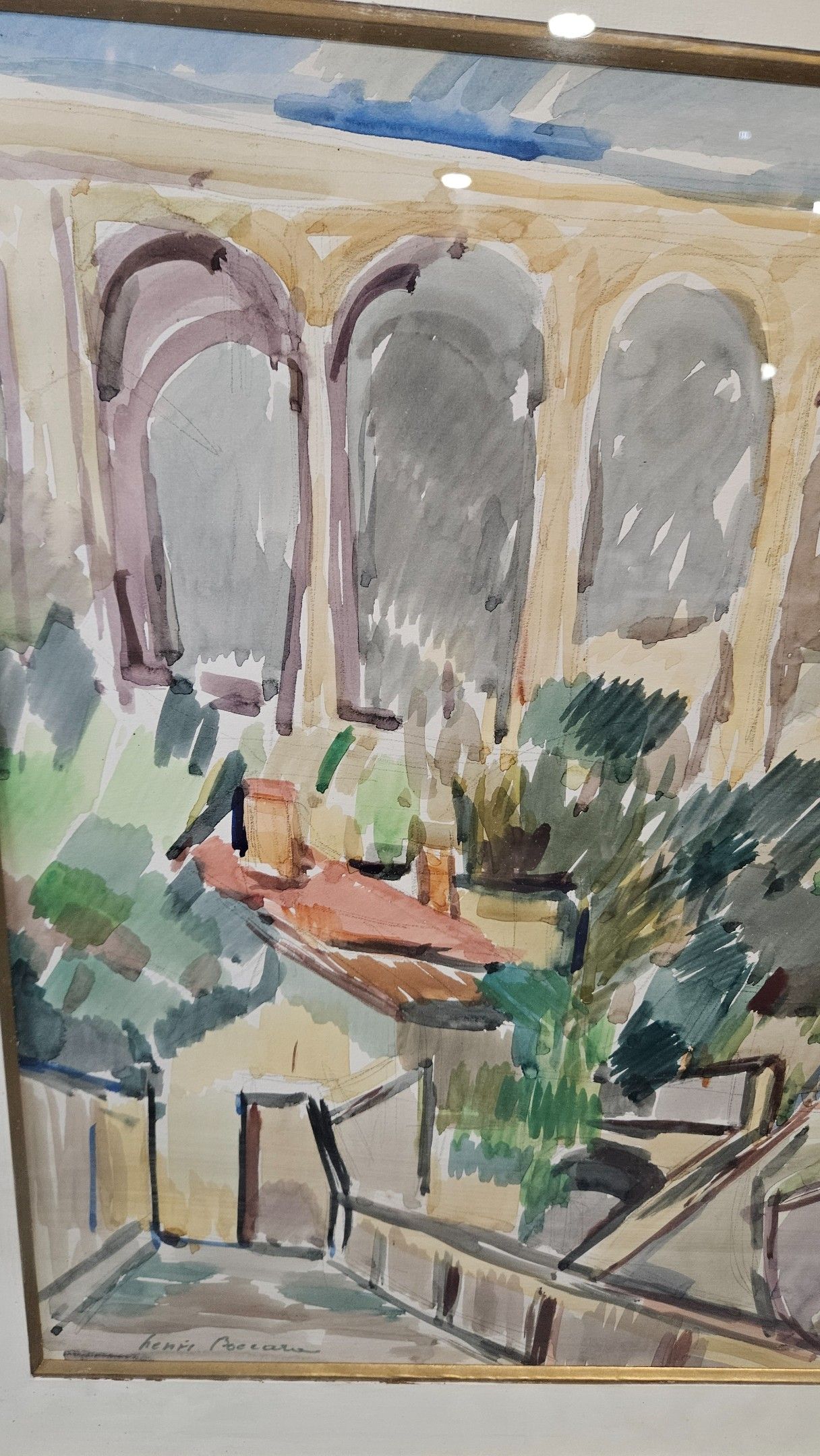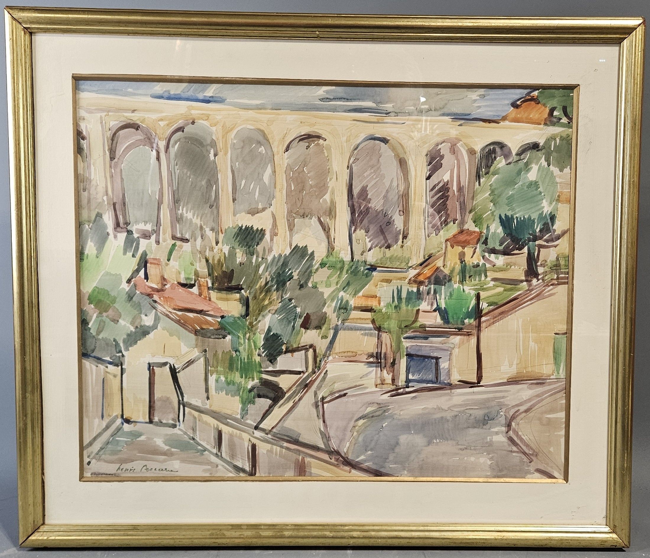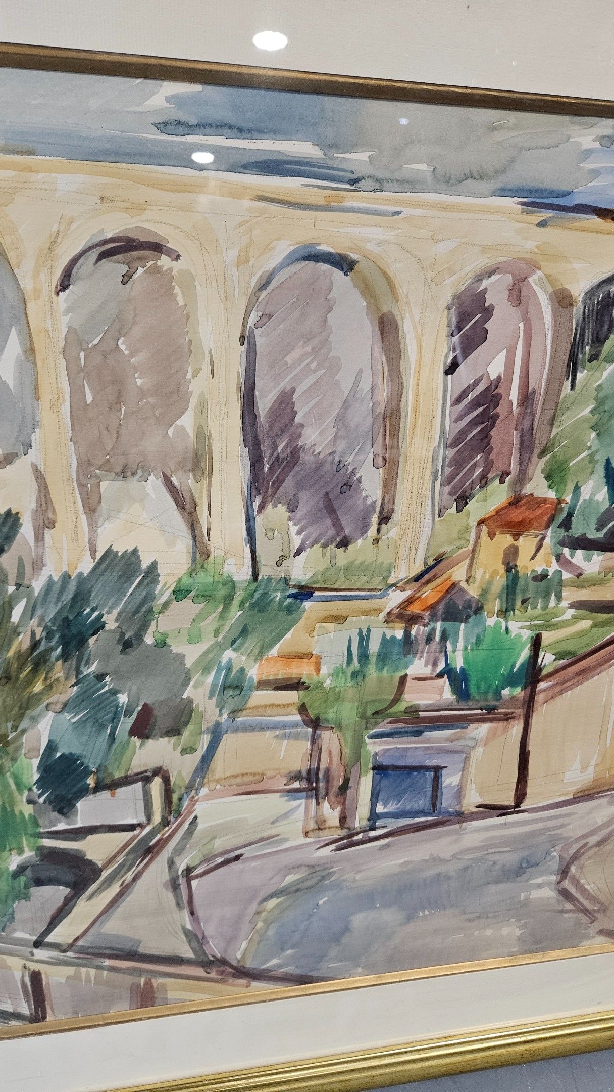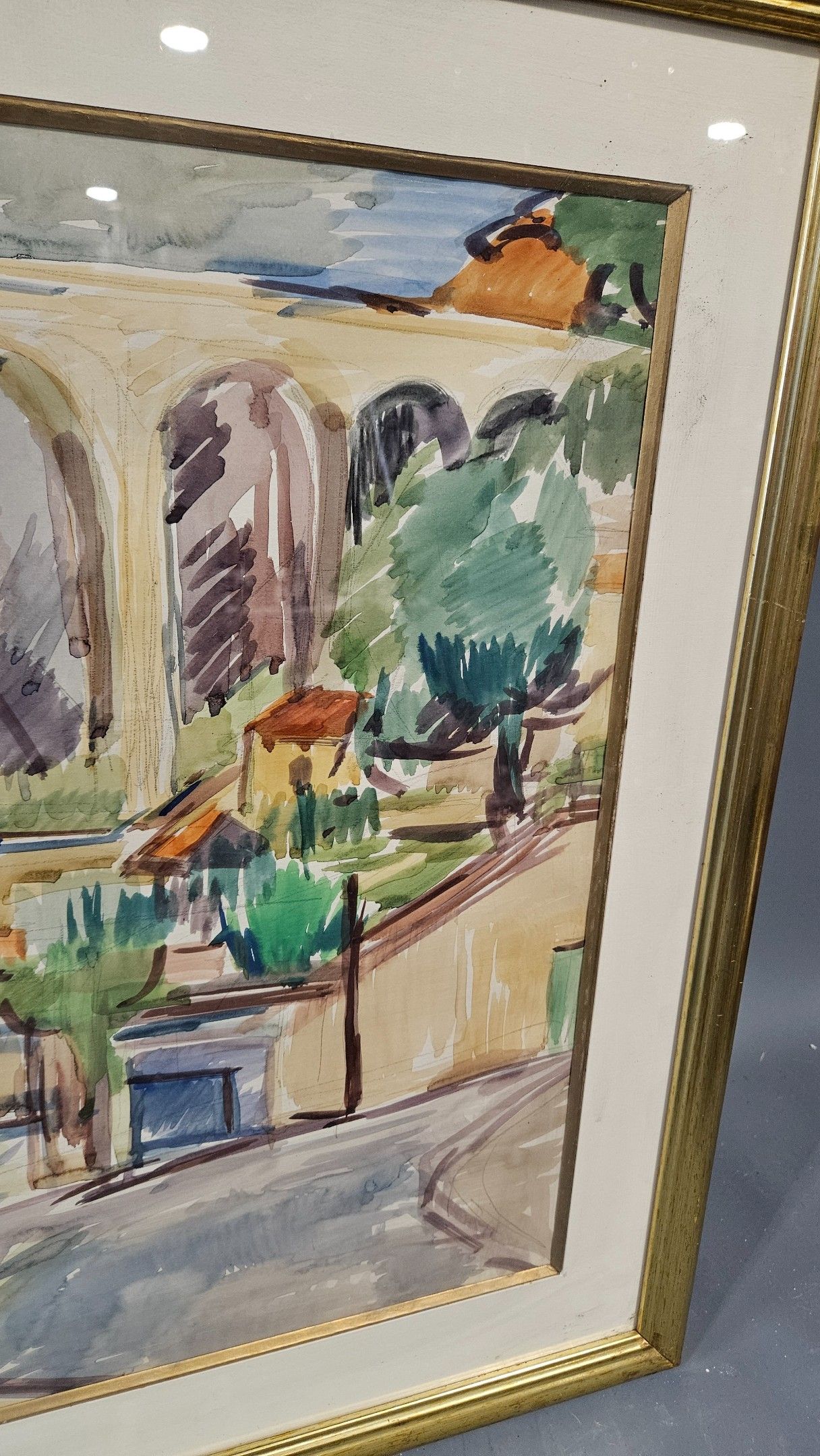 Ecole provençale moderne : "Village à l'aqueduc". Aquarelle, SBG, 47,5 x 59,5 cm à vue