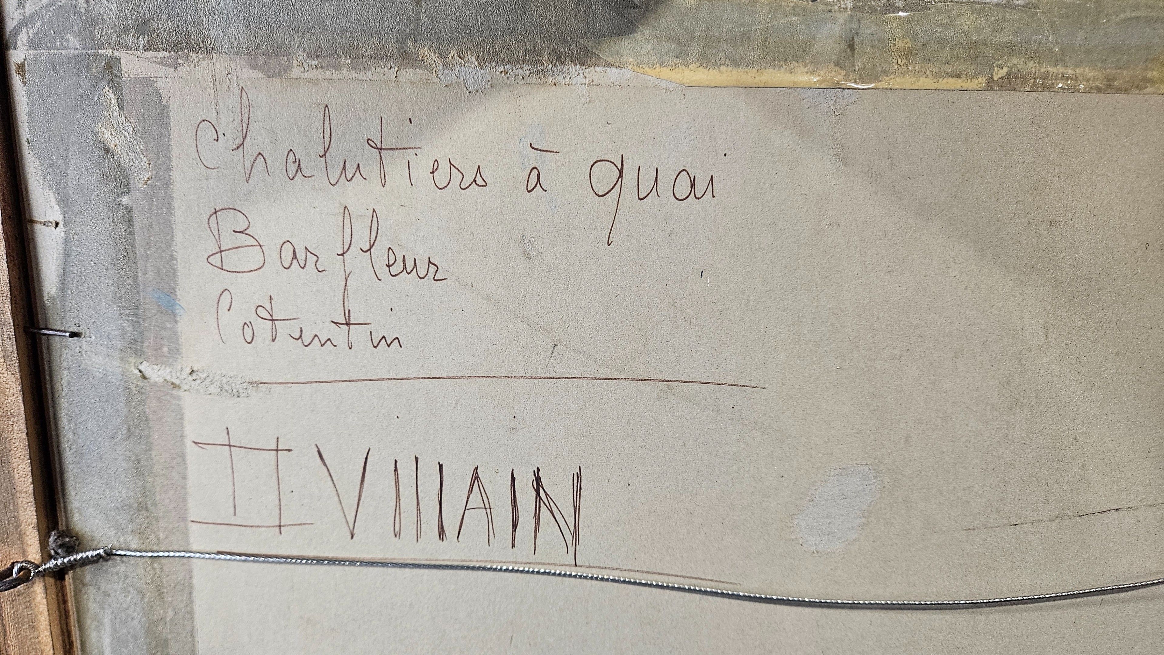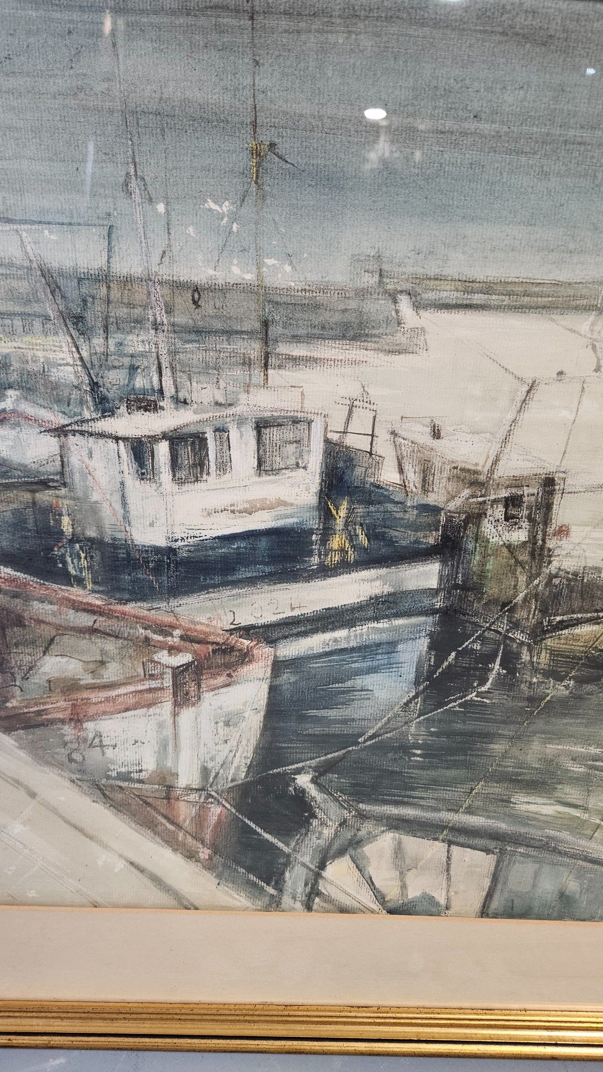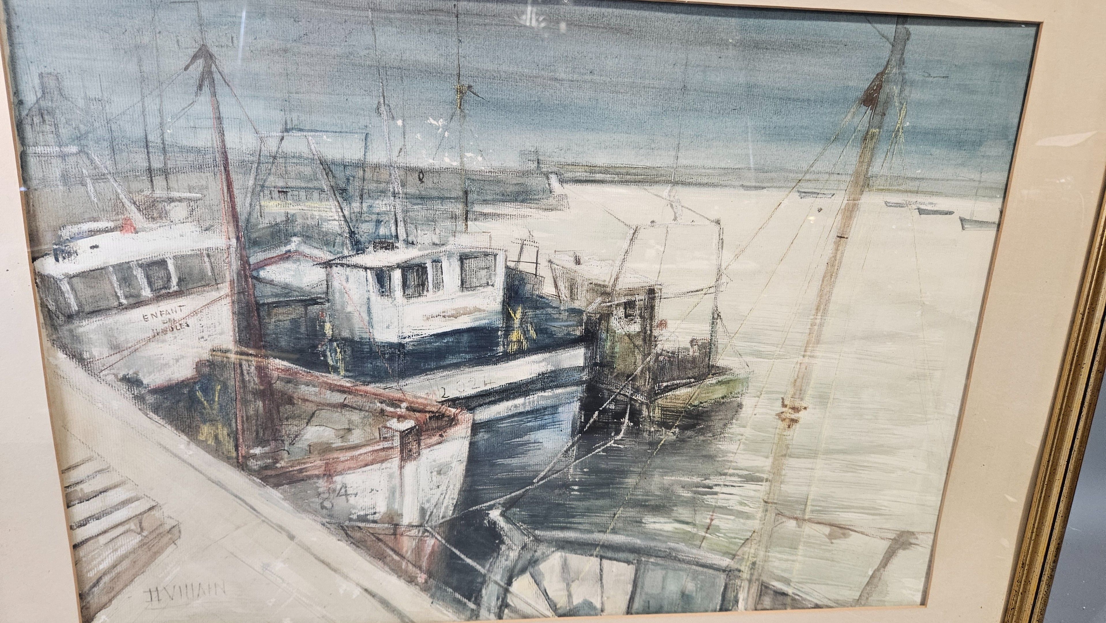 Désiré VILLAIN, Ecole moderne : "Chalutiers à quai, Barfleur, Cotentin". Technique mixte sur papier, SBG, contresignée et titré au dos sur carton, 45 x 64,5 cm à vue