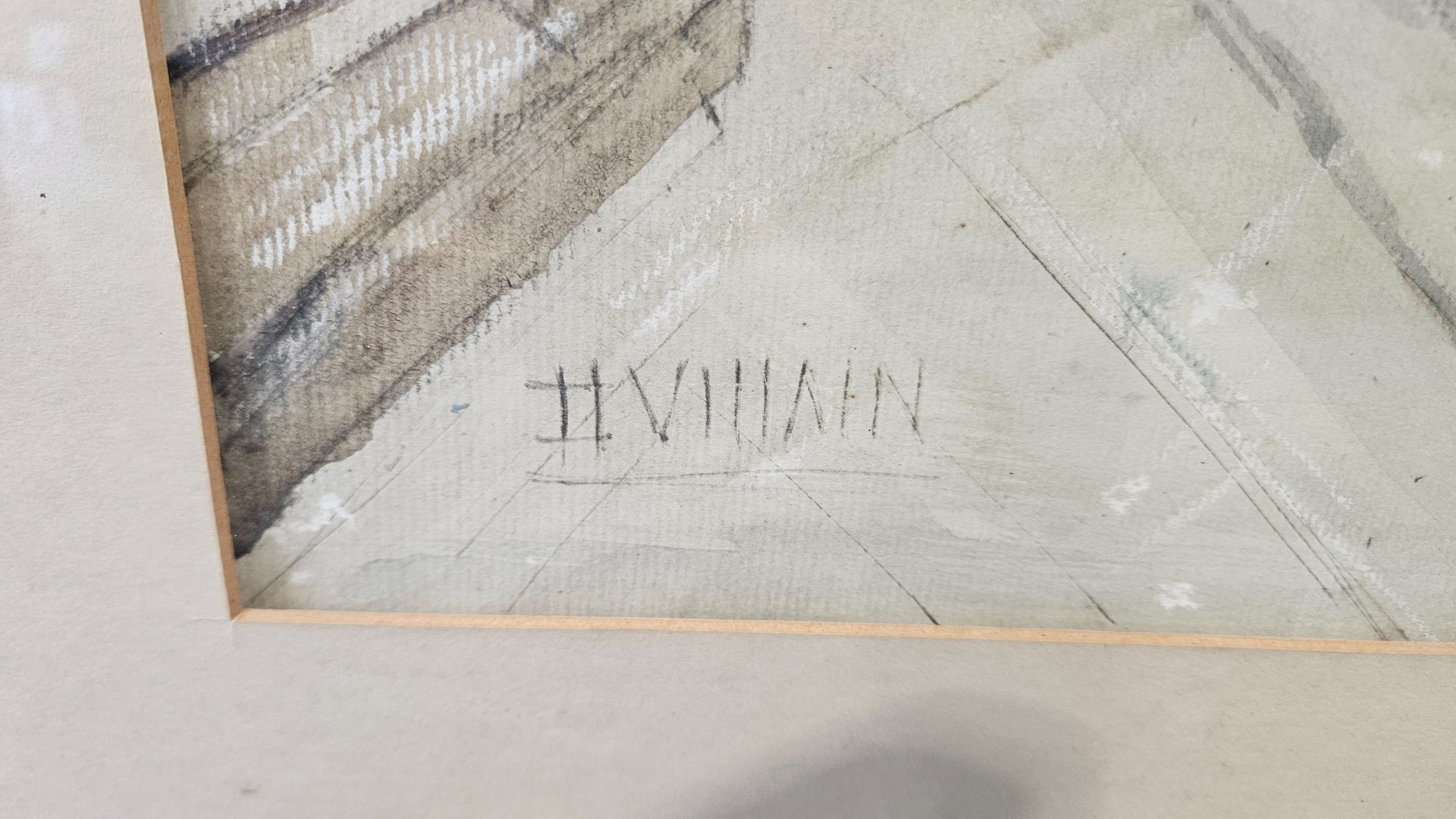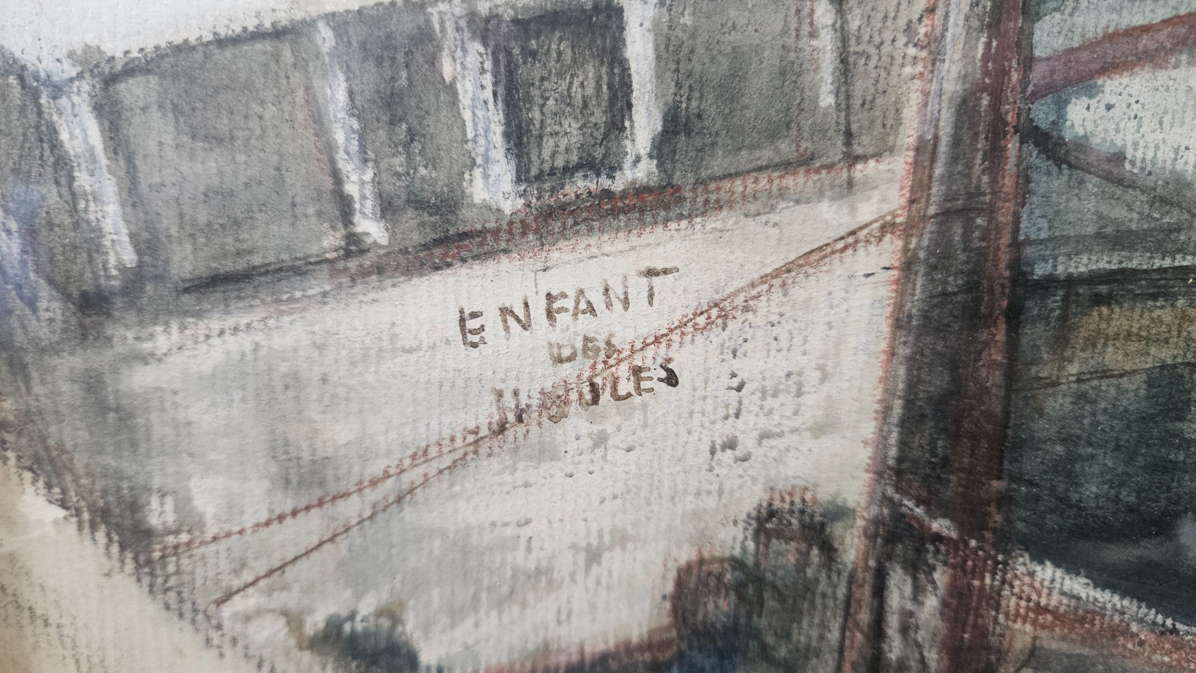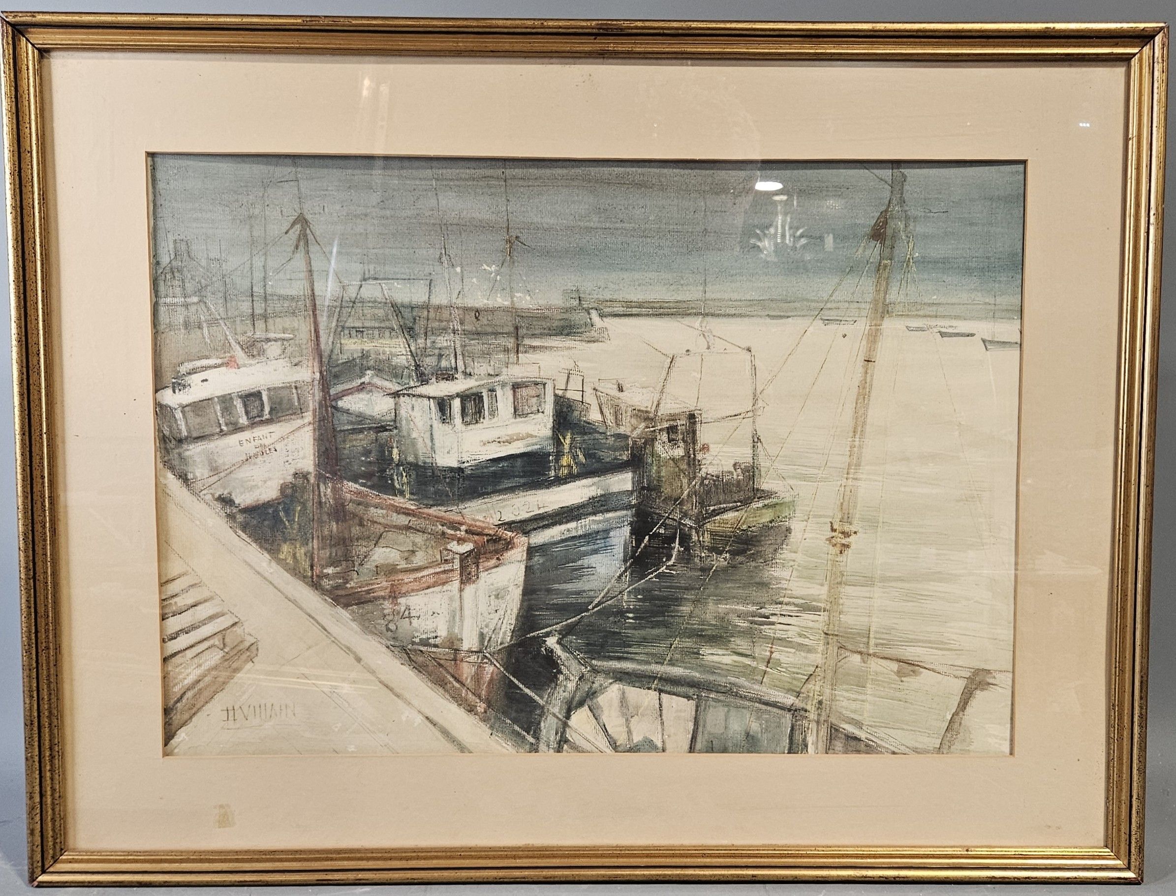 Désiré VILLAIN, Ecole moderne : "Chalutiers à quai, Barfleur, Cotentin". Technique mixte sur papier, SBG, contresignée et titré au dos sur carton, 45 x 64,5 cm à vue