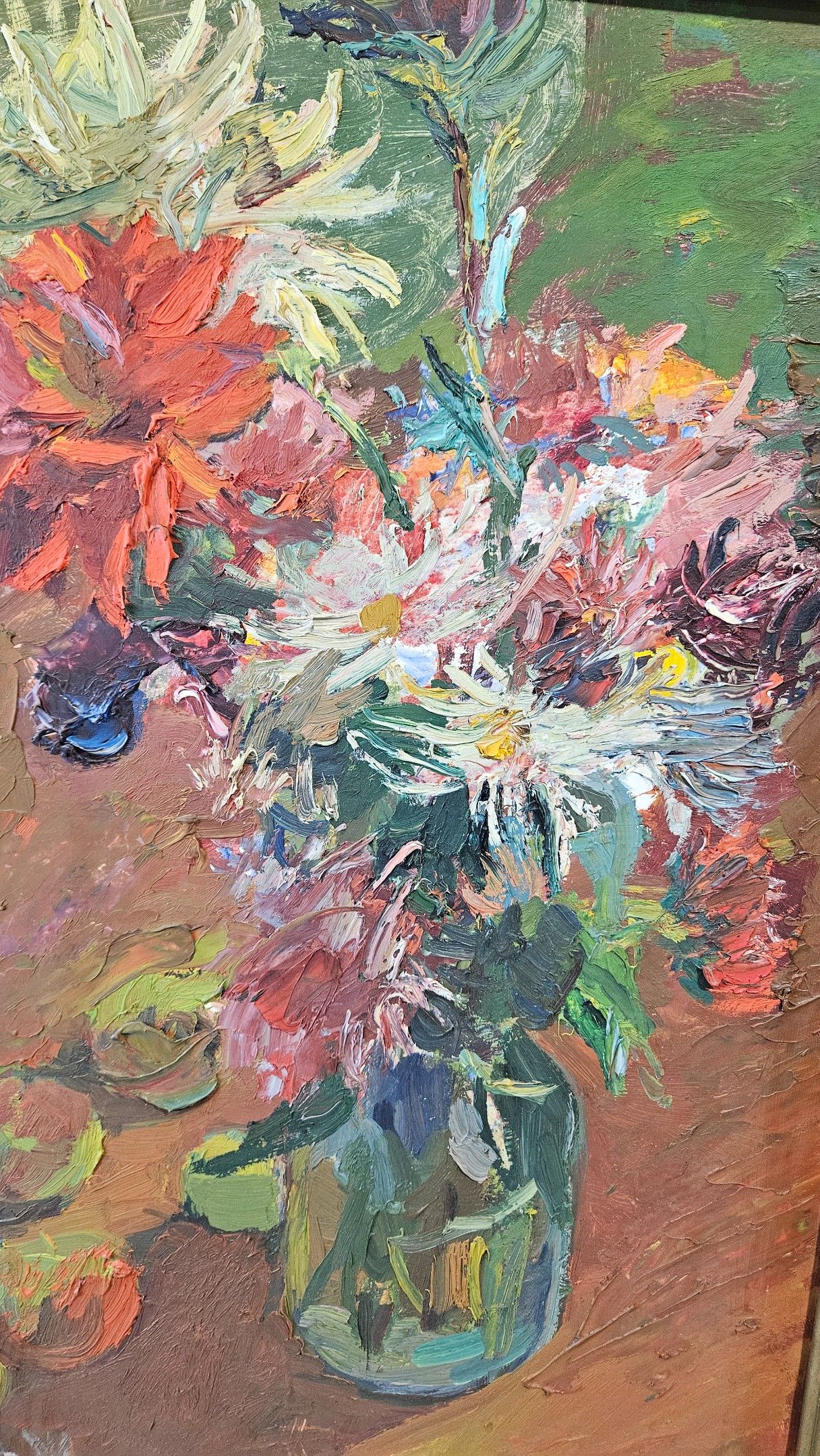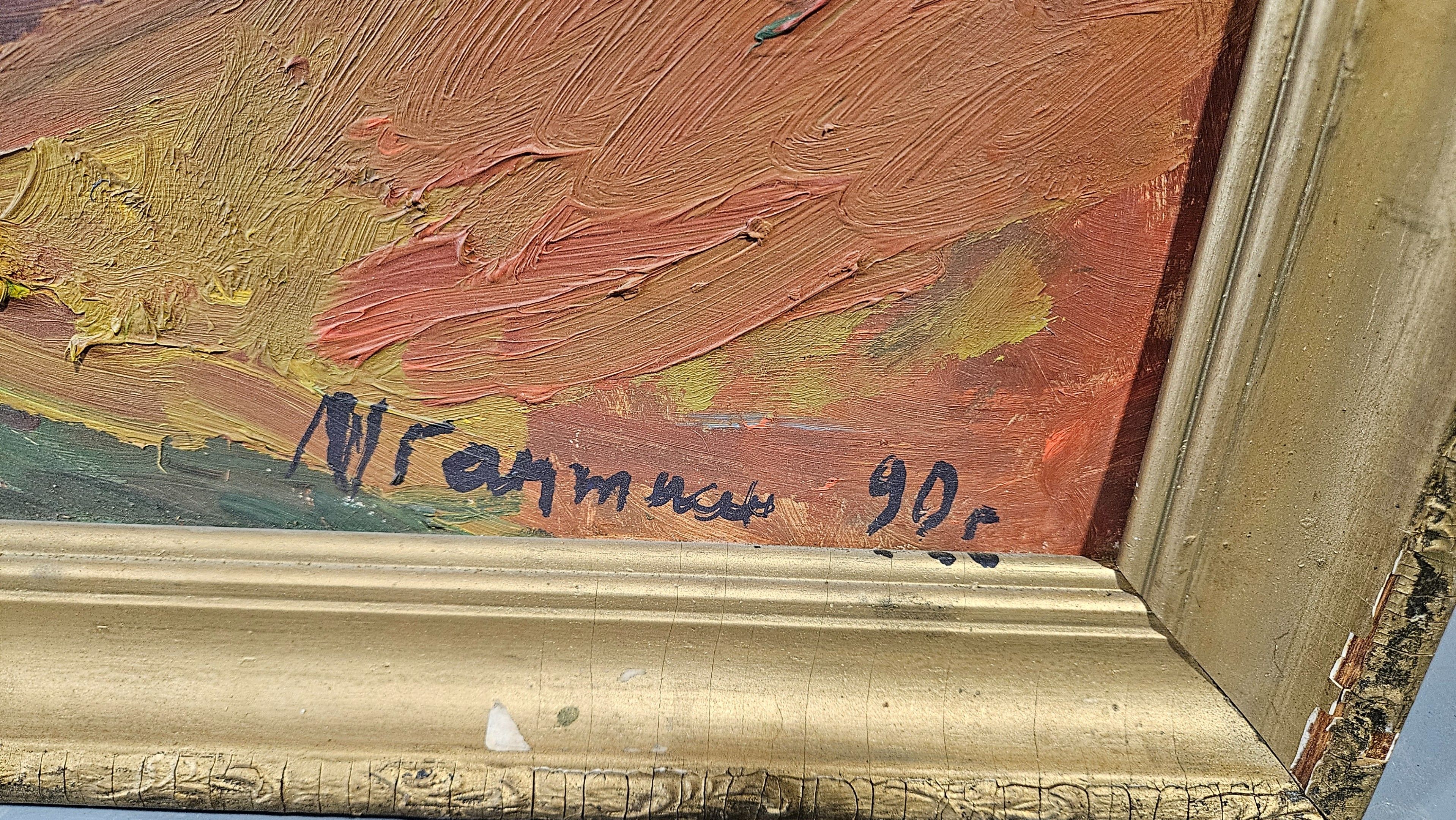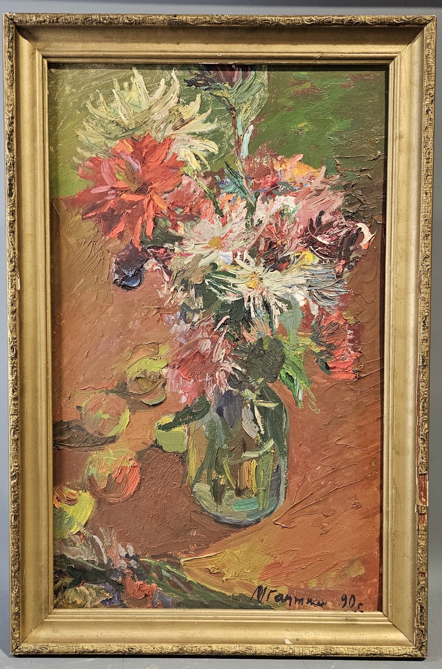 Ecole moderne : "Bouquet et fruits". Huile sur carton, SBD et datée (19)90, 80 x 50 cm