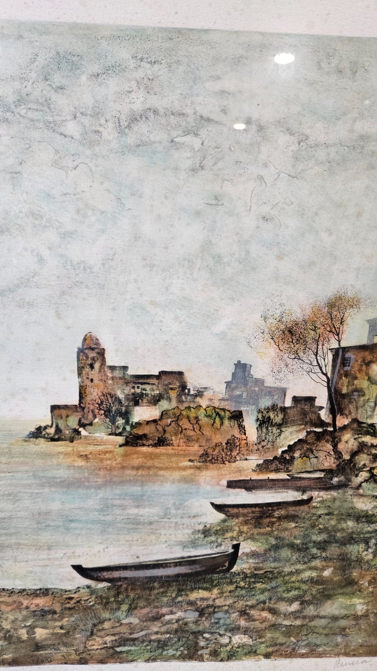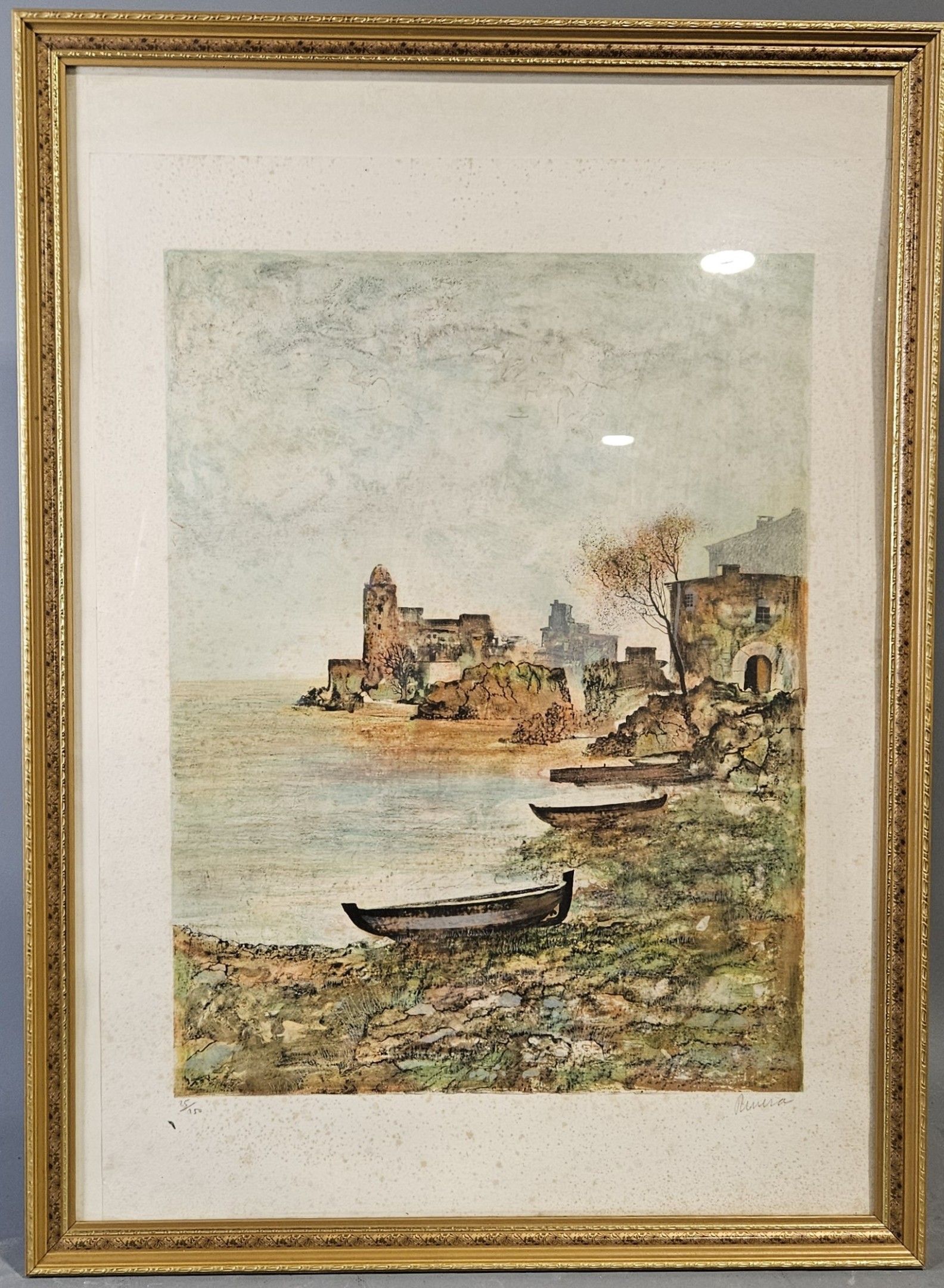 Ecole moderne : "Barques sur le rivage". Lithographie, contresignée et numérotée 25/250, 64 x 47,5 cm à vue. Rousseurs