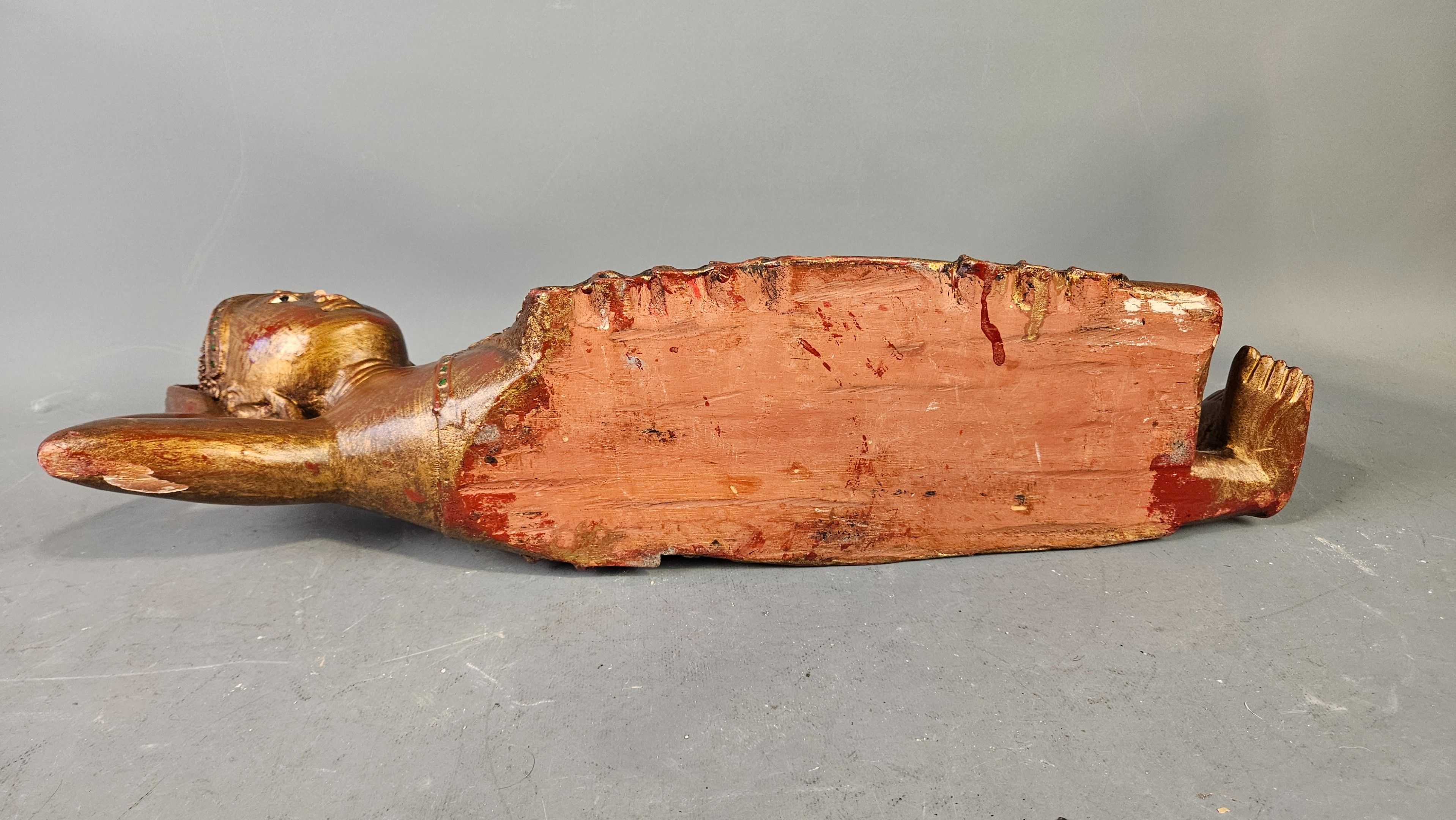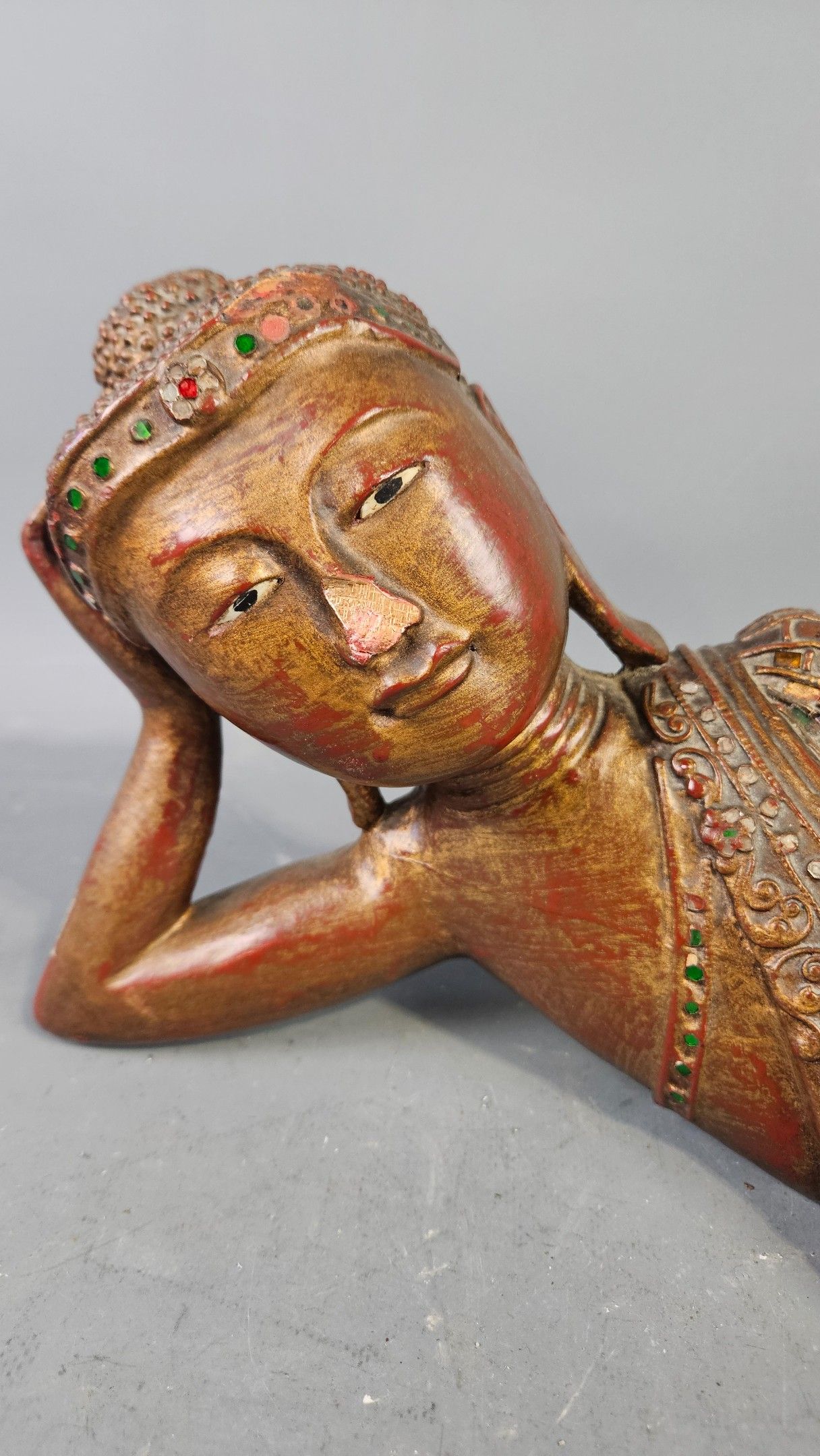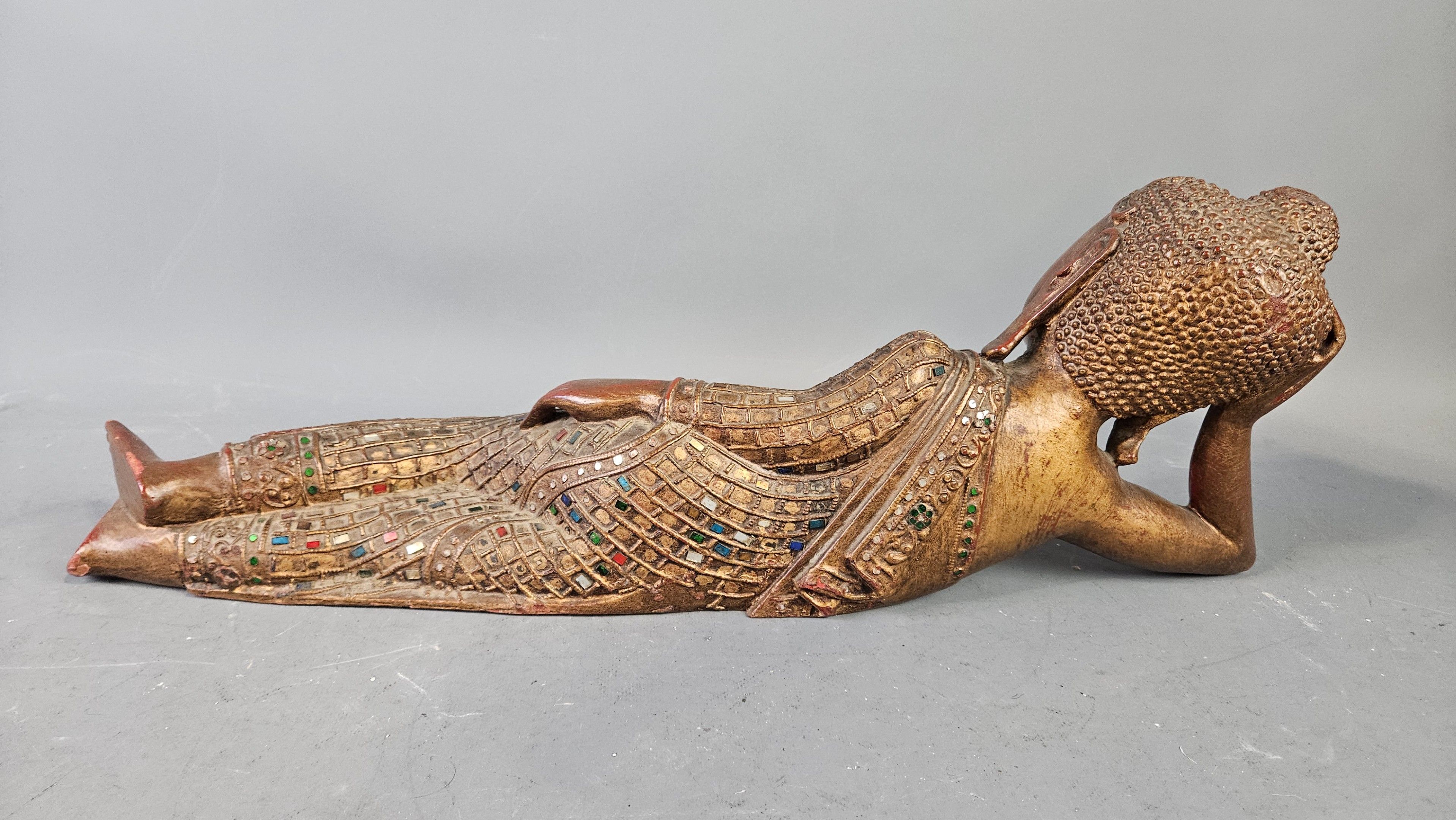 BIRMANIE, XXème : Bouddha allongé en bois sculpté polychromé et incrustation de verroterie. Longueur : 55 cm