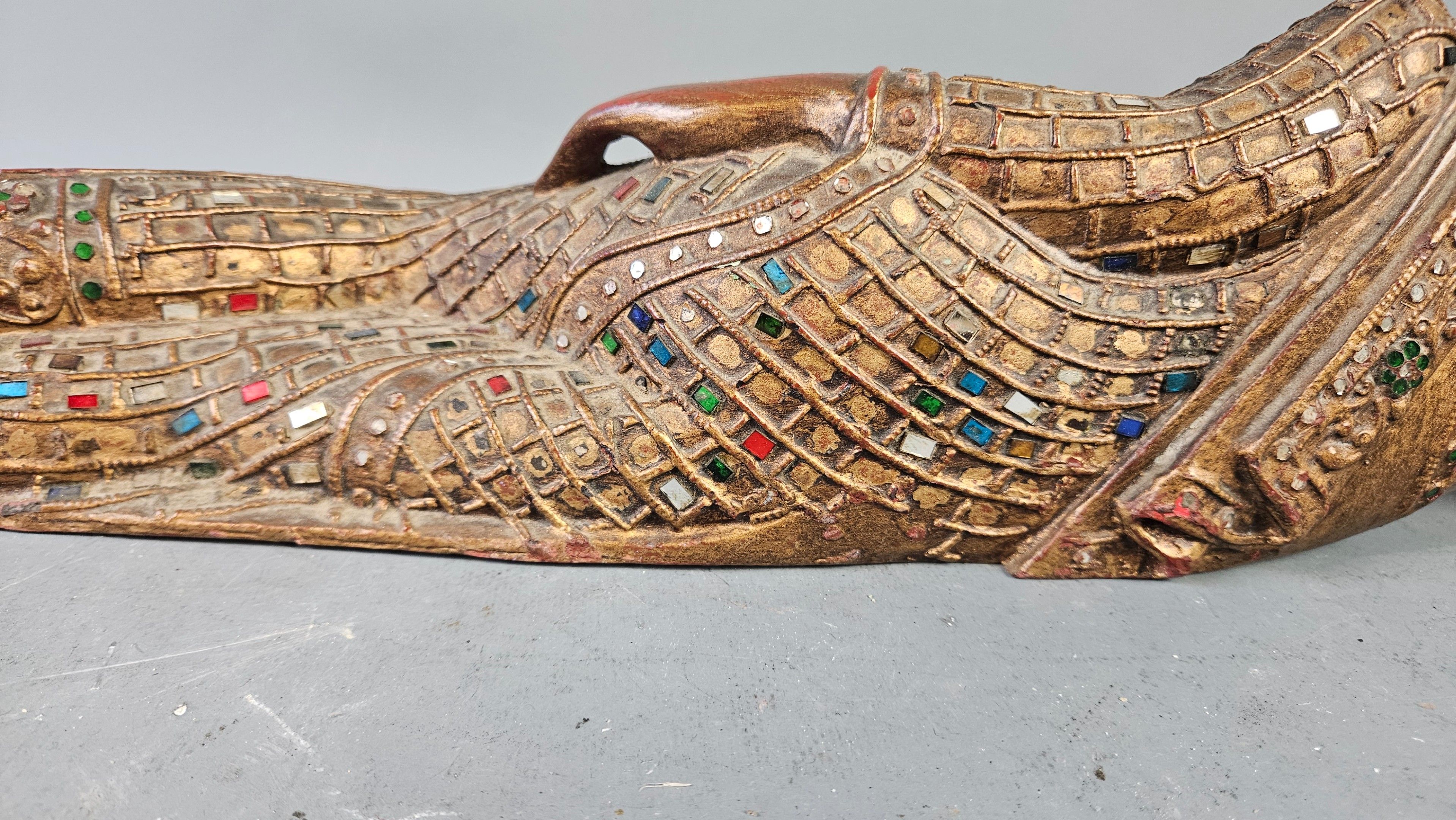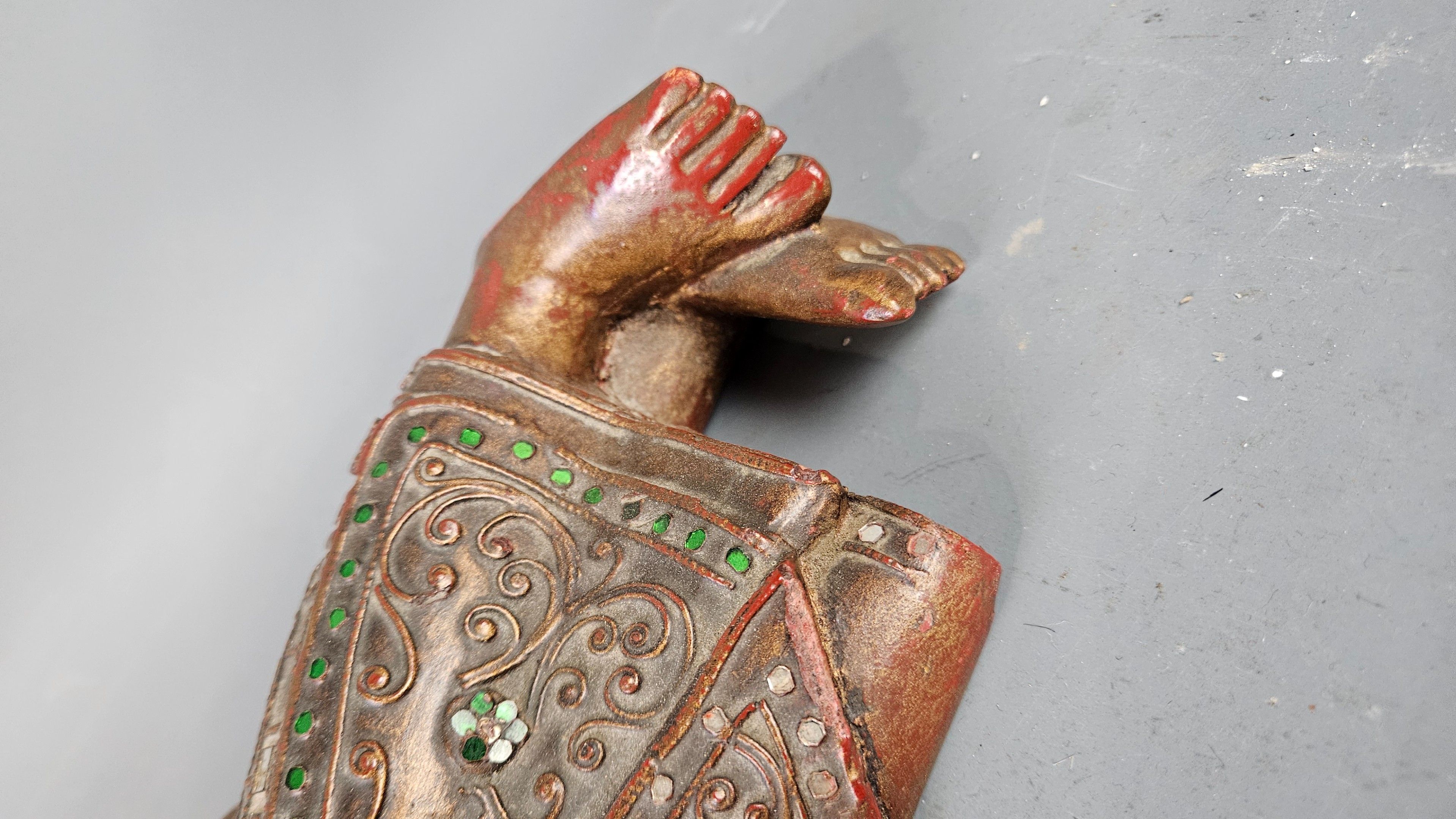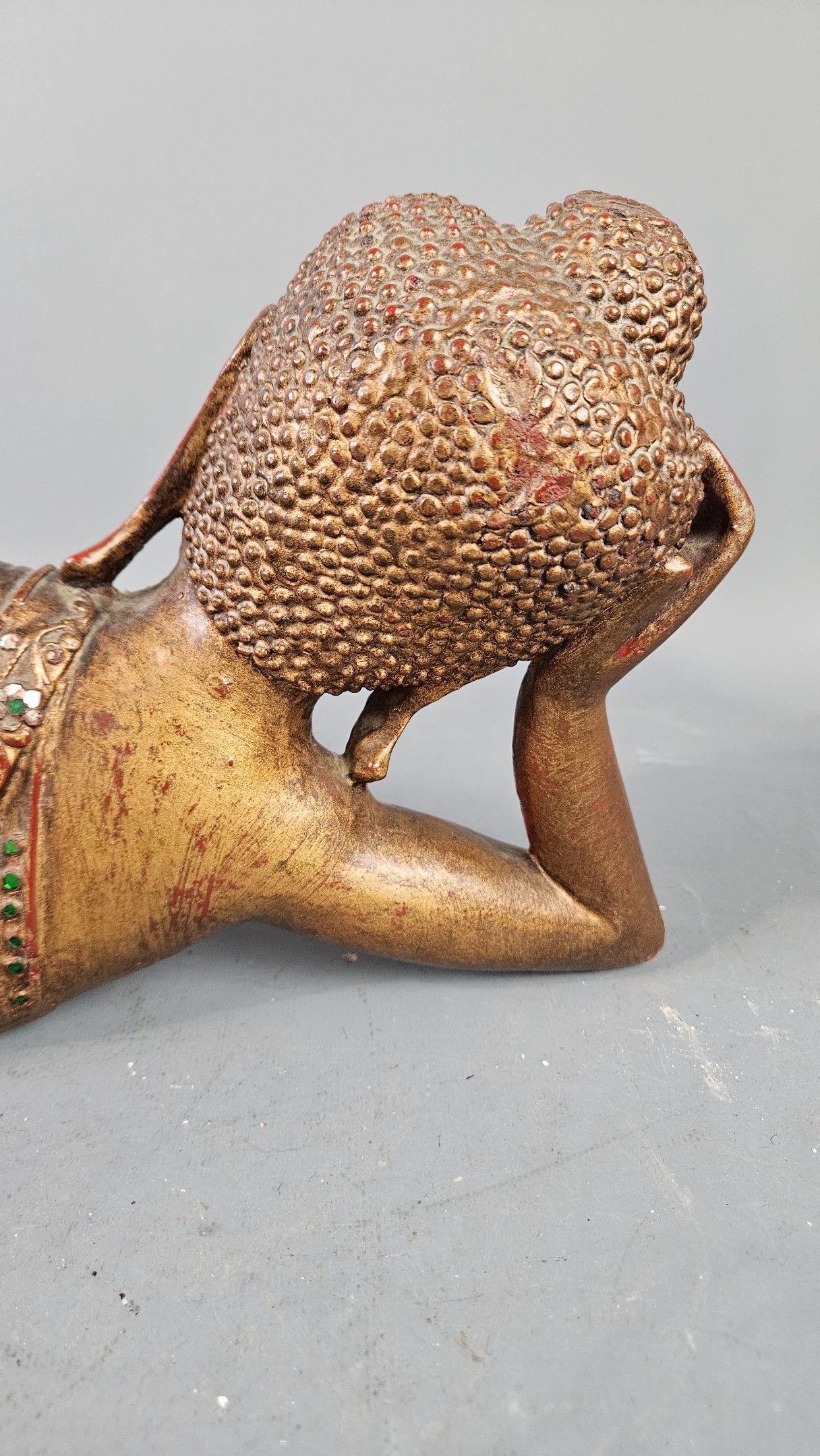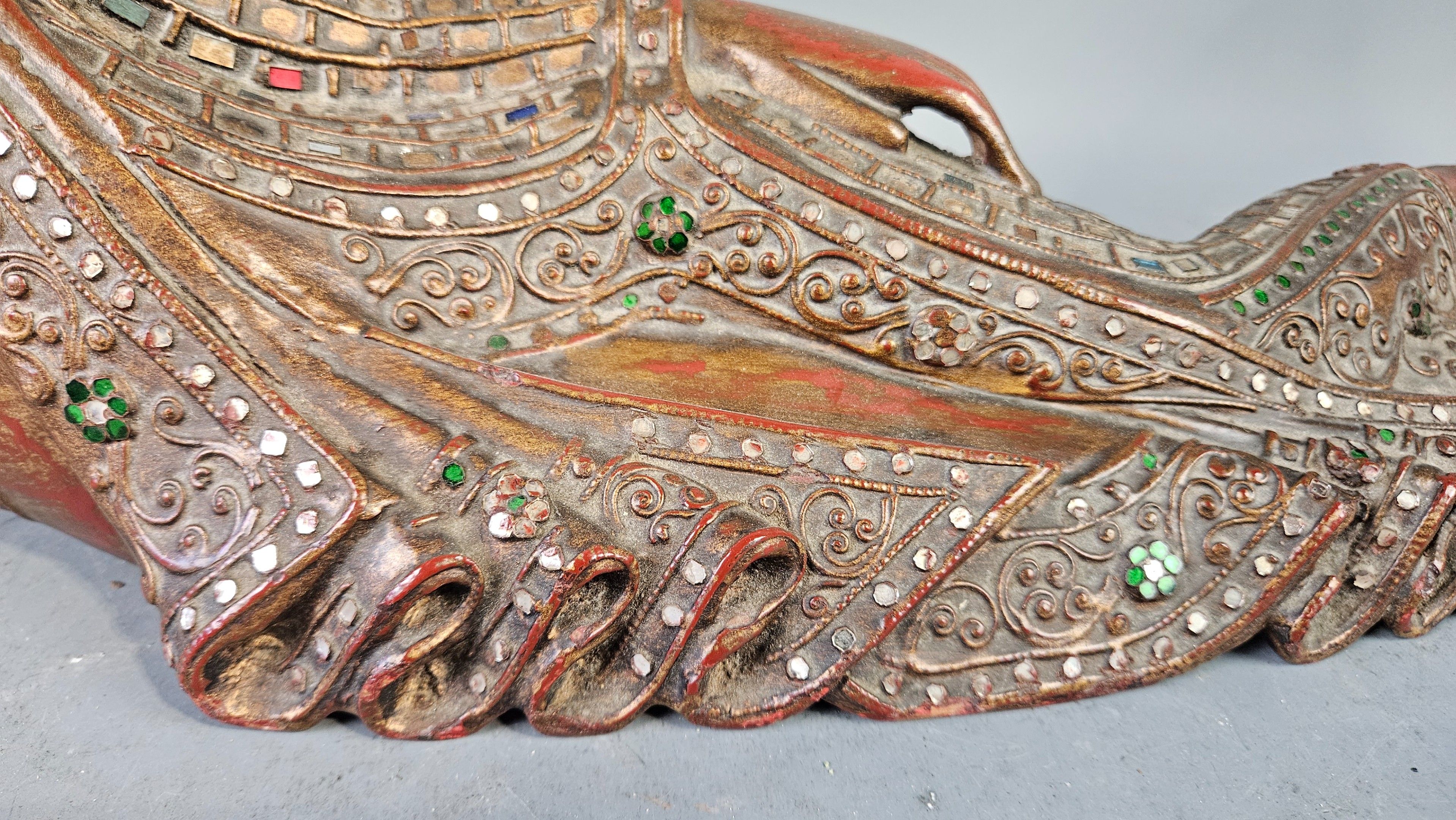 BIRMANIE, XXème : Bouddha allongé en bois sculpté polychromé et incrustation de verroterie. Longueur : 55 cm