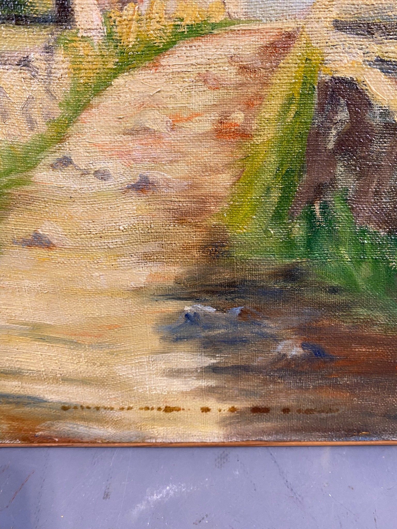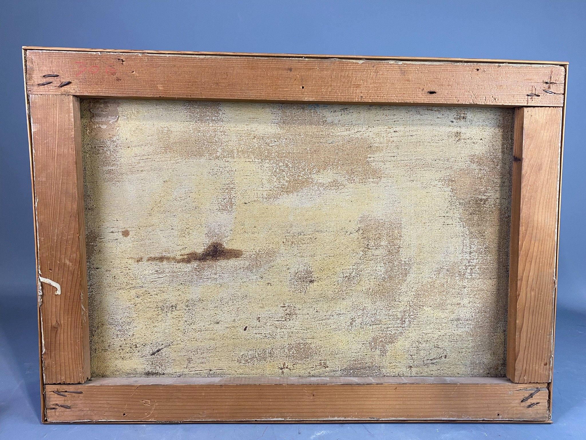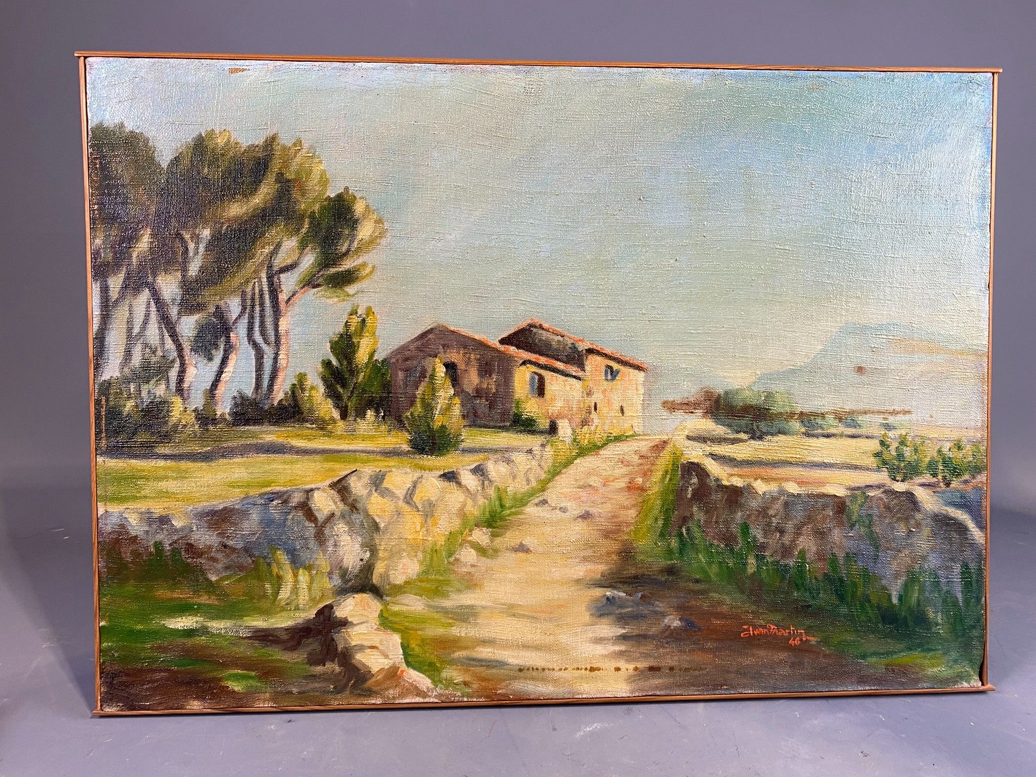 Peinture d'amateur figurant un mas en Provence. Huile sur toile, SBD. Quelques tâches à la toile. 46 x 62,5 cm