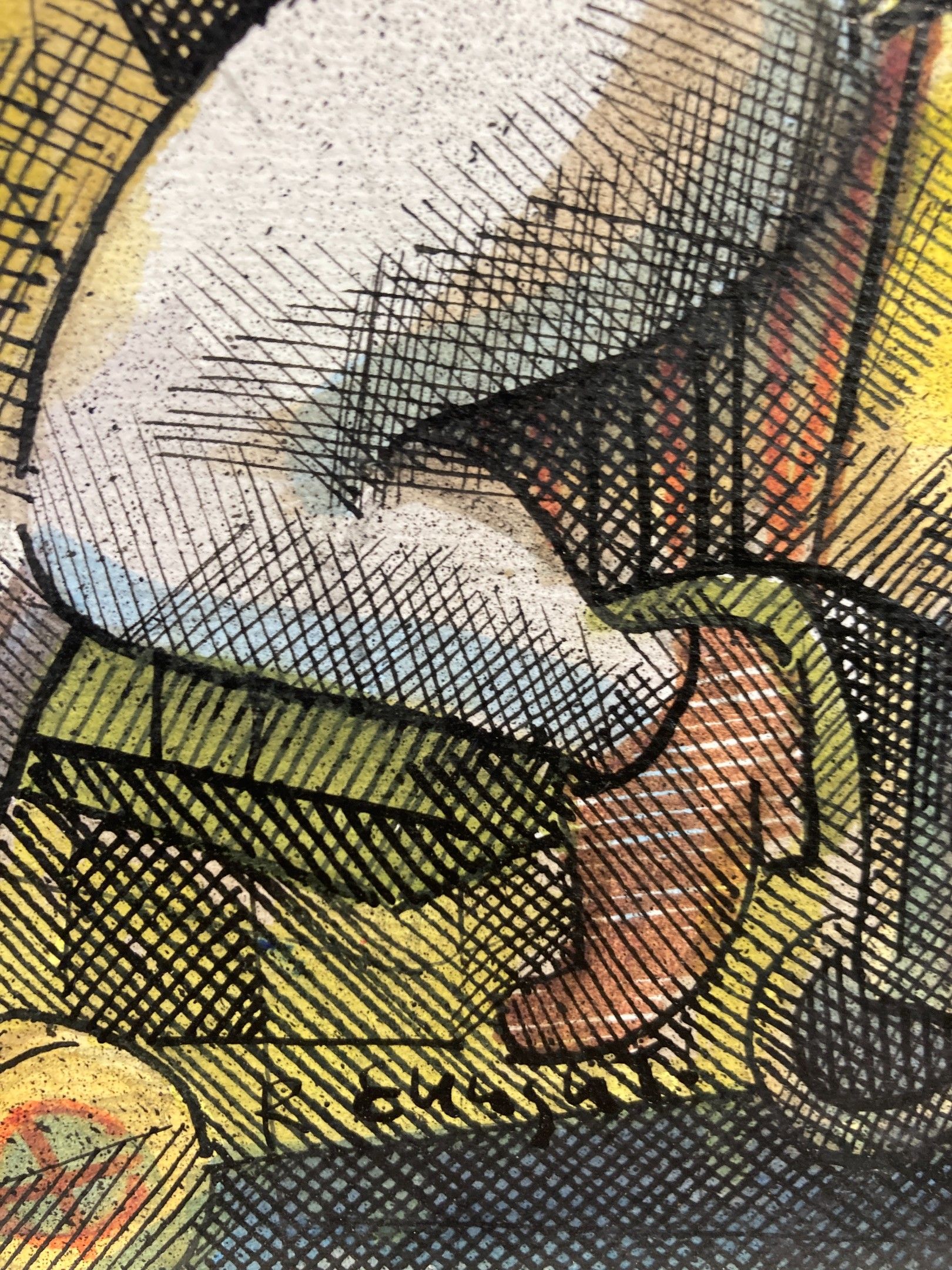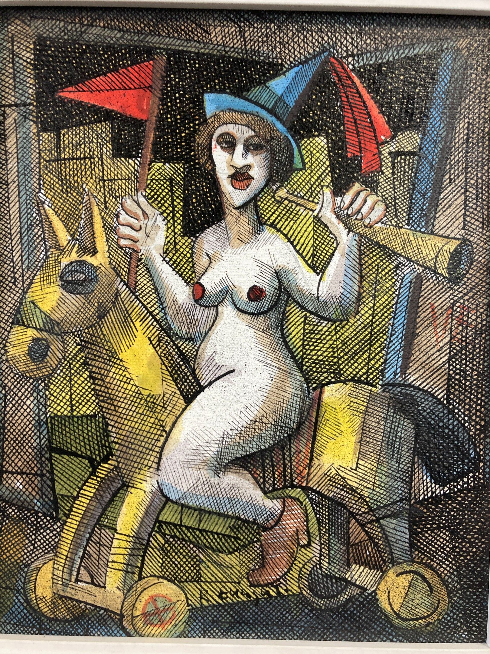 Ronald ENRIGHT (né en 1960) : "Le clown amazone". Technique mixte sur papier marouflé sur carton, SBM, 23,5 x 19,5 cm
