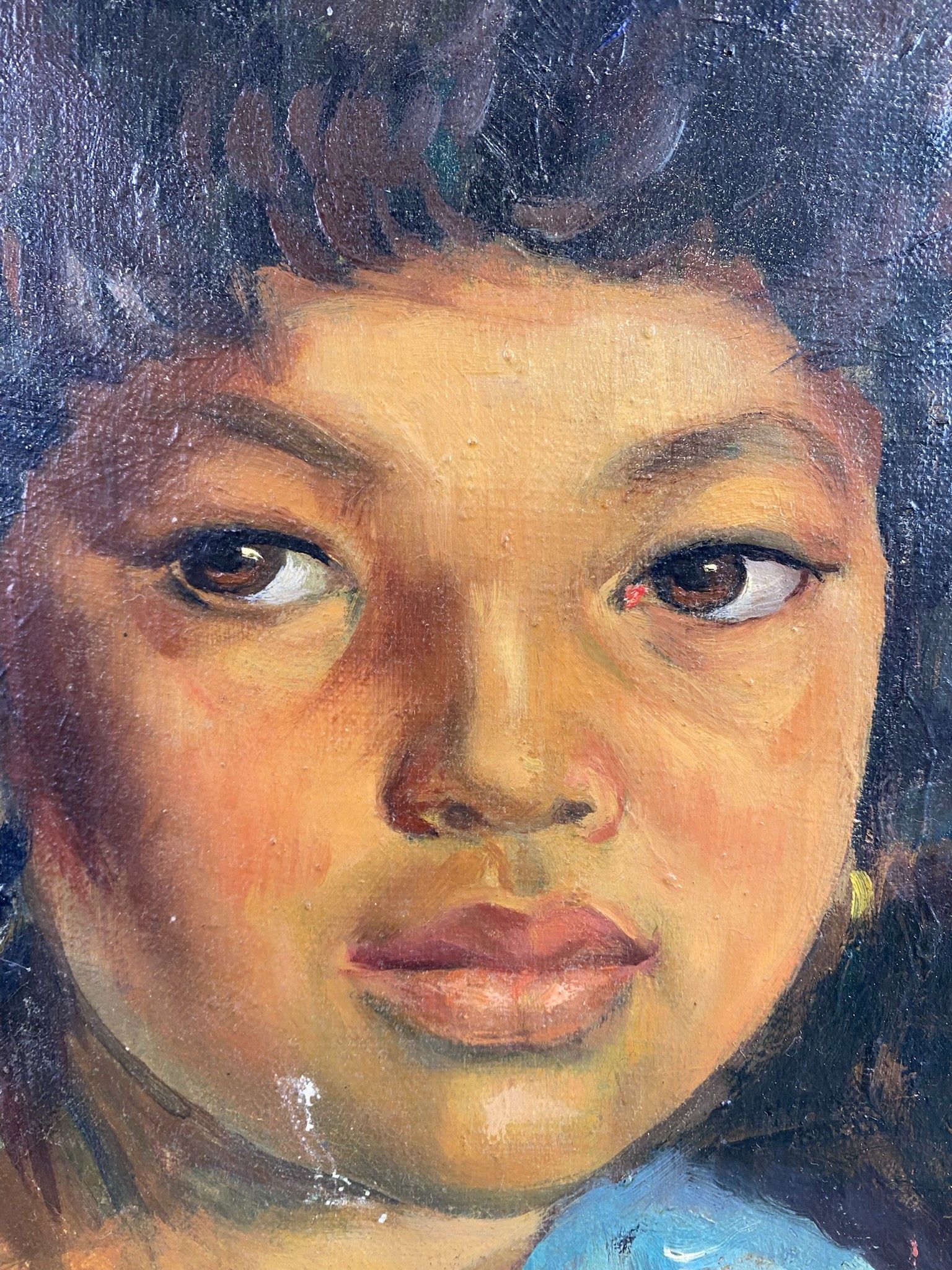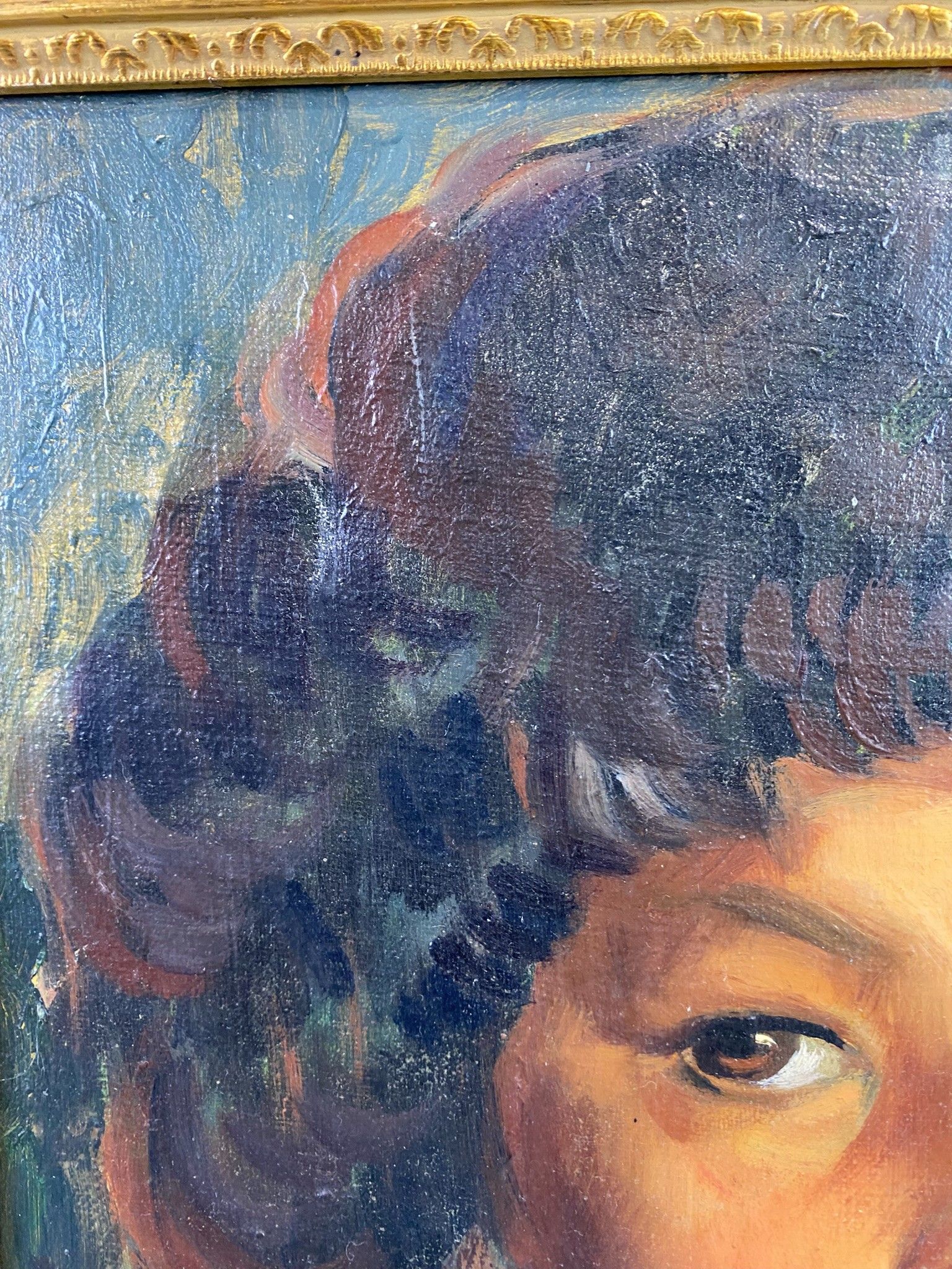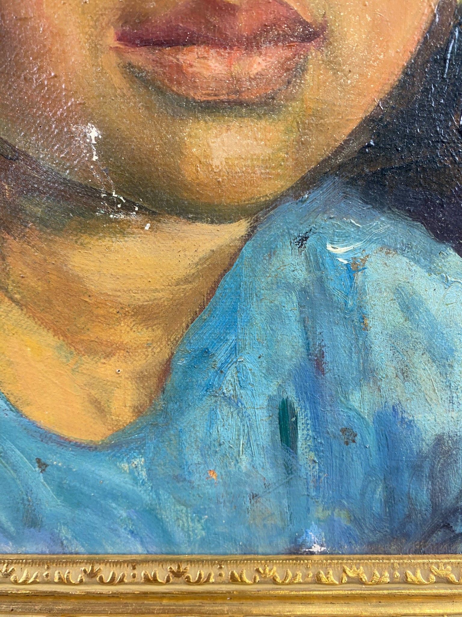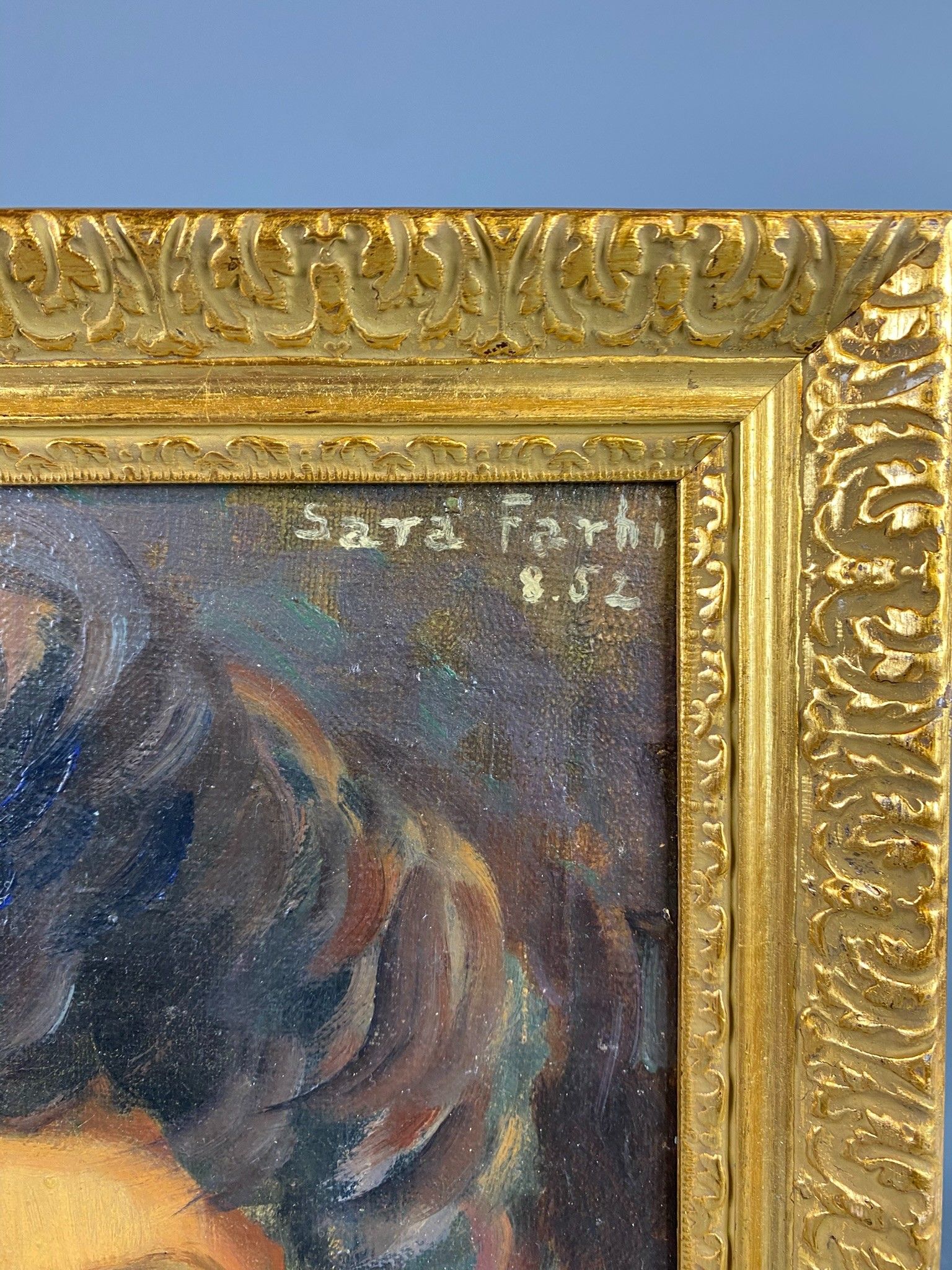 Sara Farhi (1912-1980) : "Portrait de jeune fille d'Asie du Sud Est". Huile sur toile, SHD, datée 8.52. Quelques petites sautes de peinture. 37,5 x 30,5 cm