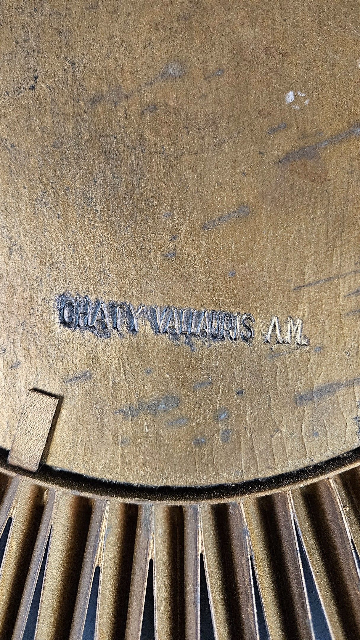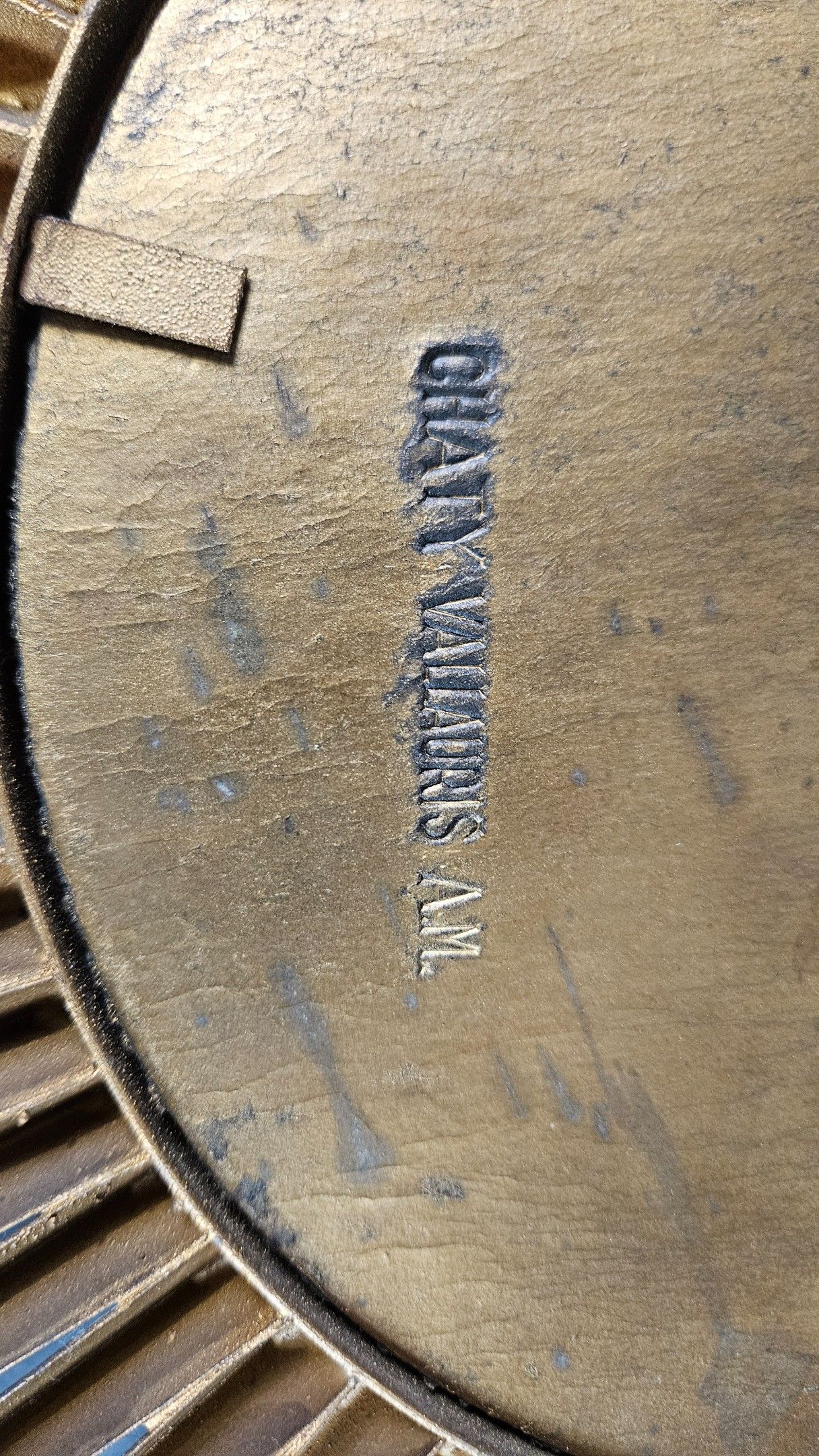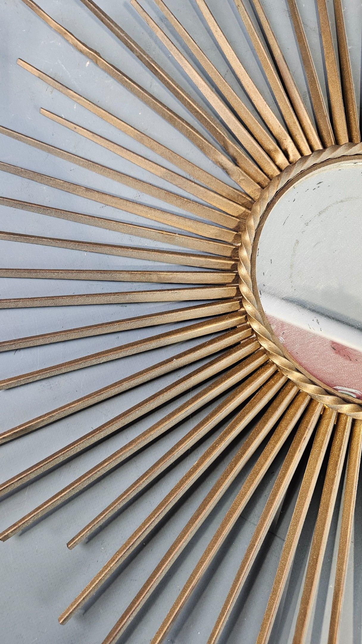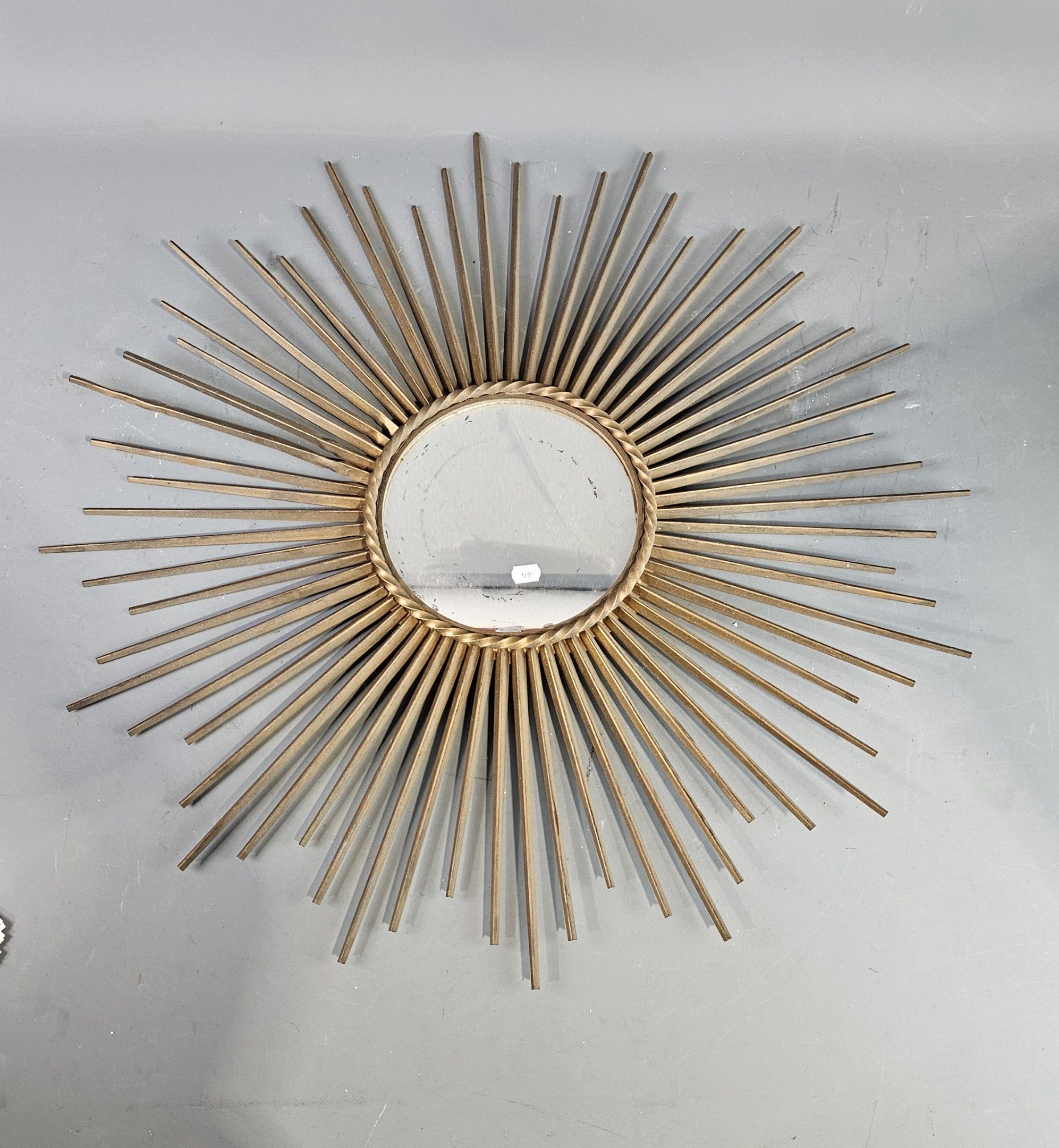 Miroir soleil des années 1960 en métal doré. Marqué CHATY - VALLAURIS - AM au dos. Diamètre : 71 cm