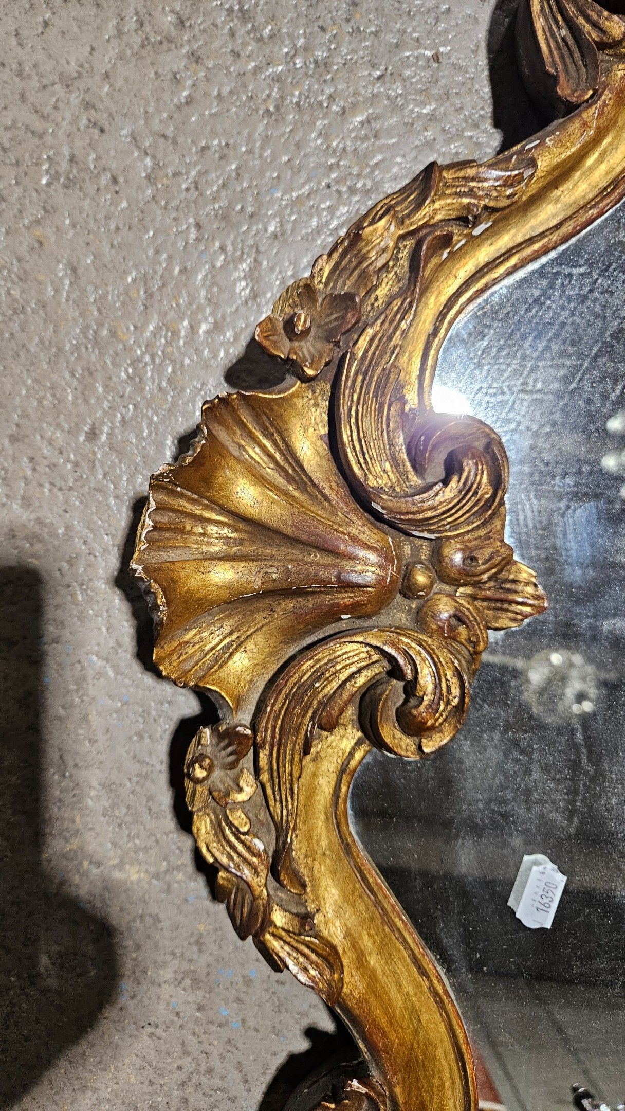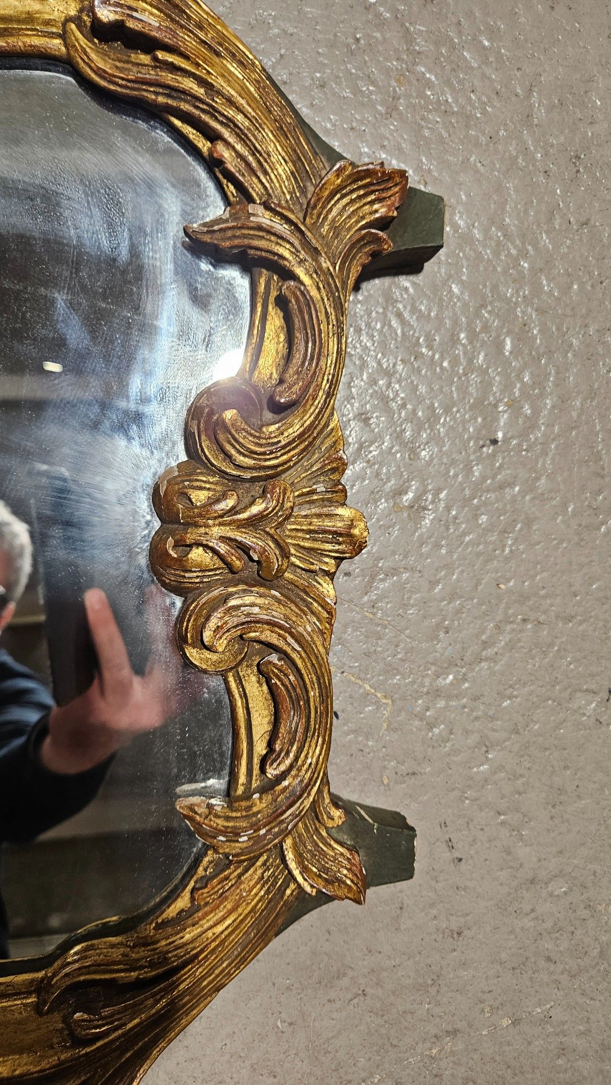 Petit miroir écusson en bois doré. Hauteur : 66 cm
