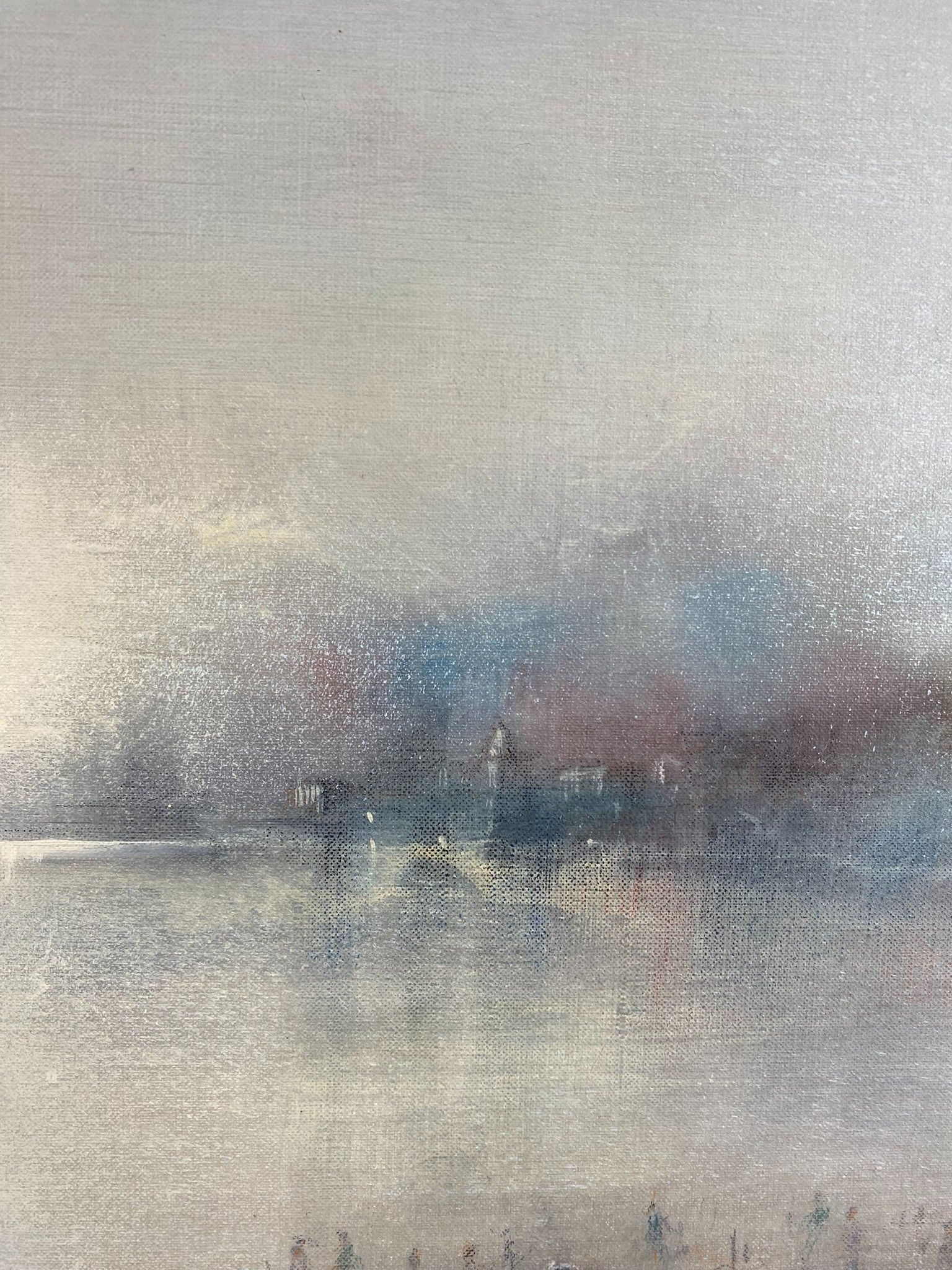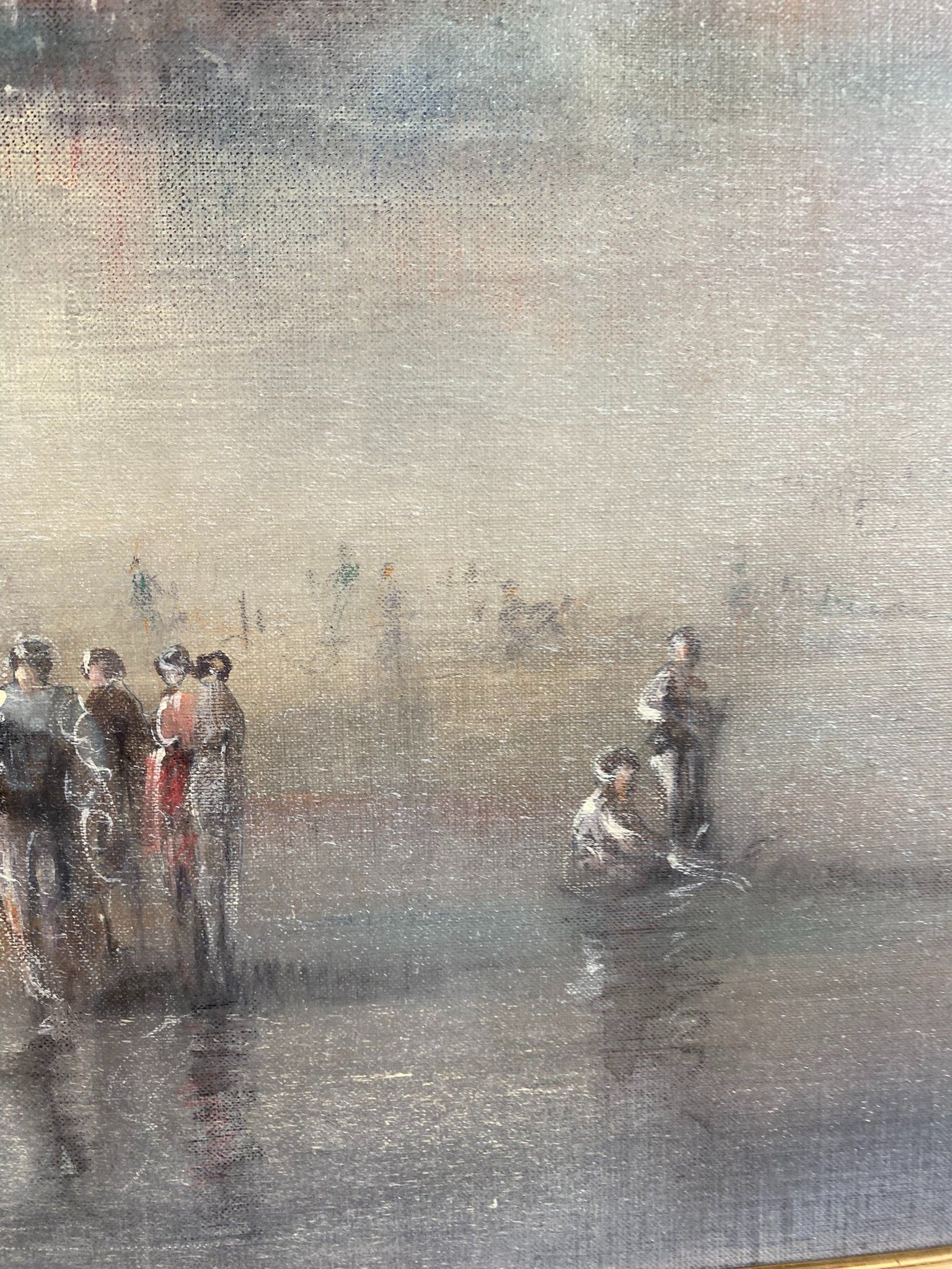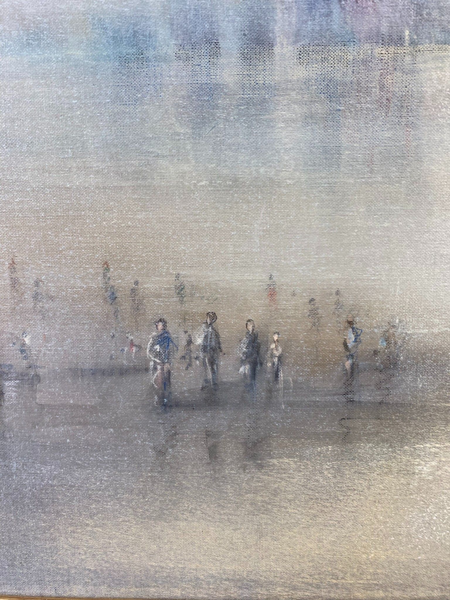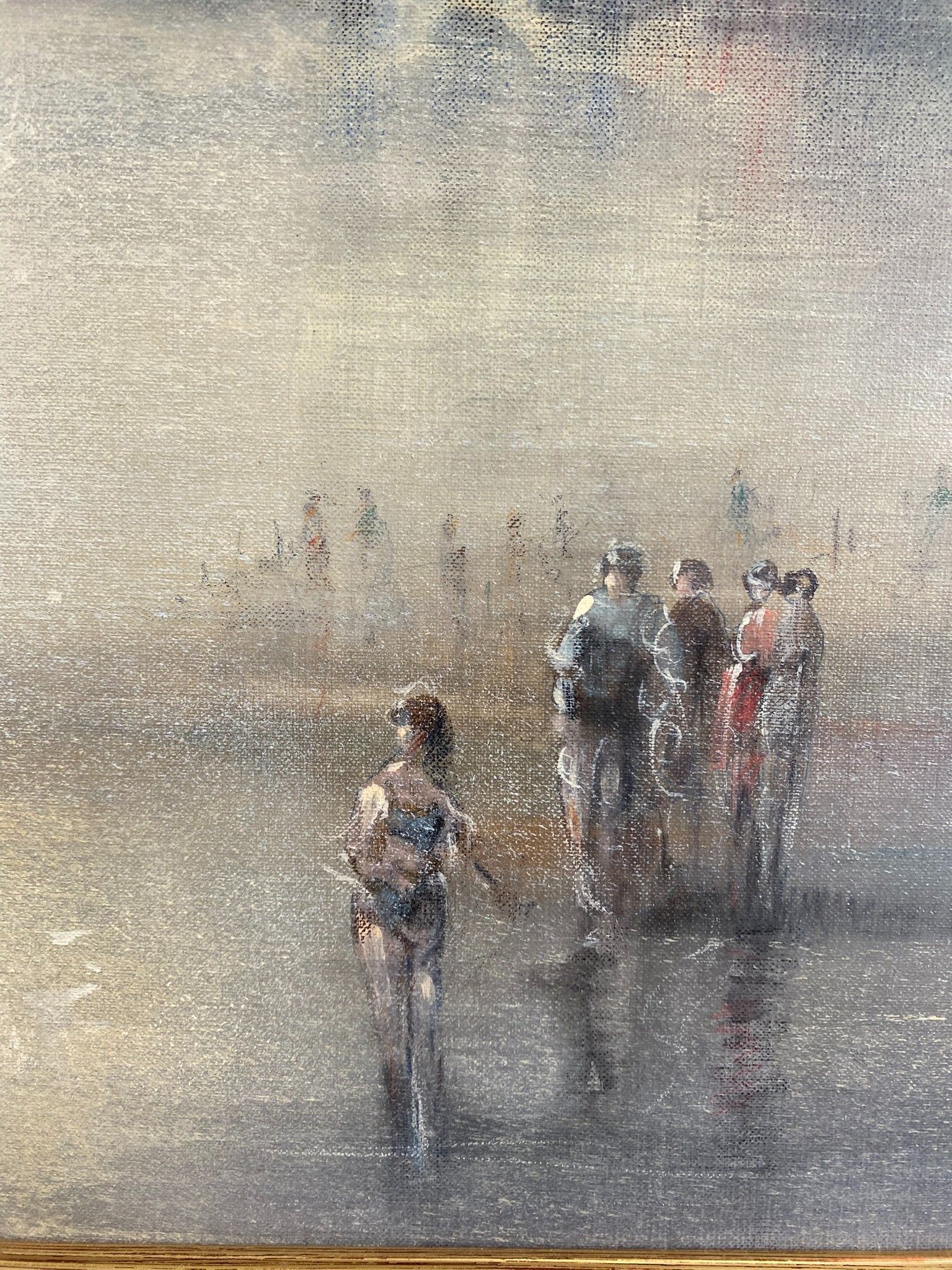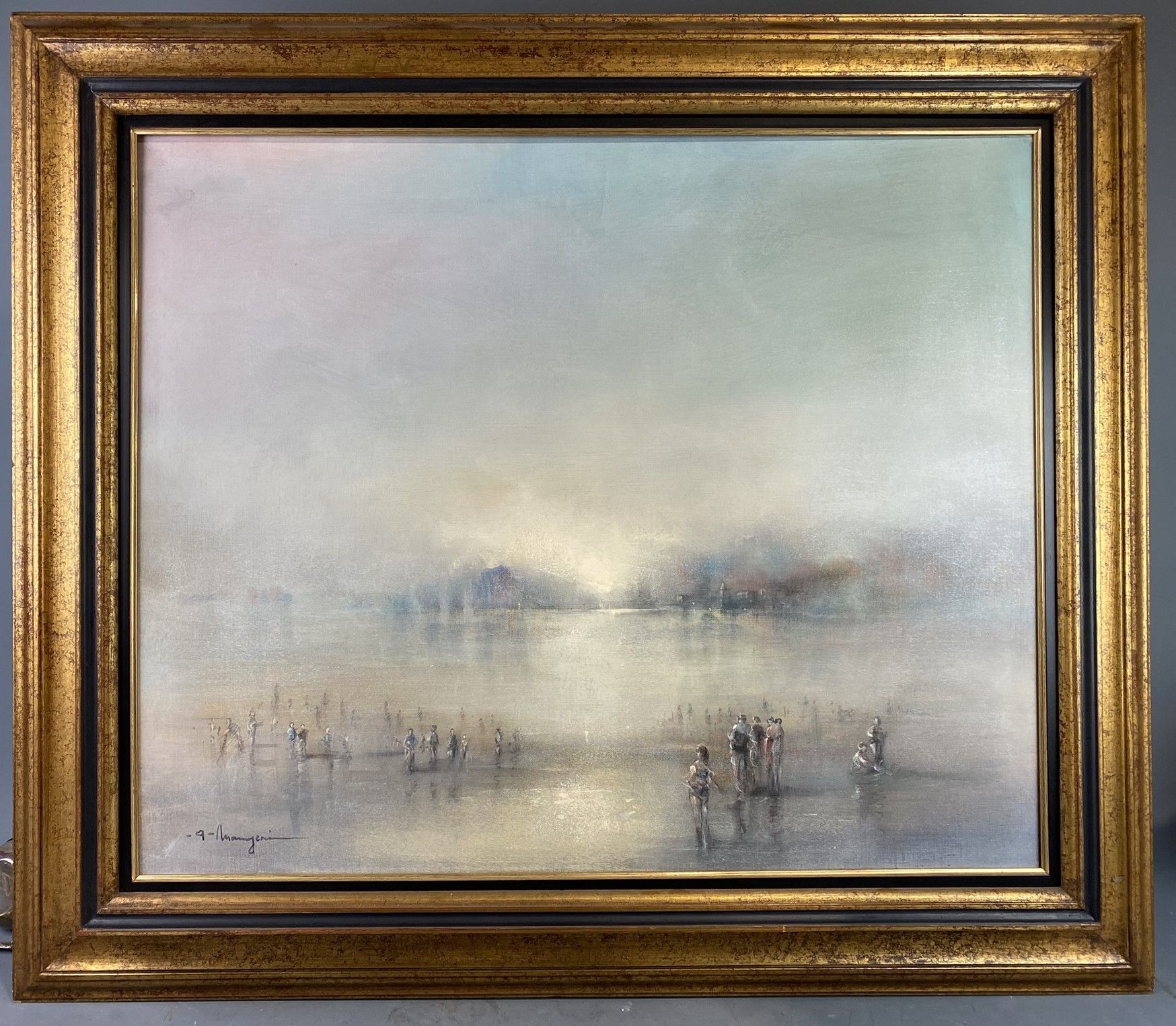 Ecole surréaliste moderne : "Paysage gris animé de personnage". Huile sur toile, SBG,