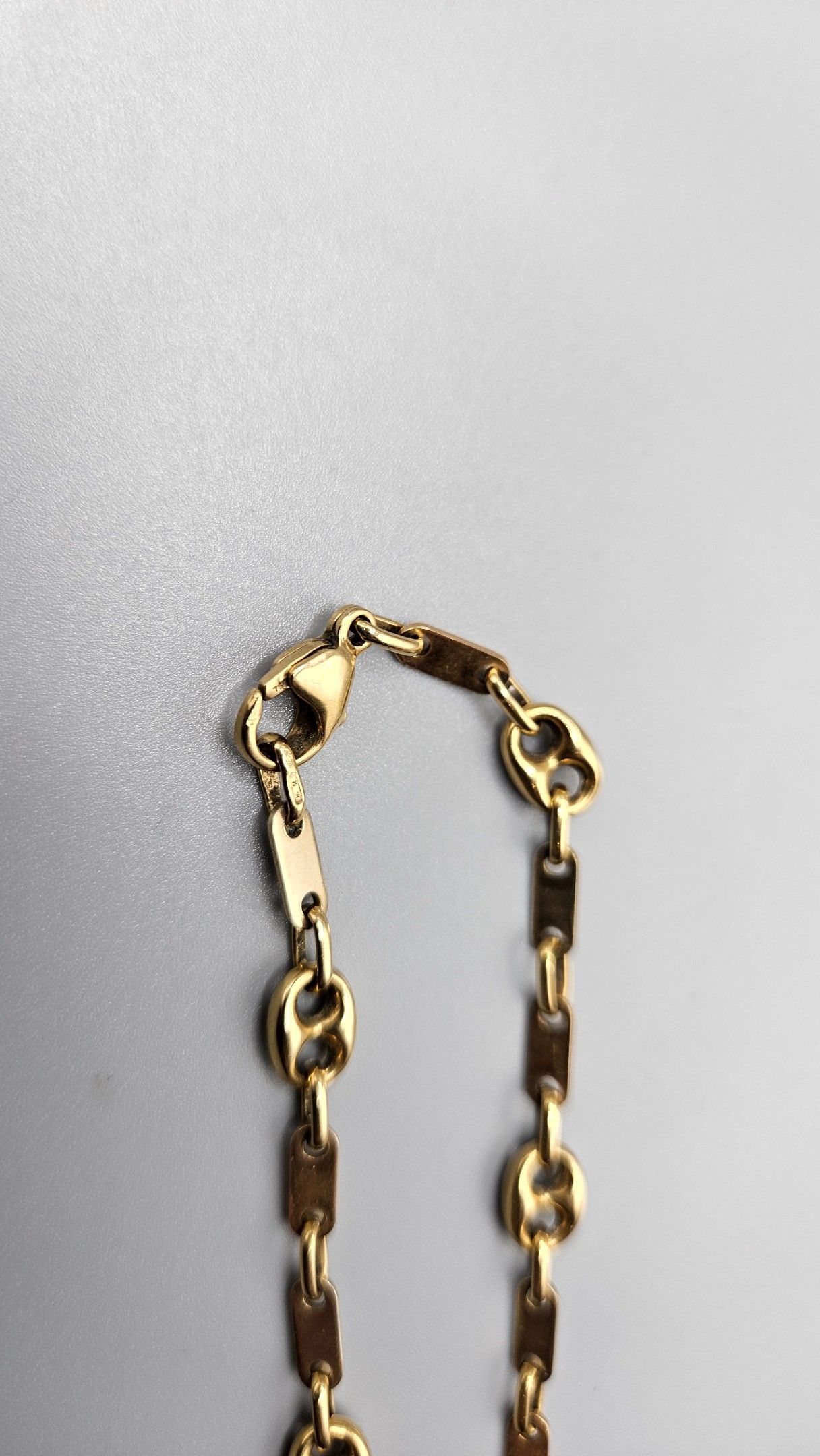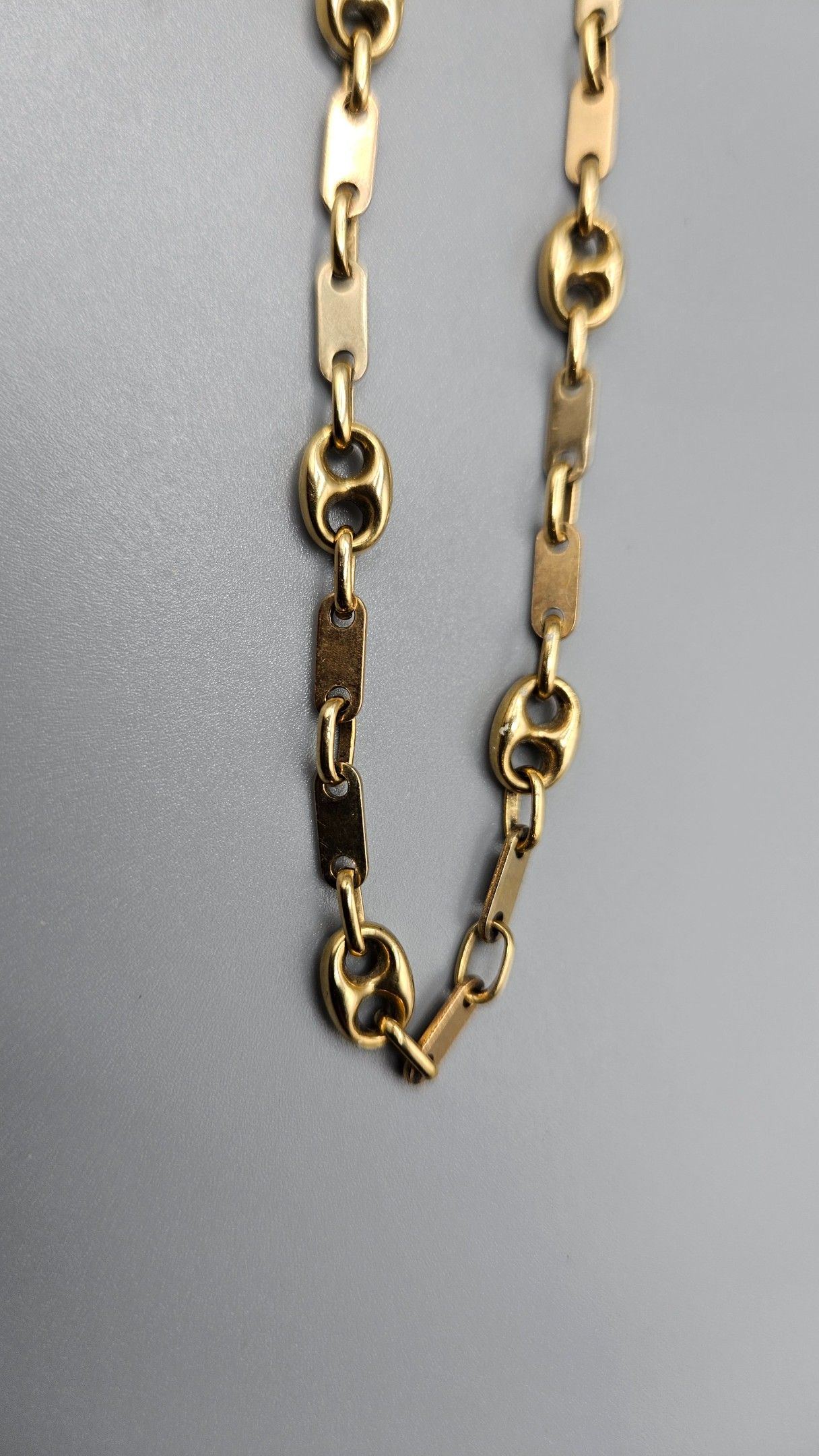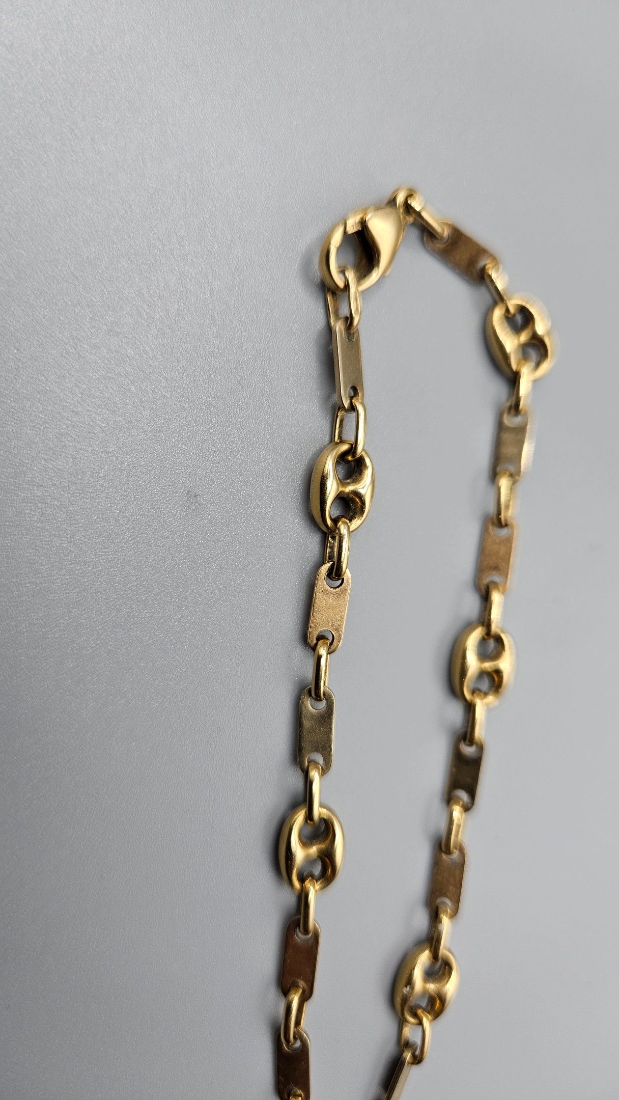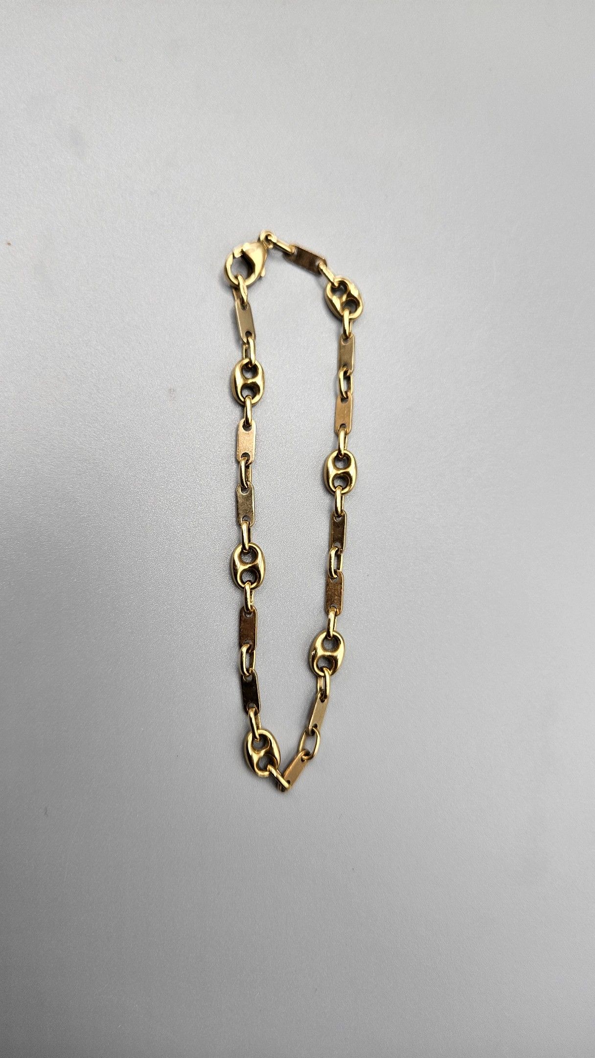 Bracelet ouvrant en or (en règle) à mailles grains de café alternées de plaquettes. Fermoir mousqueton. 7,4 gr