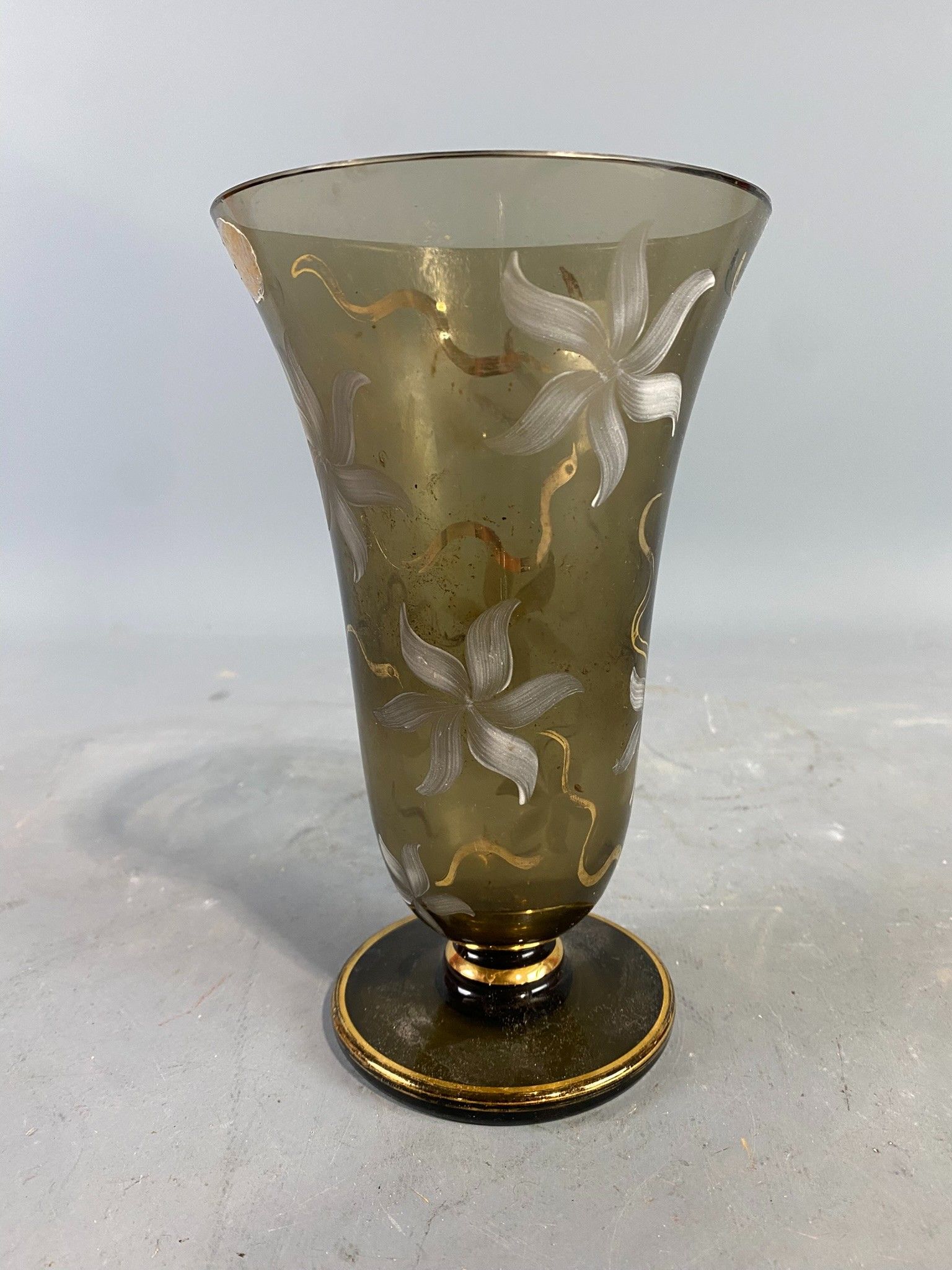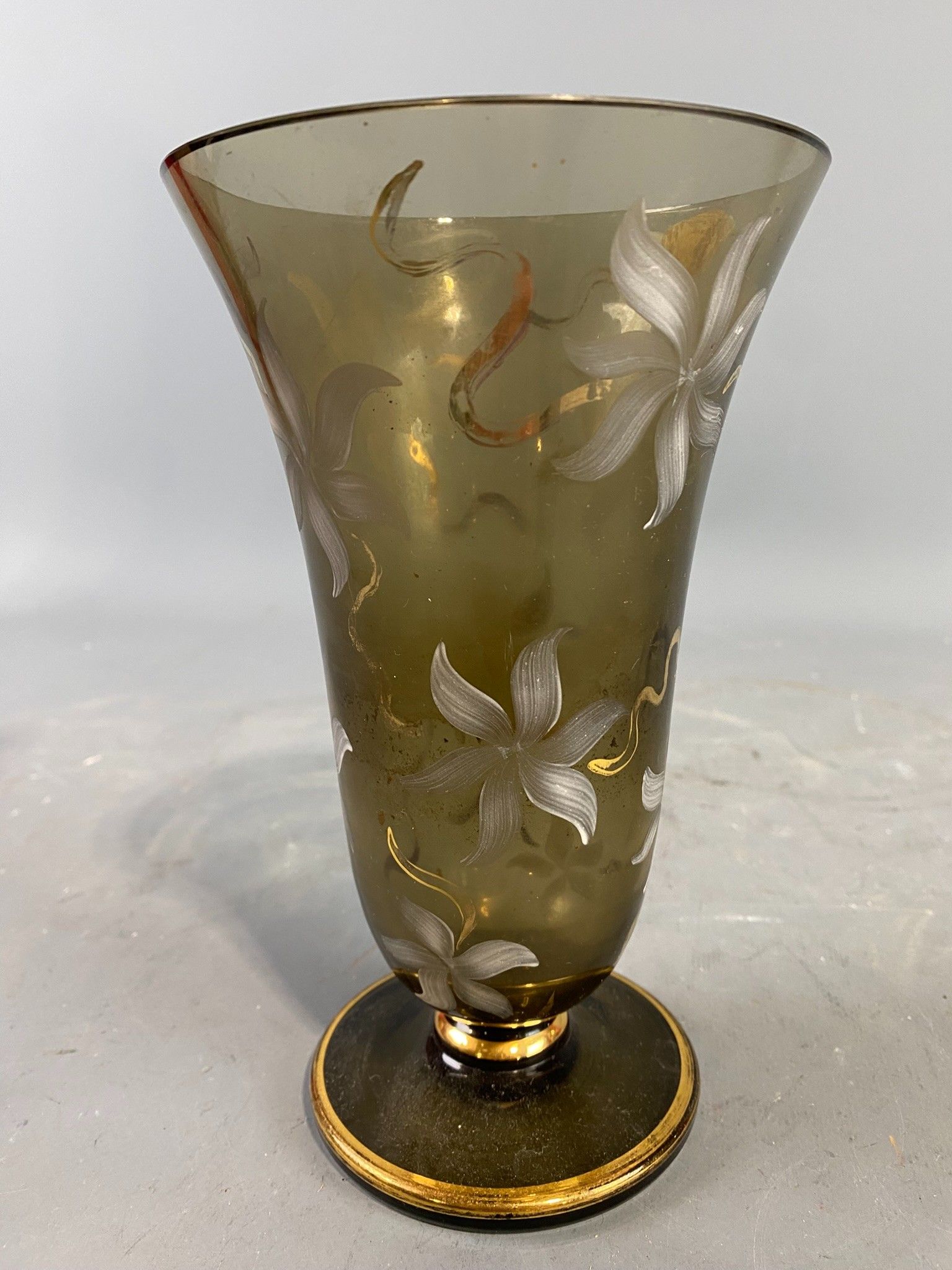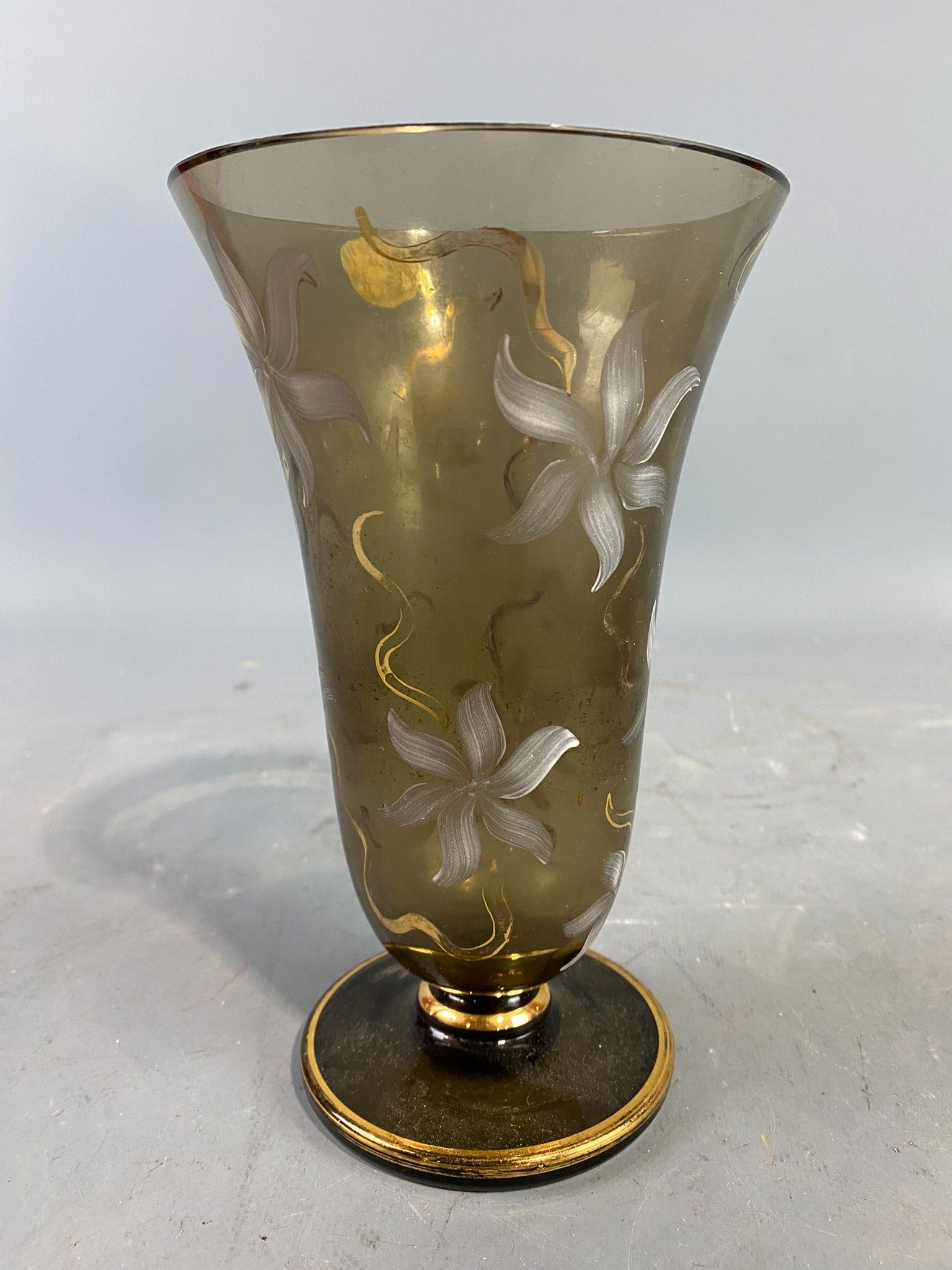 Vase tulipe en verre fumé des années 1960 à décor émaillé blanc de fleurs stylisées et filets doré. Hauteur: 19,5 cm
