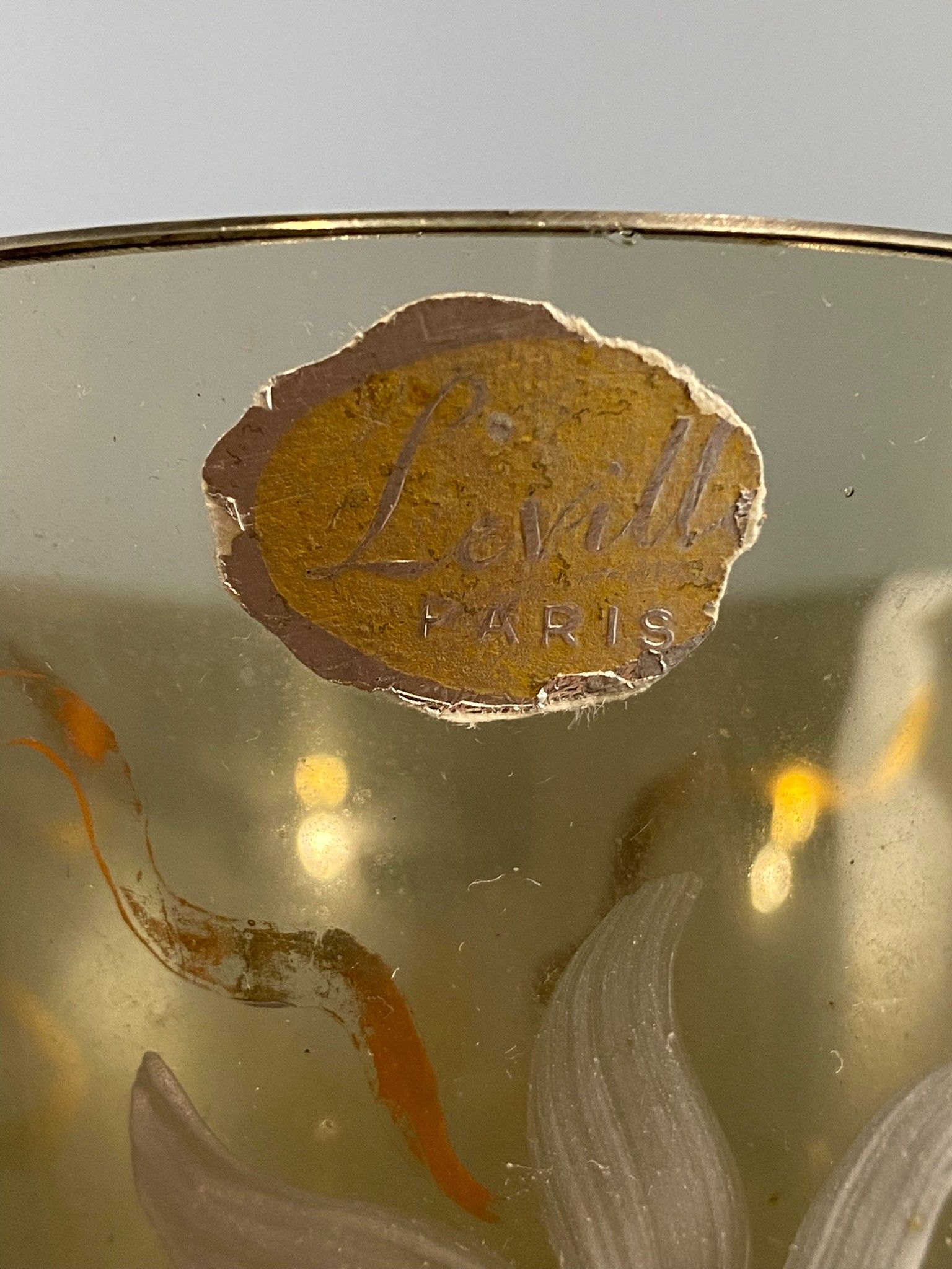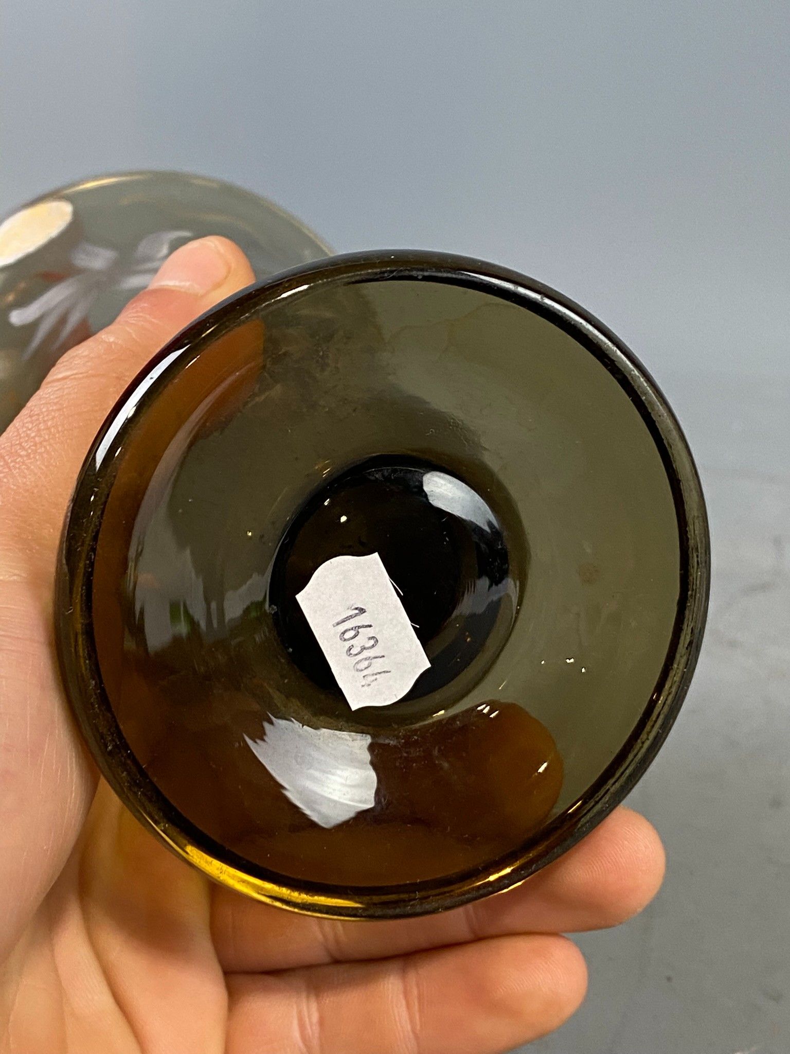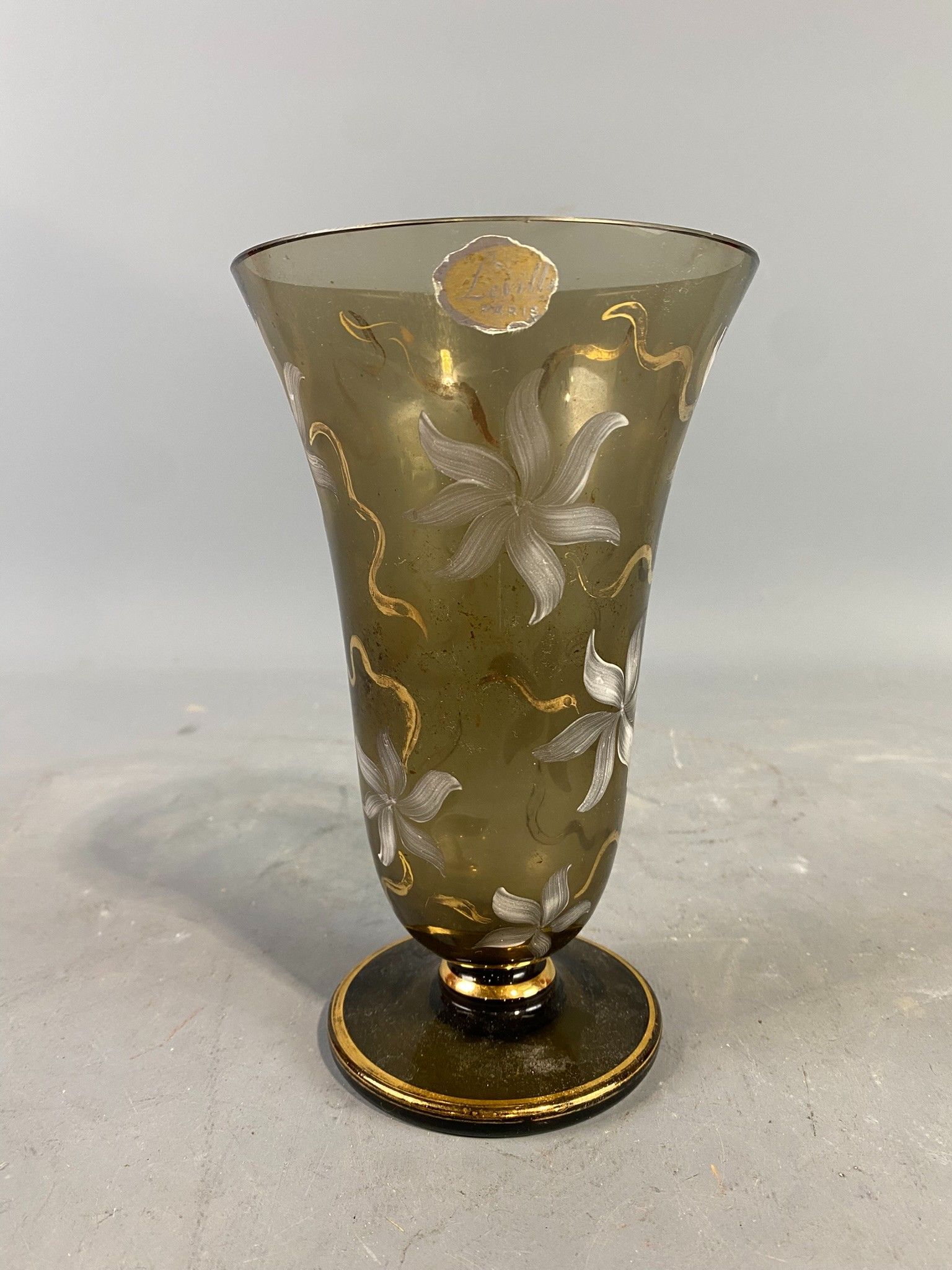 Vase tulipe en verre fumé des années 1960 à décor émaillé blanc de fleurs stylisées et filets doré. Hauteur: 19,5 cm