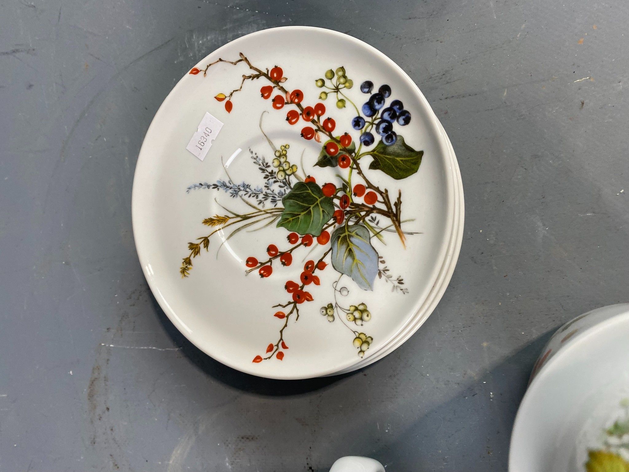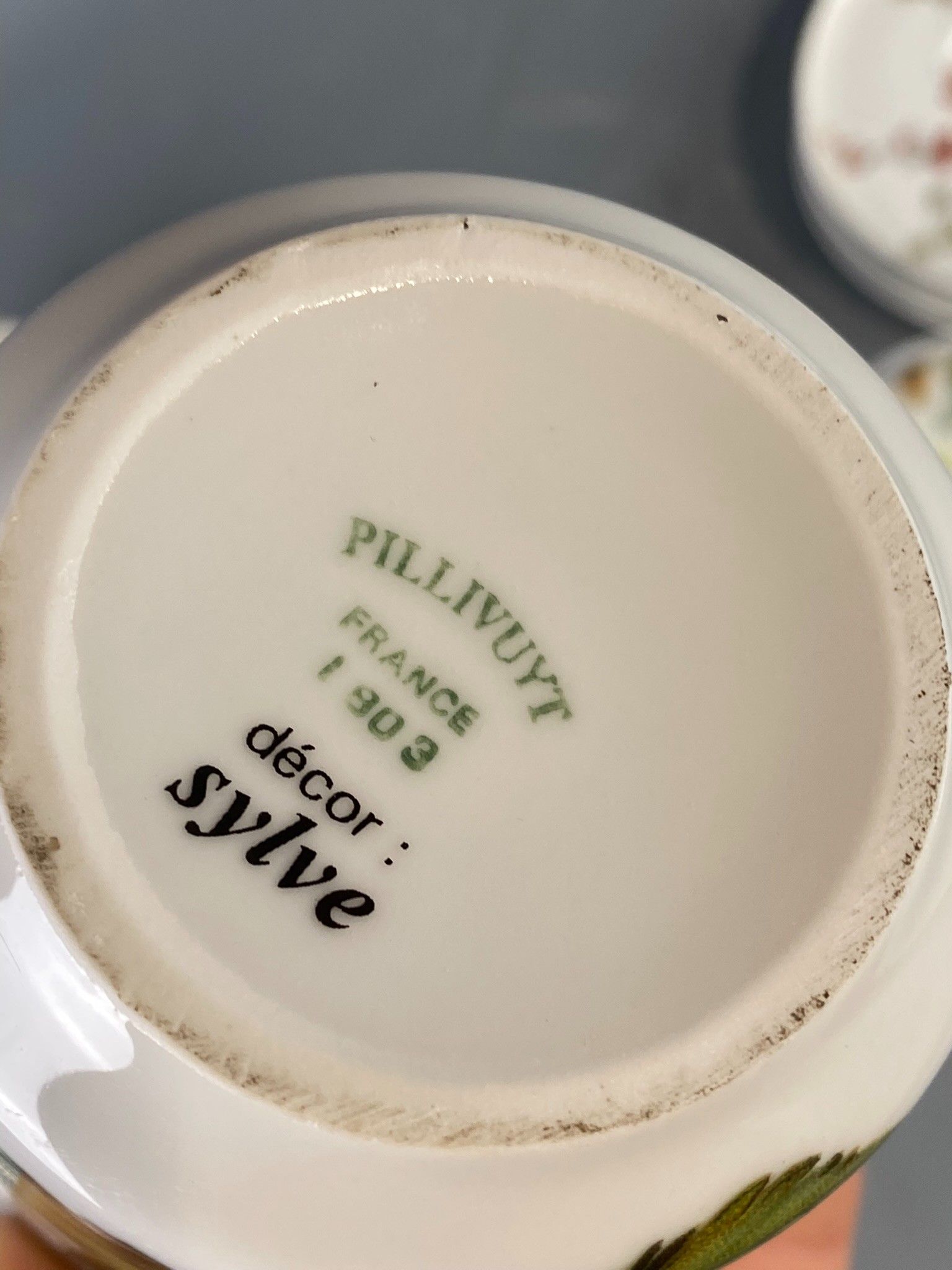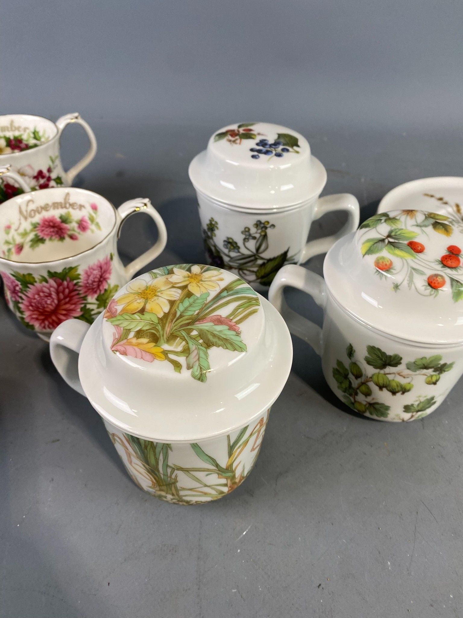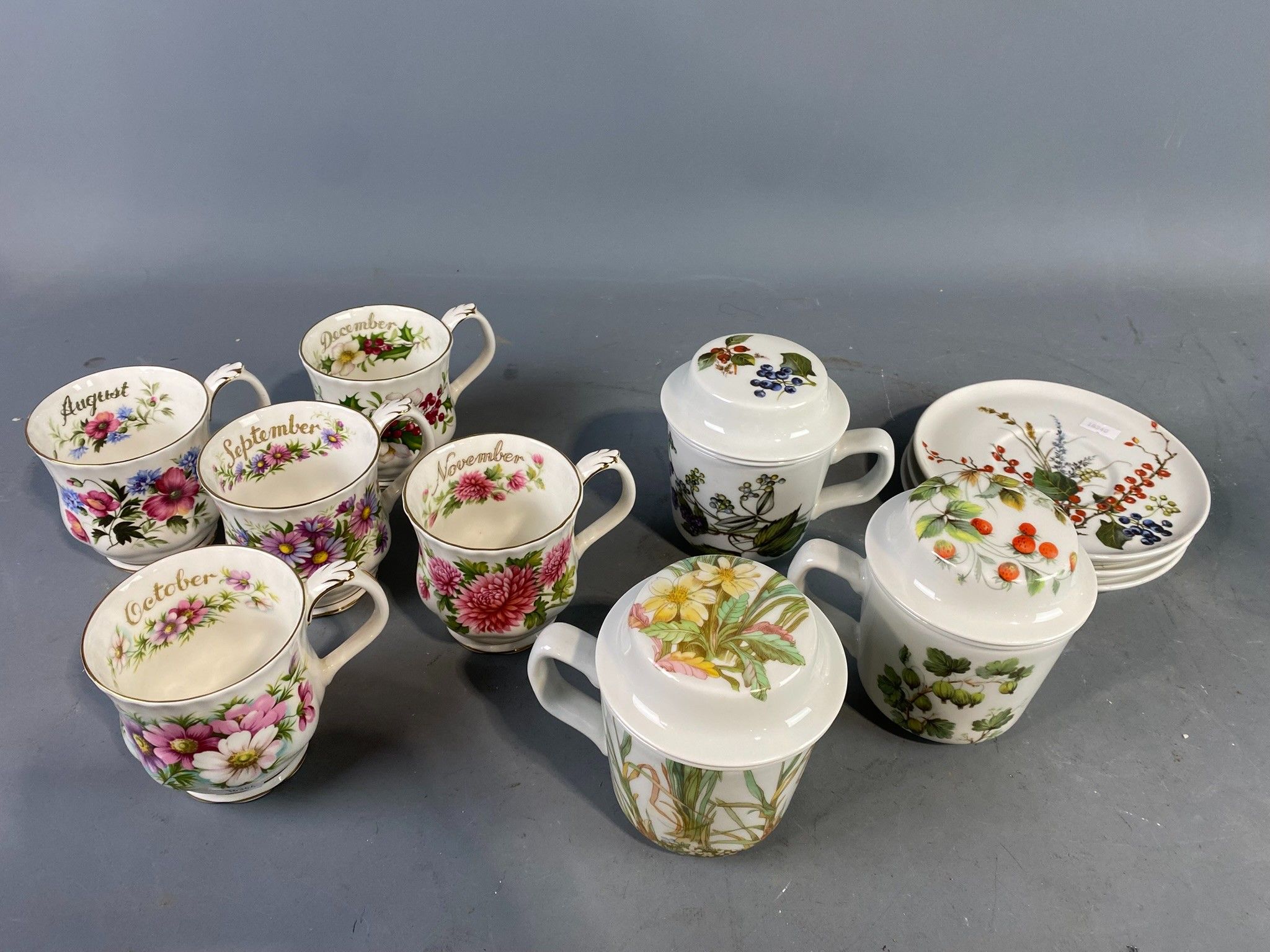 Réunion de tasse à thé en porcelaine dont 5 des mois de l'année édition Royal Albert d'aout à décembre et 3 avec leurs sous tasses et filtres intérieur et couvercles à décor de baies ou de fleurs par la manufacture Pillivuyt