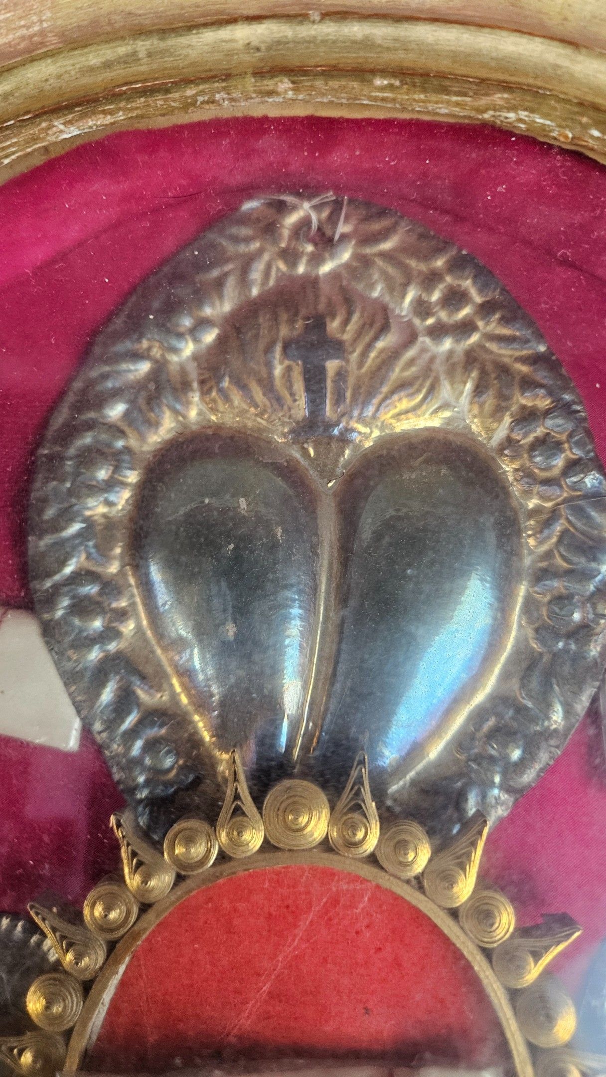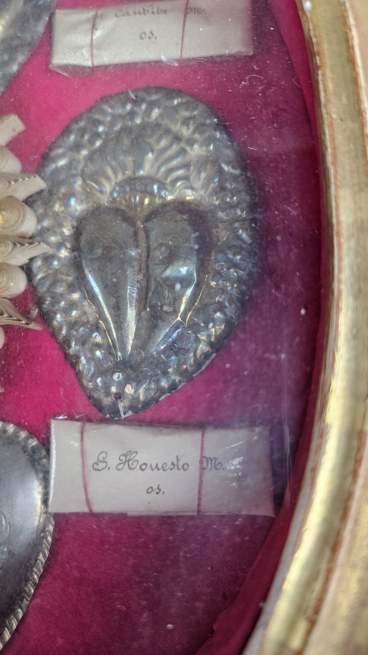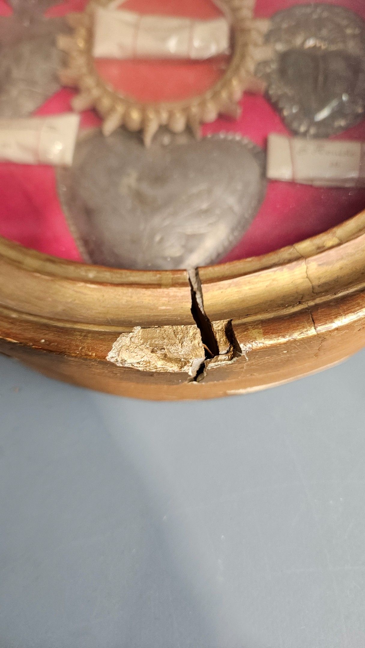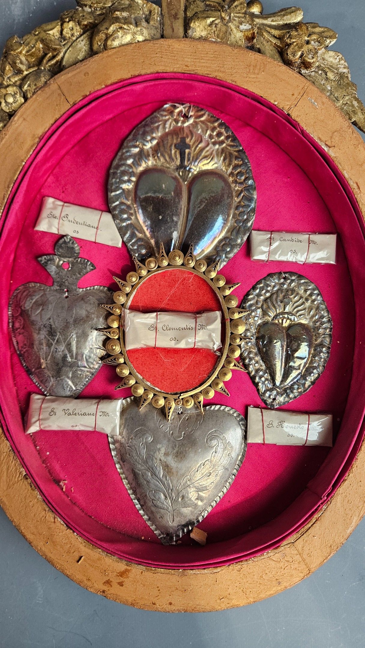 Reliquaire ovale en bois doré XIXème formant vitrine et comprenant cinq enveloppes inscrites (Clémentis, Valériane, Candide ) et décorées de Sacré Cœurs argentés. Dimension de l'ovale 33 x 27 cm . Le bas de l'ovale accidenté
