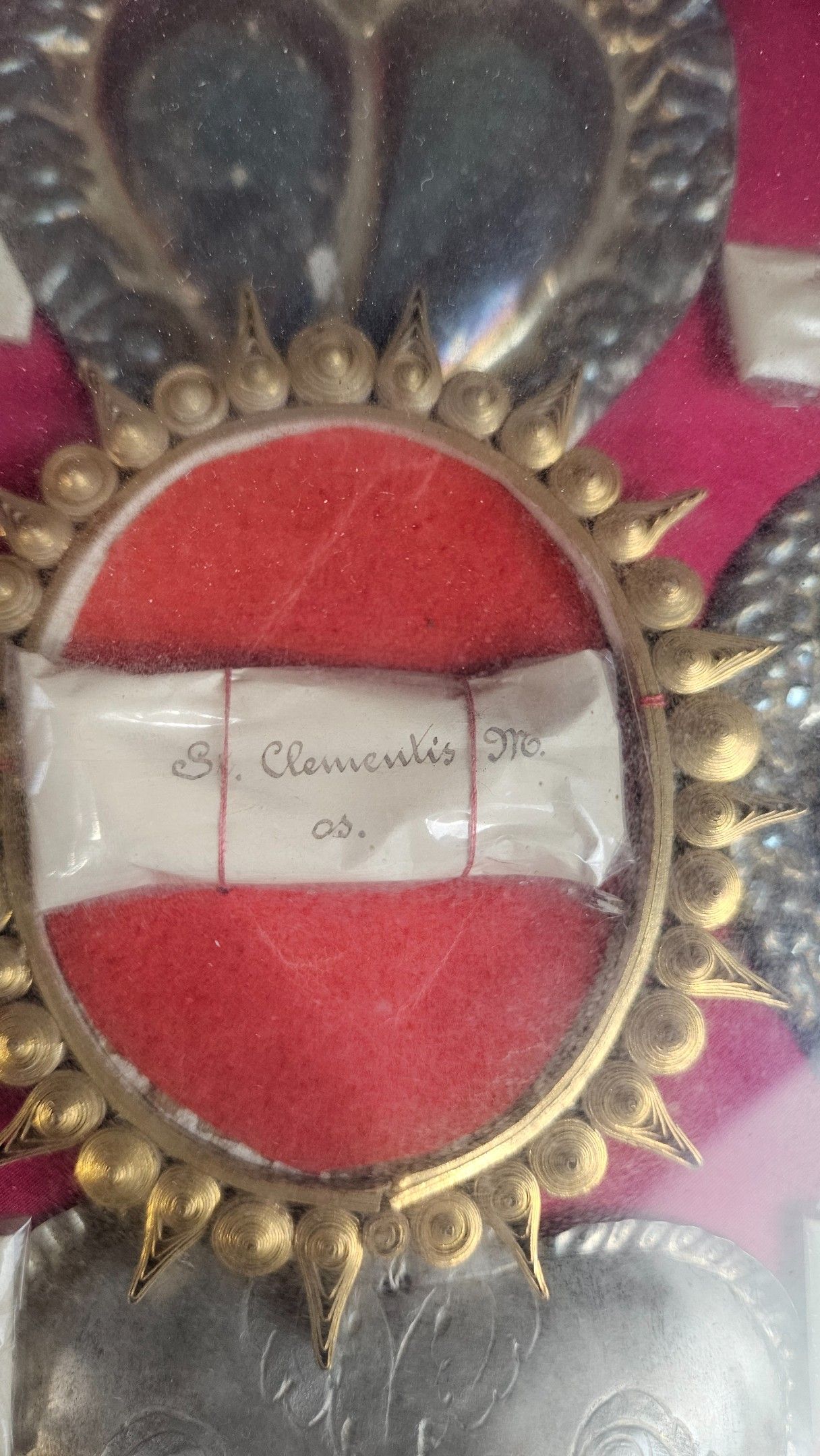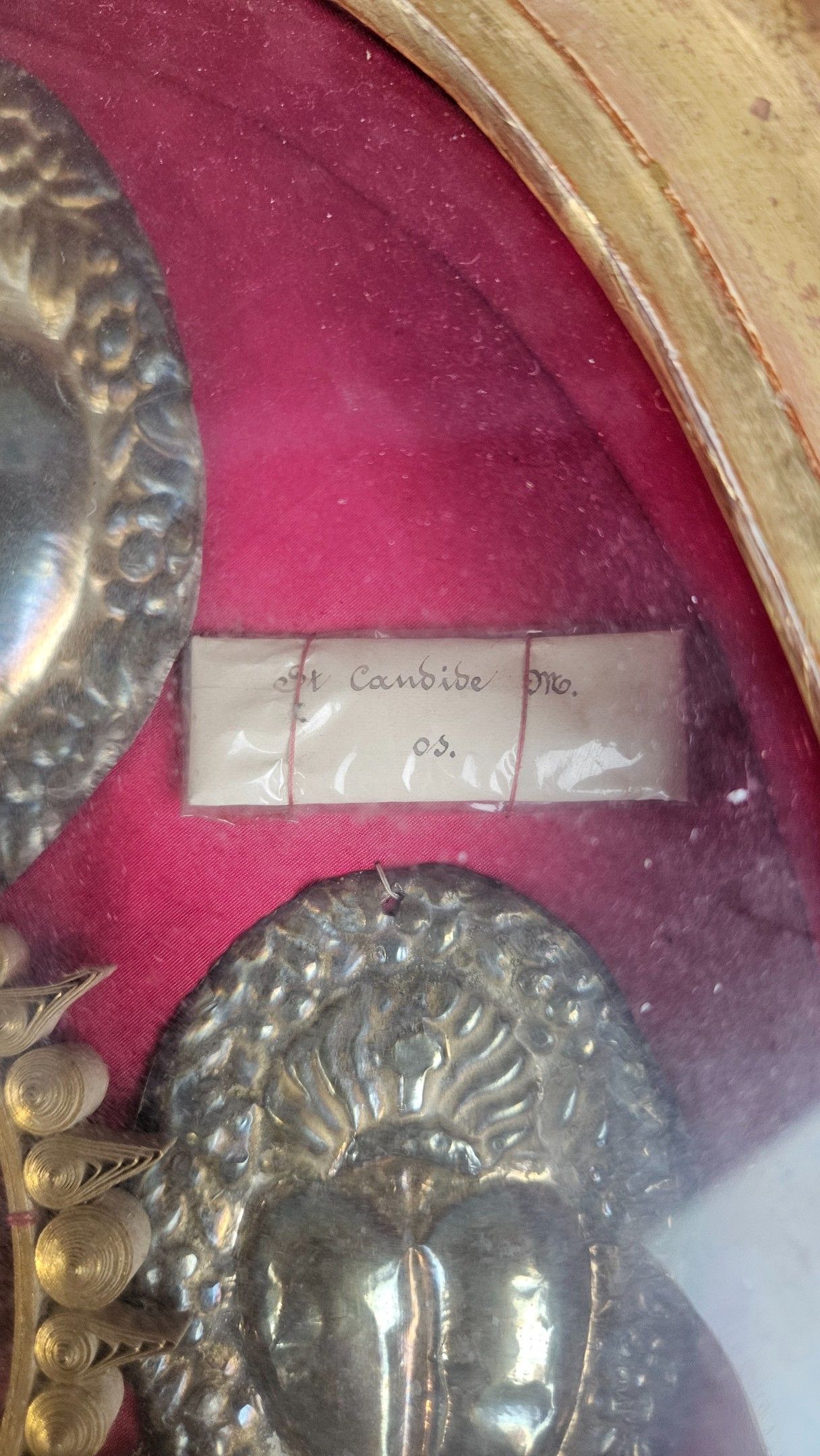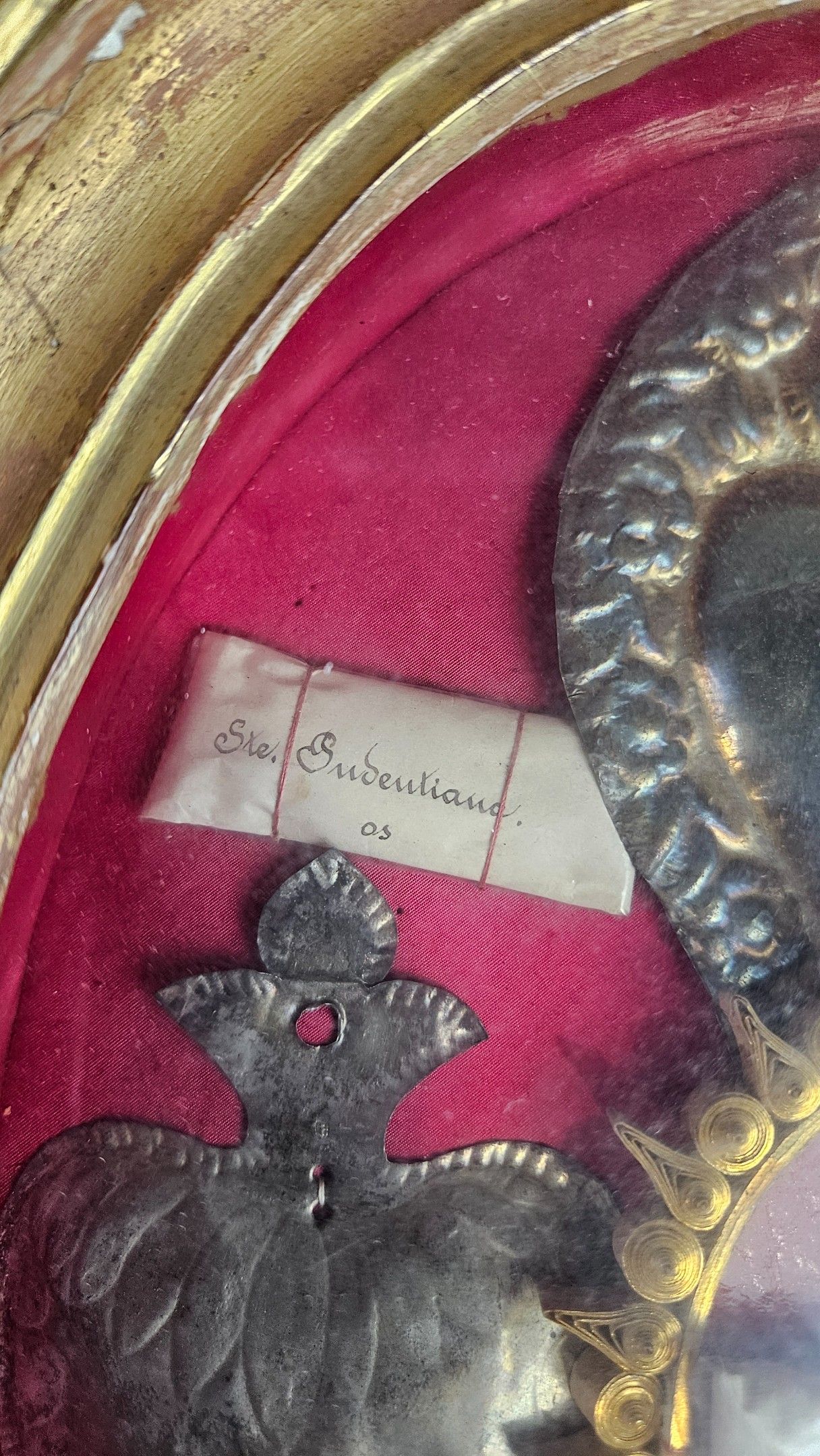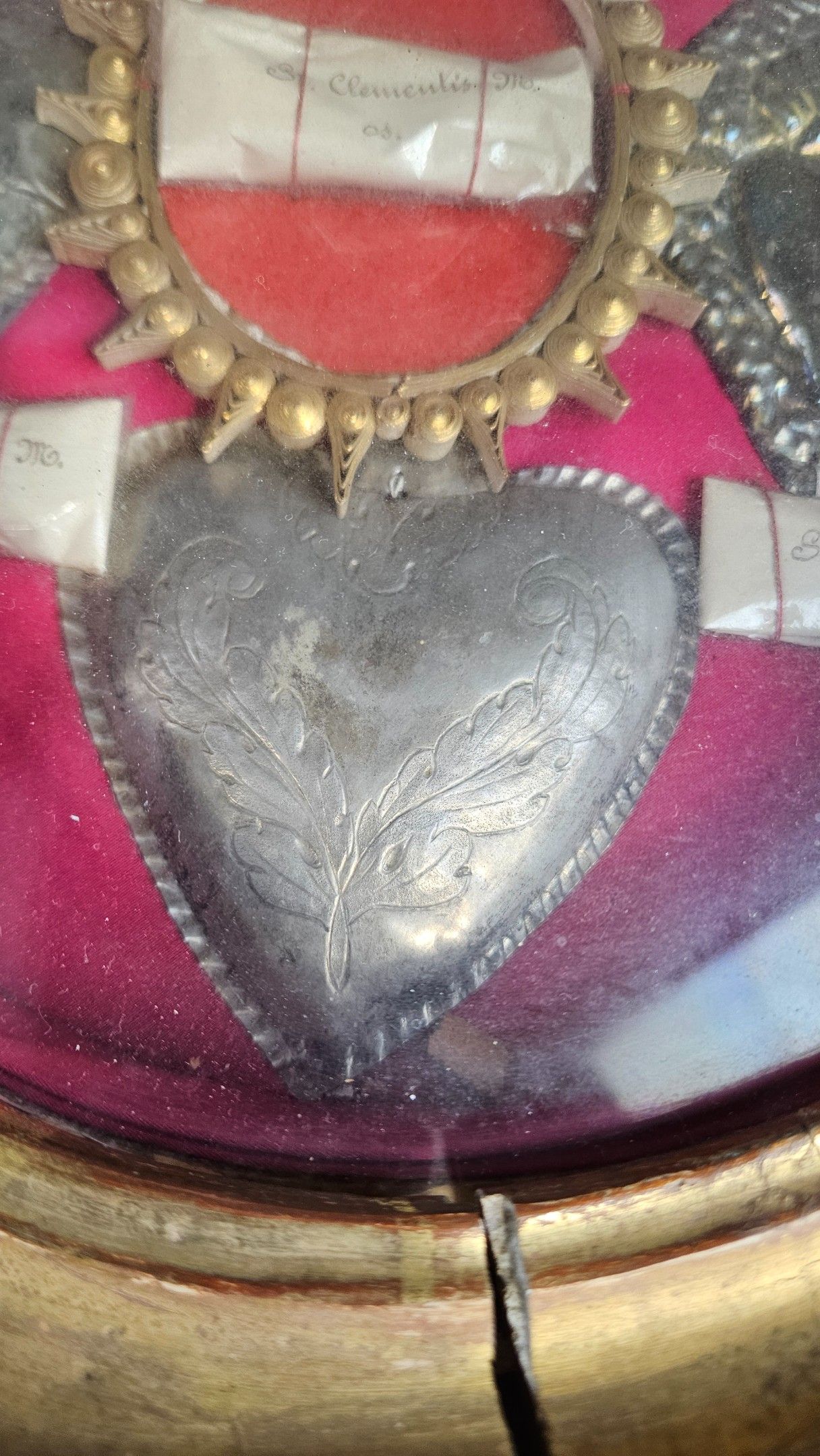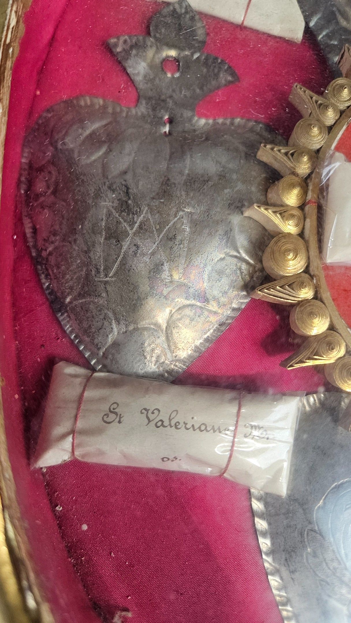 Reliquaire ovale en bois doré XIXème formant vitrine et comprenant cinq enveloppes inscrites (Clémentis, Valériane, Candide ) et décorées de Sacré Cœurs argentés. Dimension de l'ovale 33 x 27 cm . Le bas de l'ovale accidenté