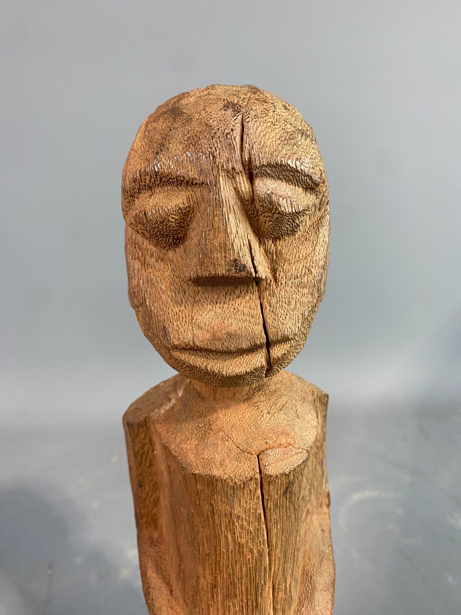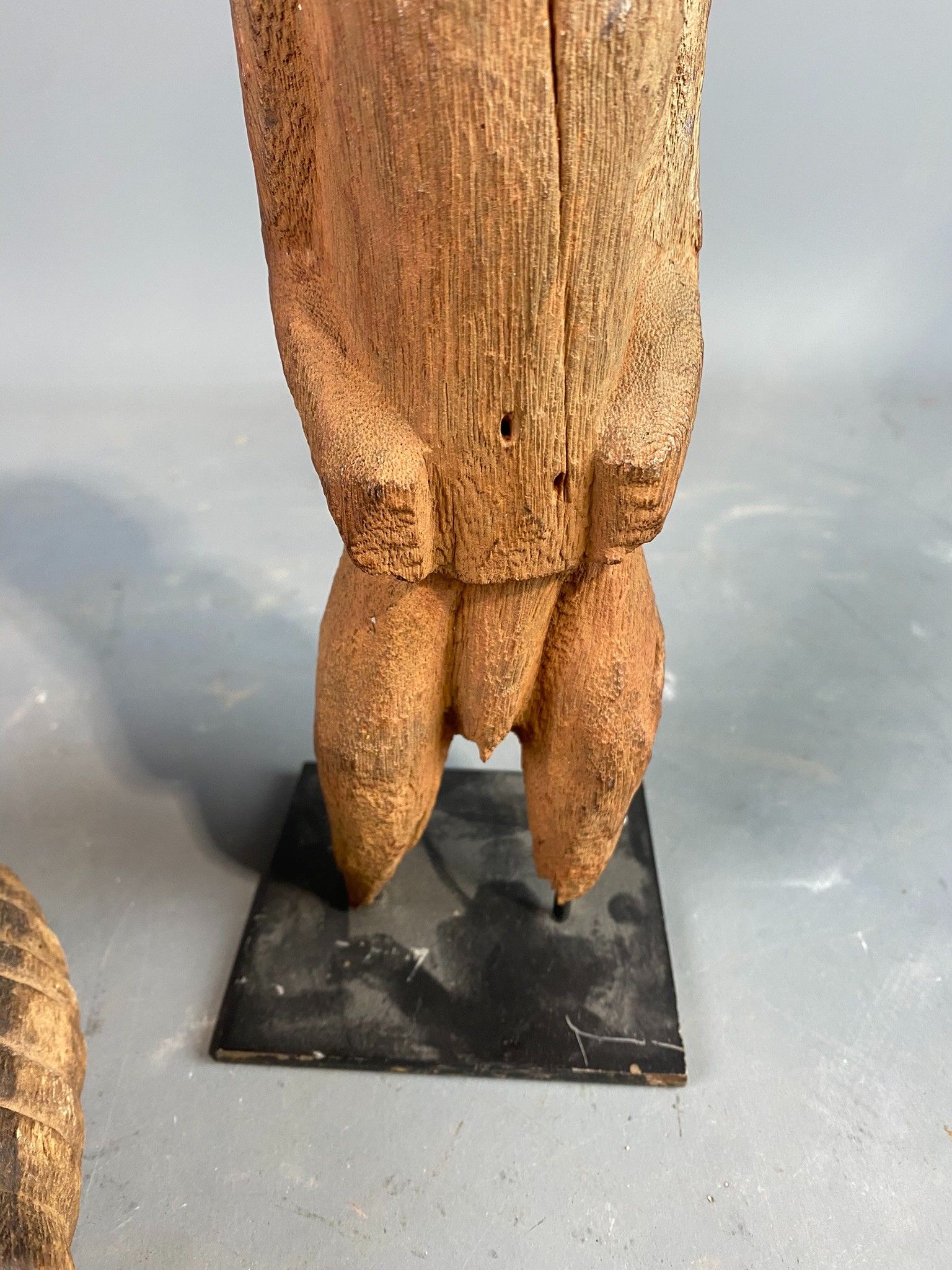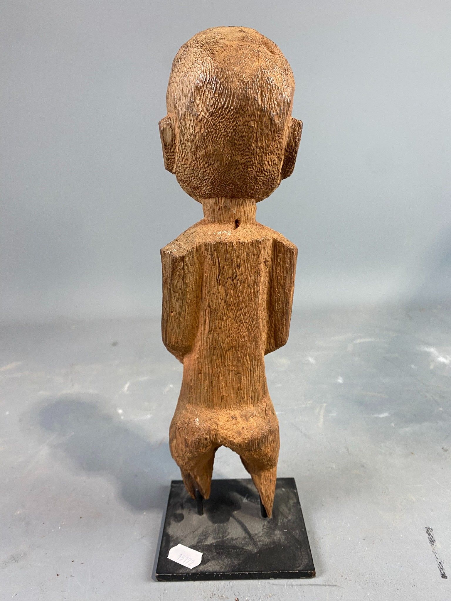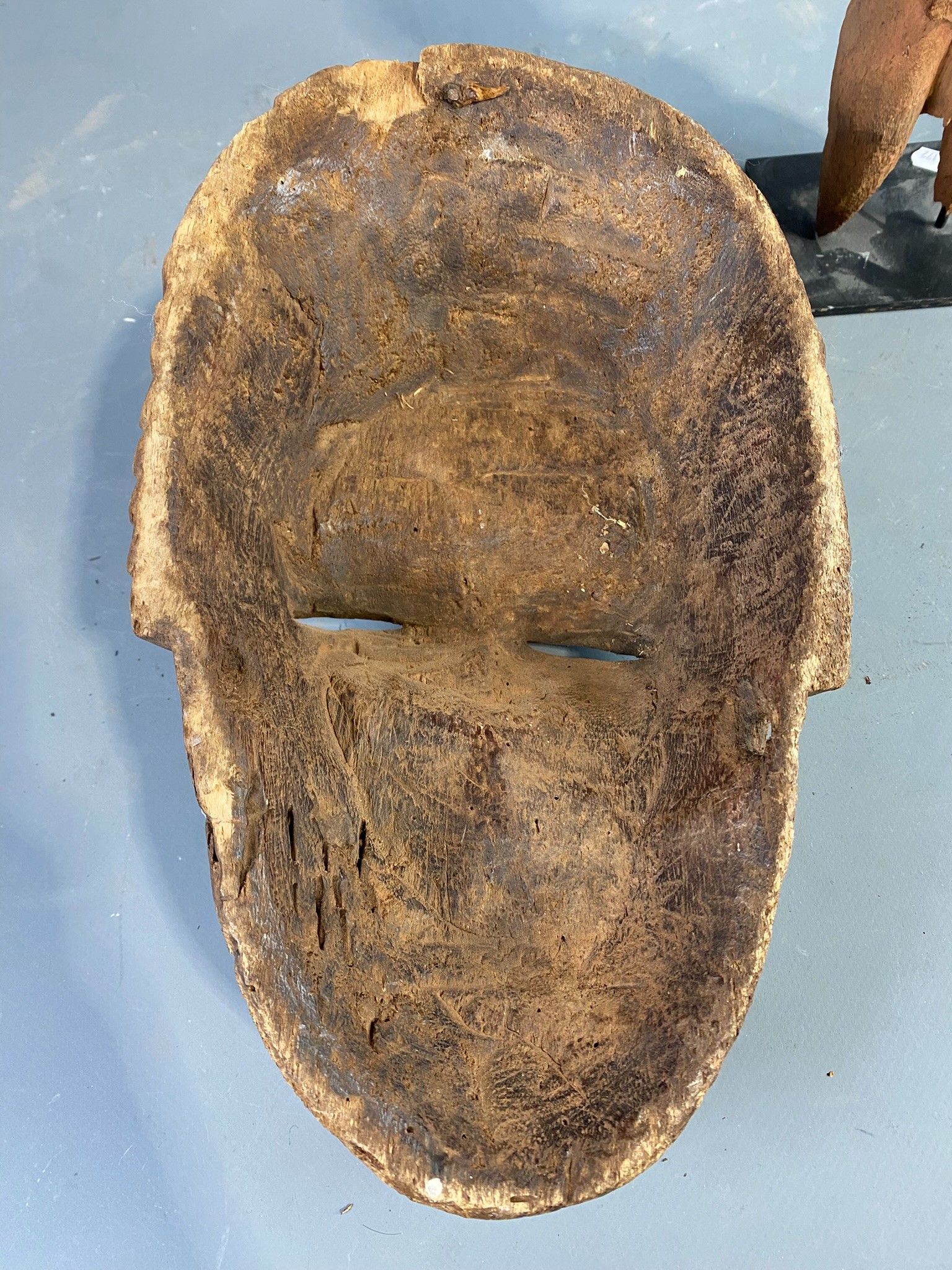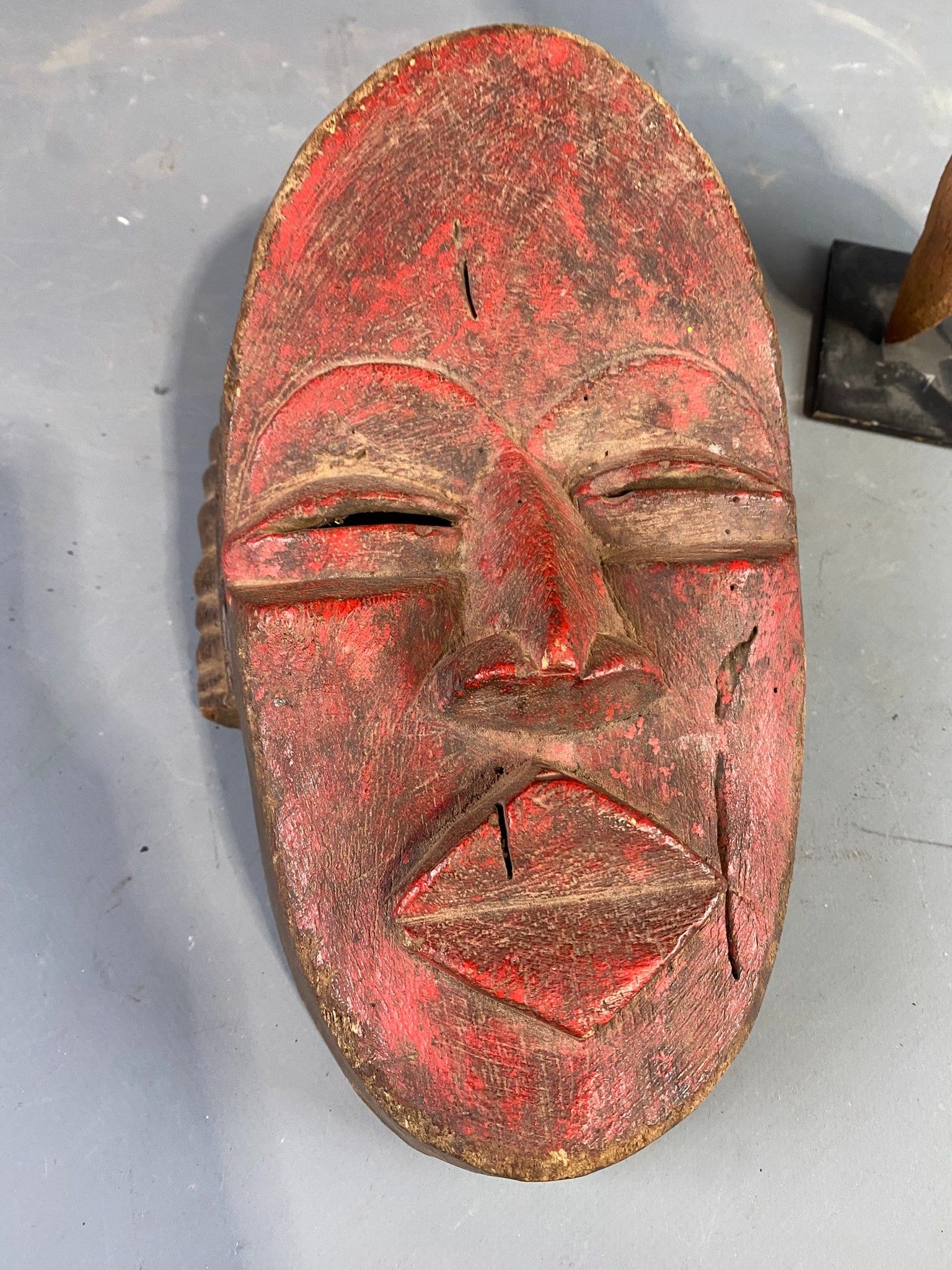 Masque de danse ou de cérémonie en bois sculpté et peint de rouge sur la face (Hauteur : 30 cm). Travail d'Afrique de l'Ouest, Chokwé ?). On y joint une statuette anthropomorphe de bois montée sur socle métallique. Hauteur totale : 30 cm