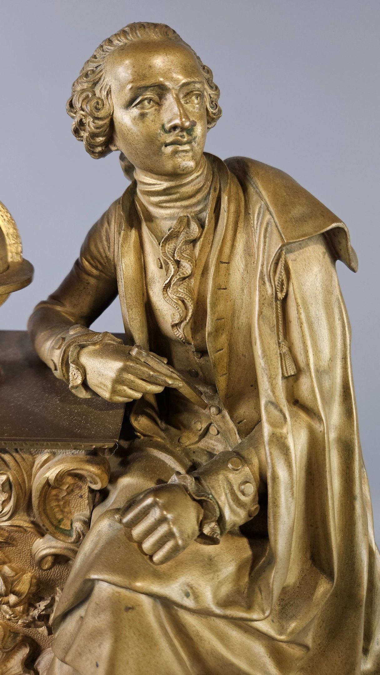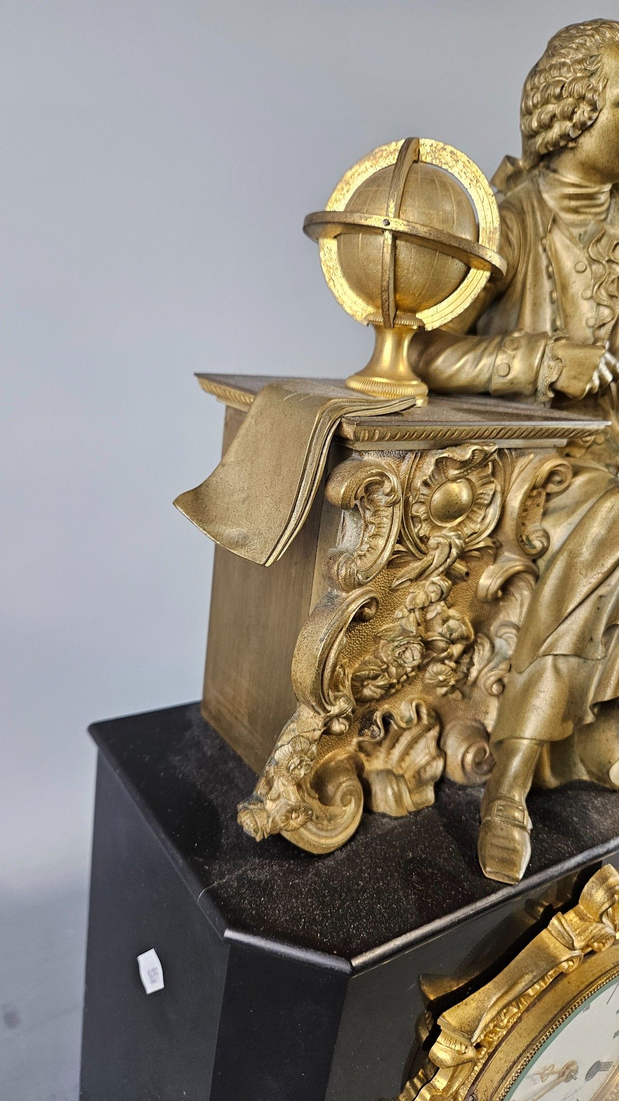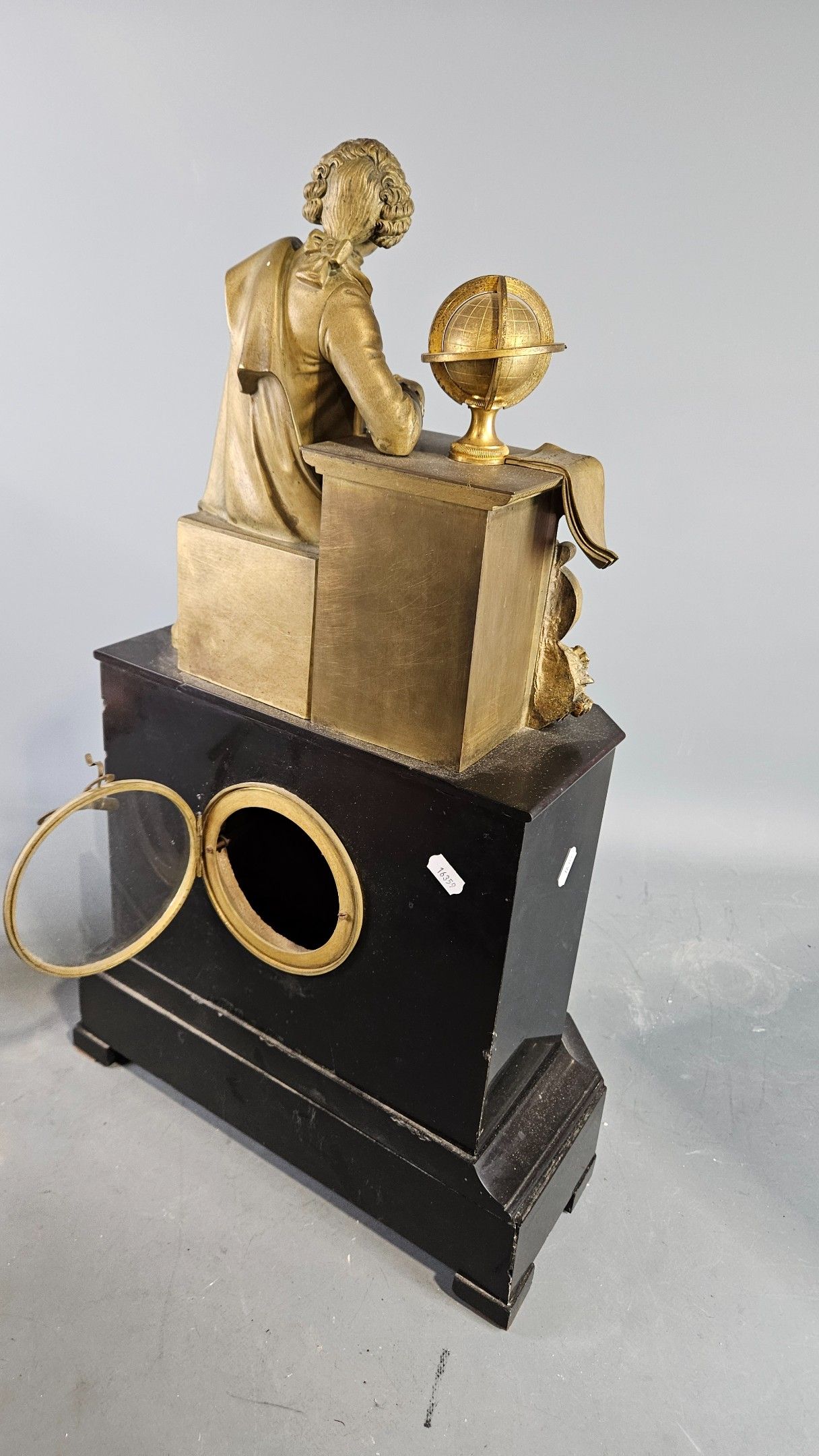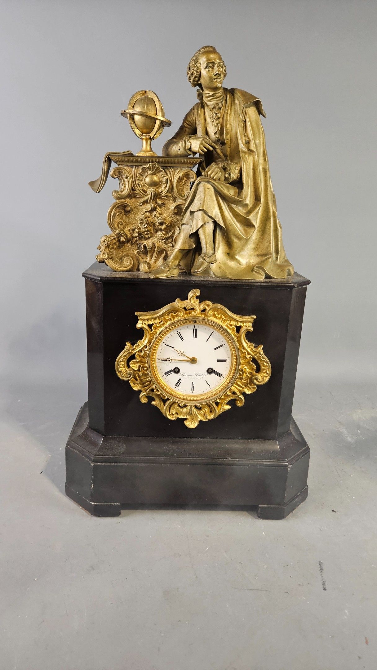 Pendule borne en marbre noir et bronze patiné de la fin du XIXème à décor de la figure de Diderot. Hauteur : 57 cm