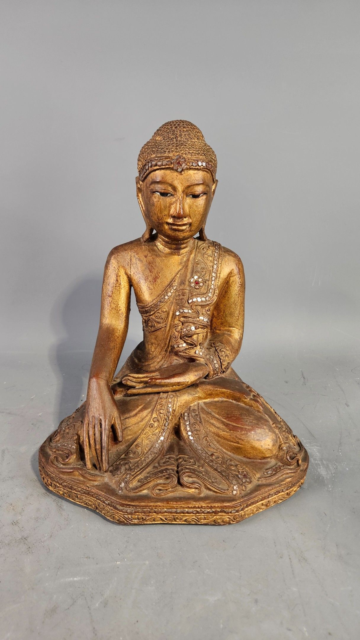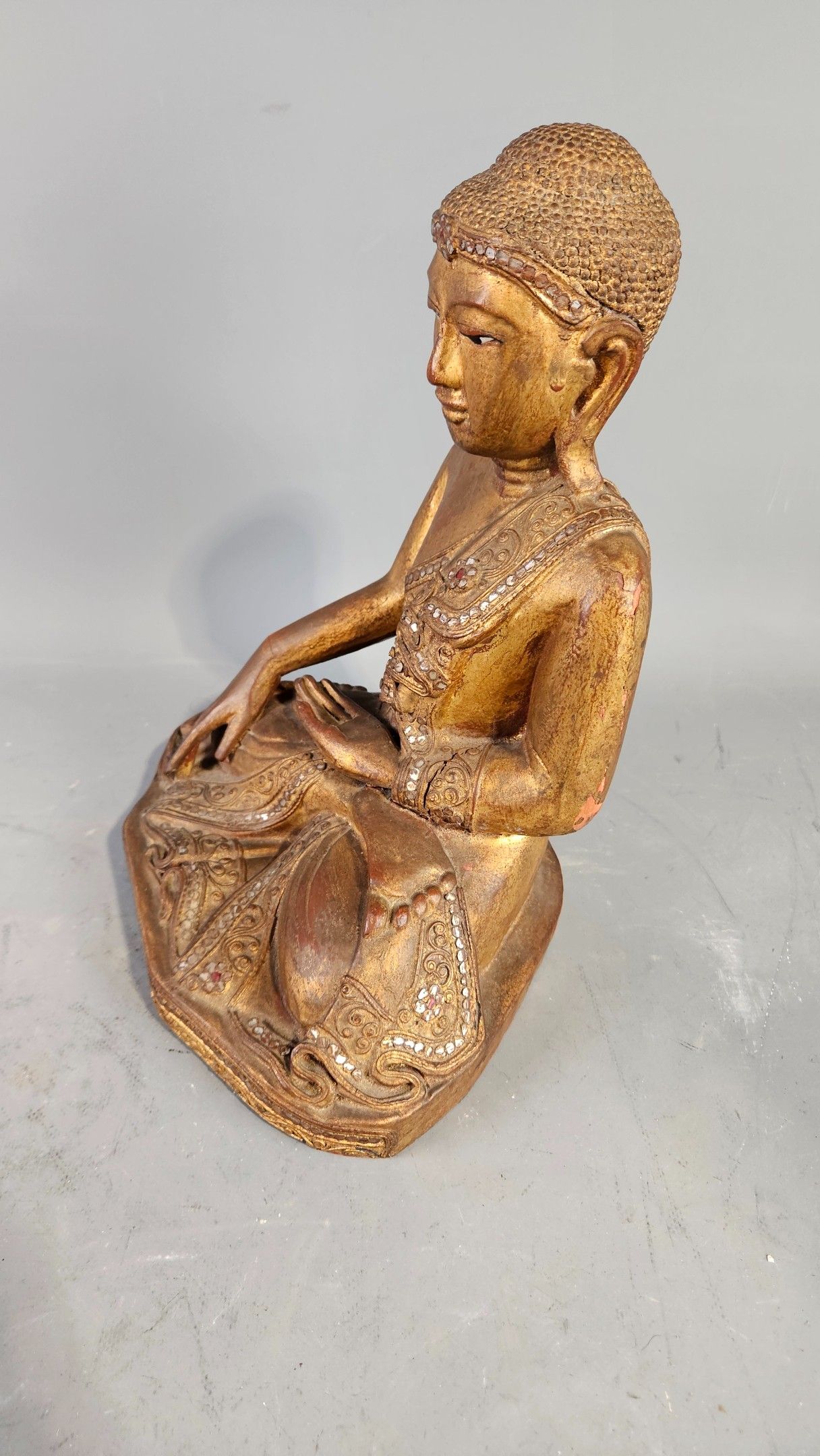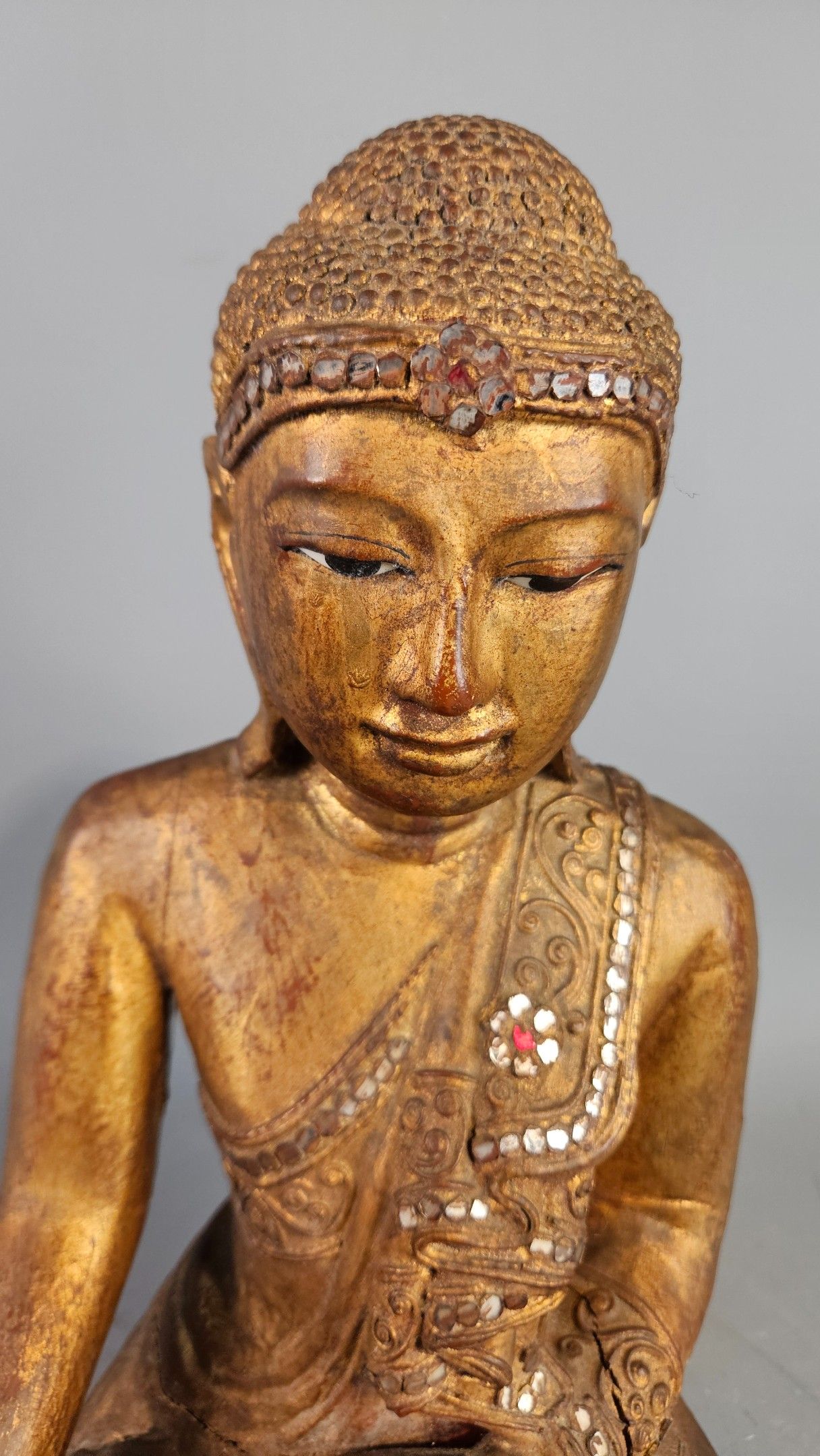 Bouddha de style Thaï en bois doré incrusté de verroterie assis en position de lotus. Hauteur : 32 cm