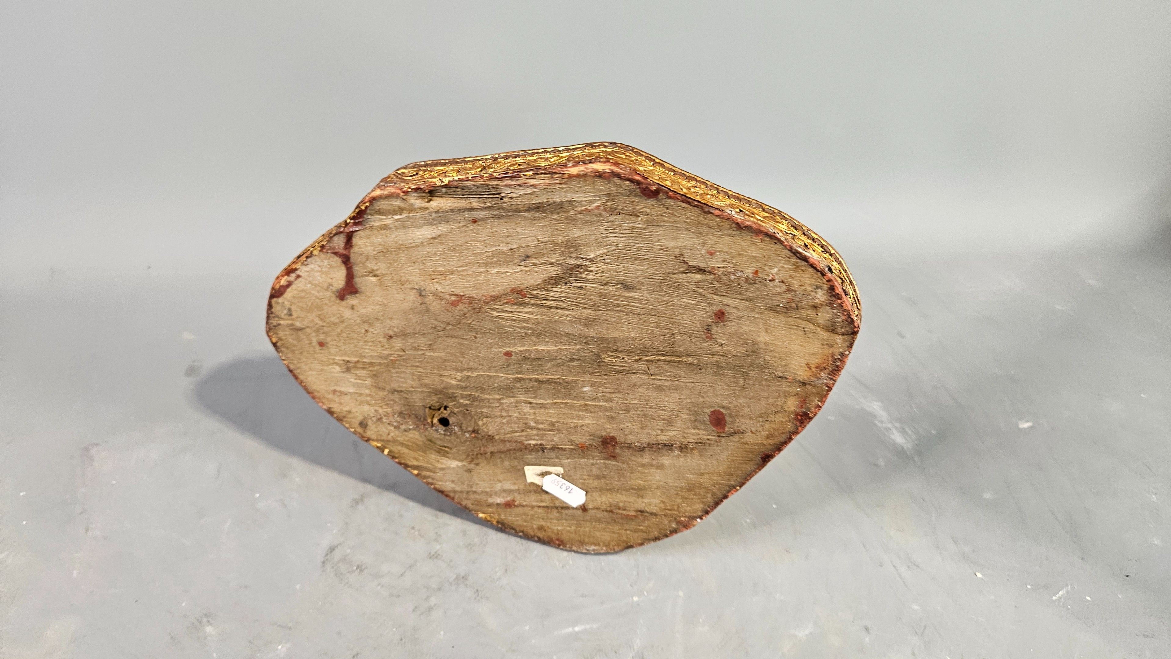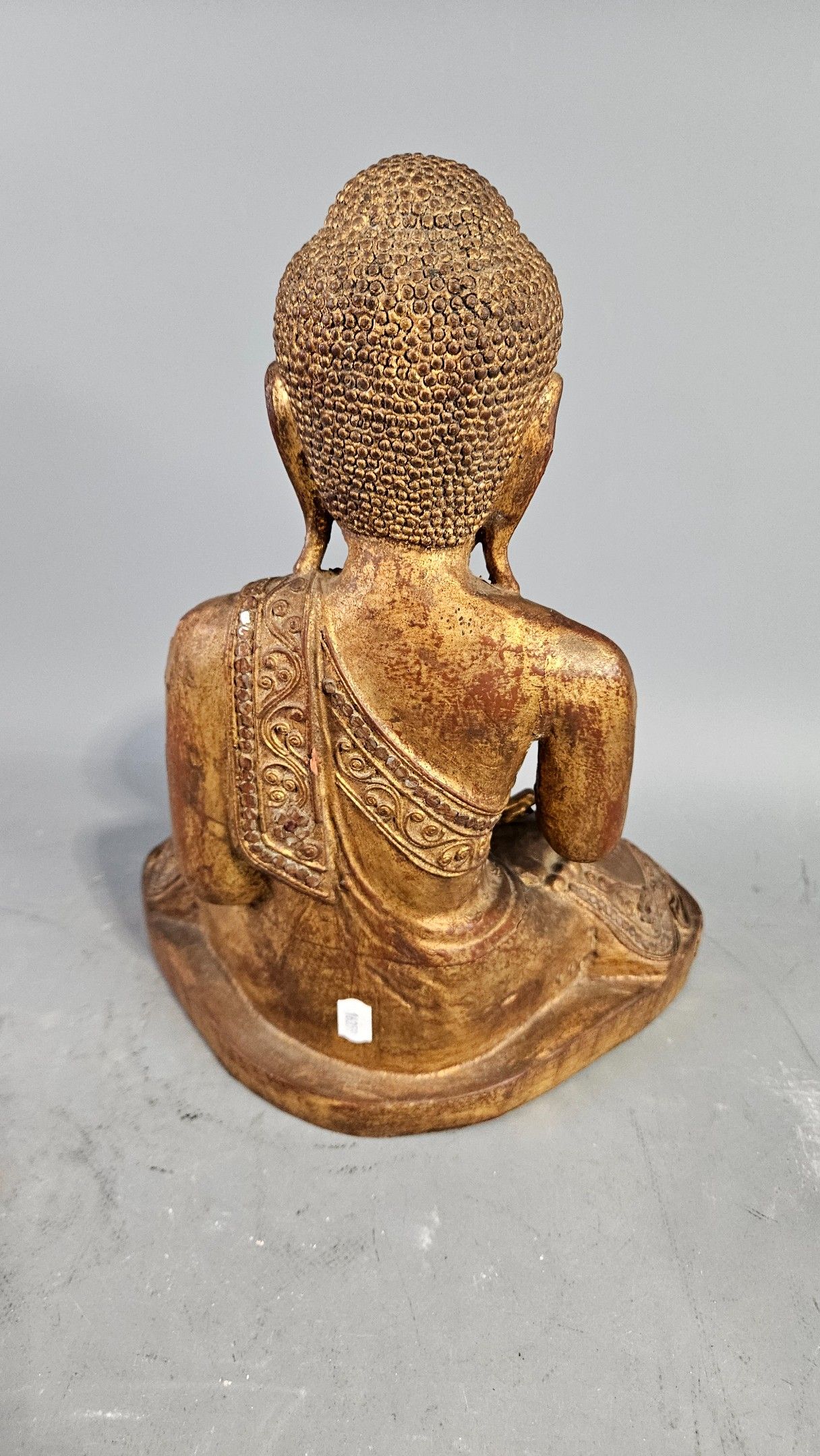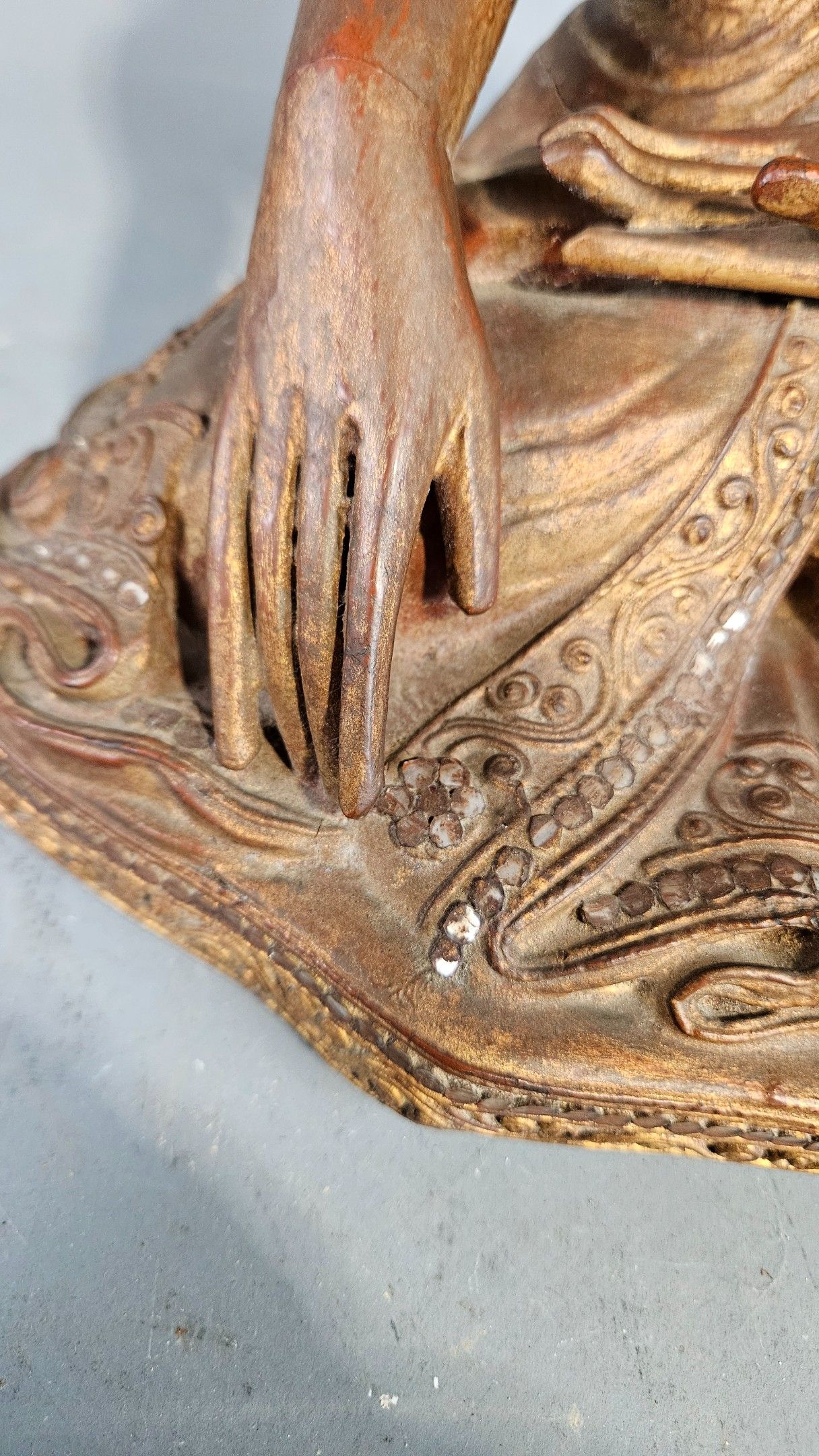 Bouddha de style Thaï en bois doré incrusté de verroterie assis en position de lotus. Hauteur : 32 cm
