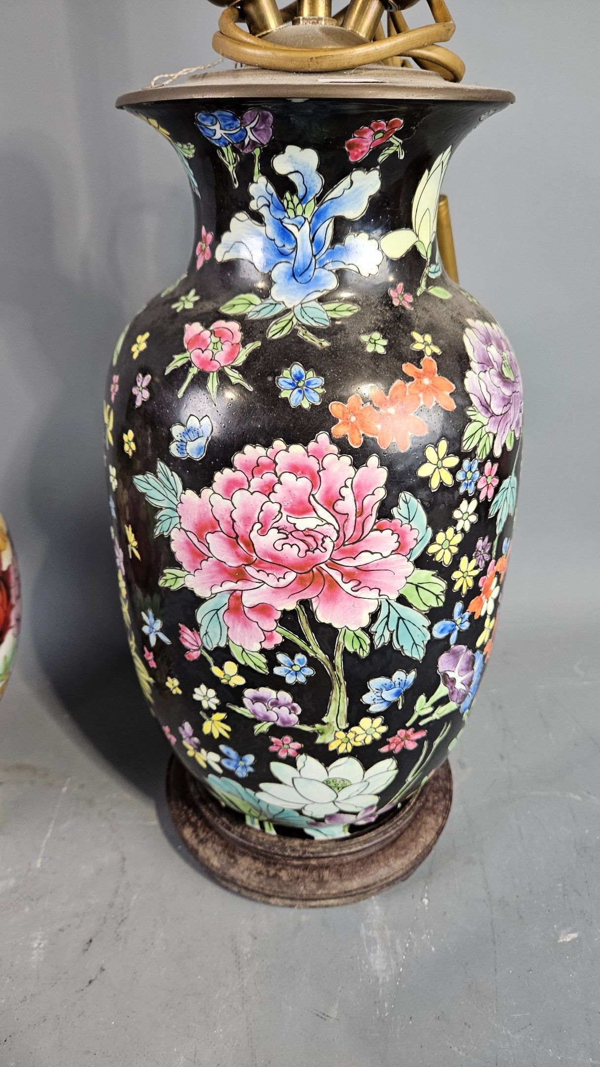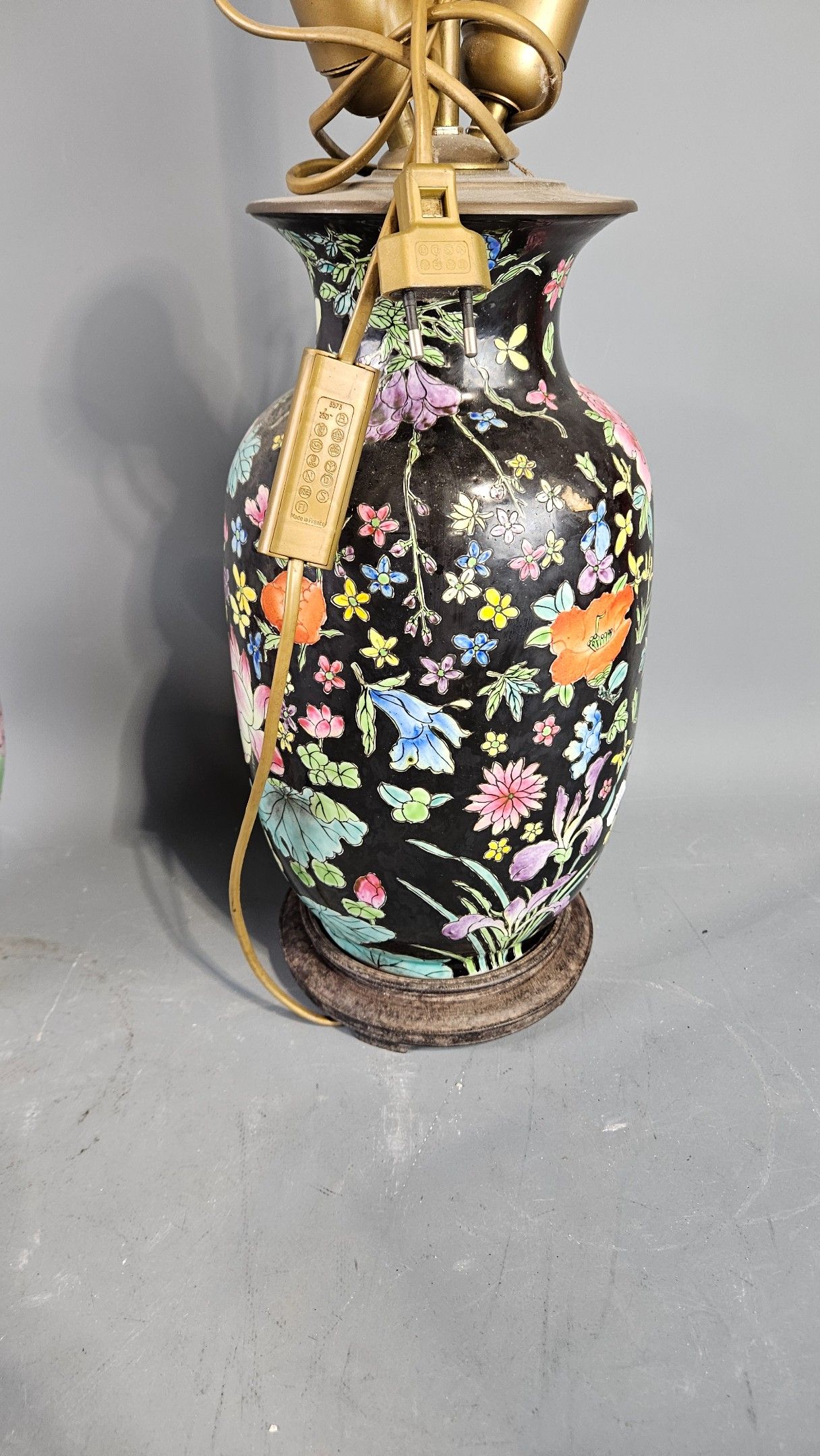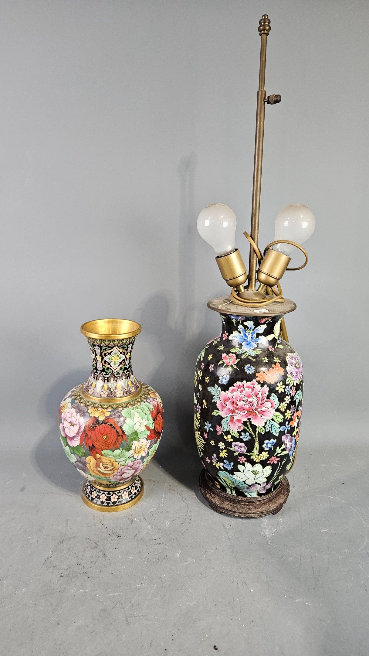 Deux vases polychromes chinois, l’un en bronze cloisonné décor de millefleurs moderne (hauteur : 31,5 cm), le second en porcelaine décor millefleurs sur fond noir électrifié (hauteur : 31,5 cm, percé)