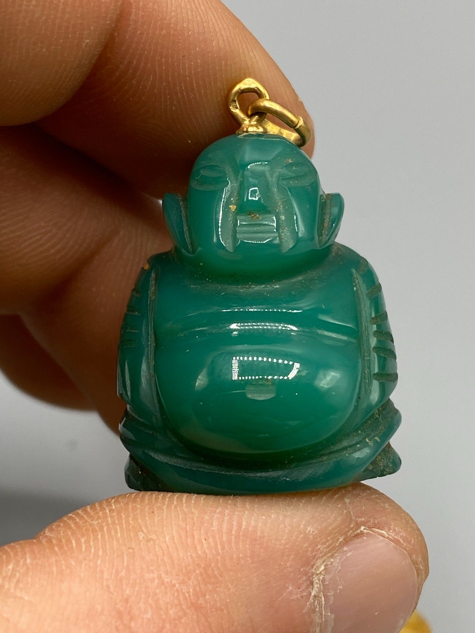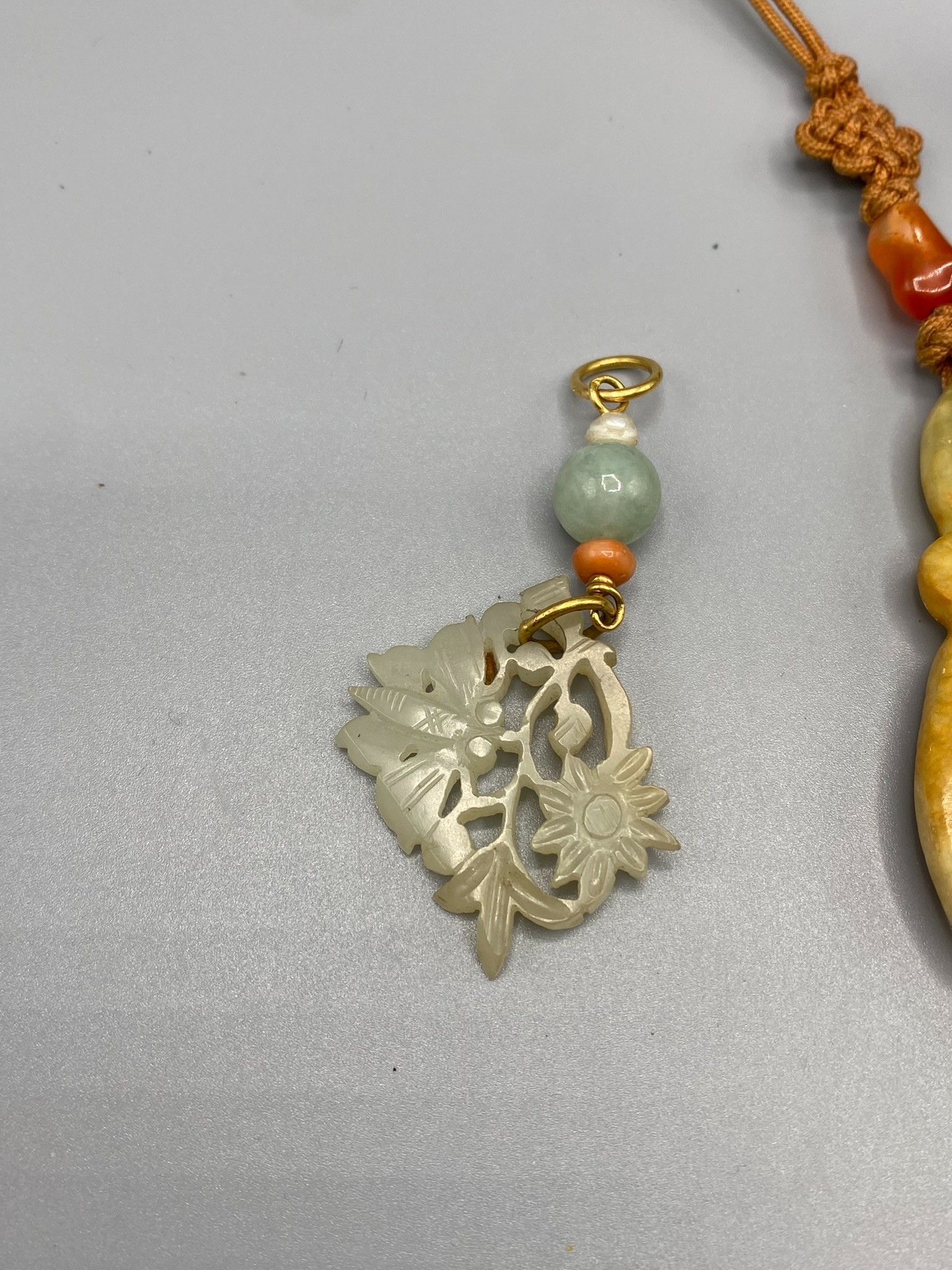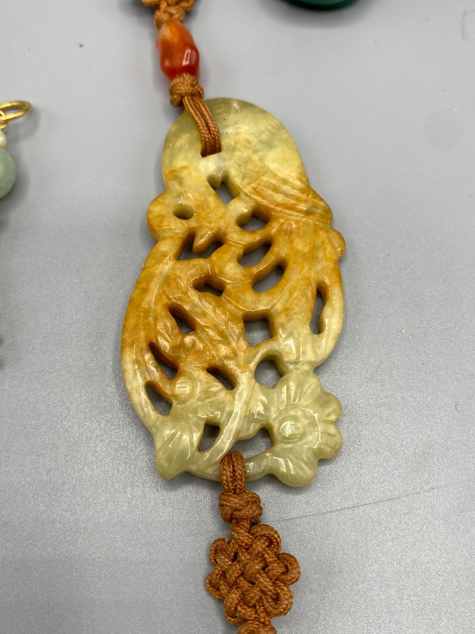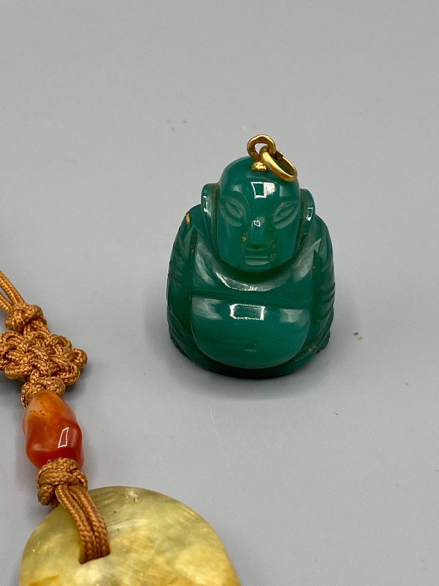 Trois pendentifs en pierres fines asiatiques gravées et polies, dont deux avec anneaux d'accroche en or (puttaï vert et plaquette papillon). En règle